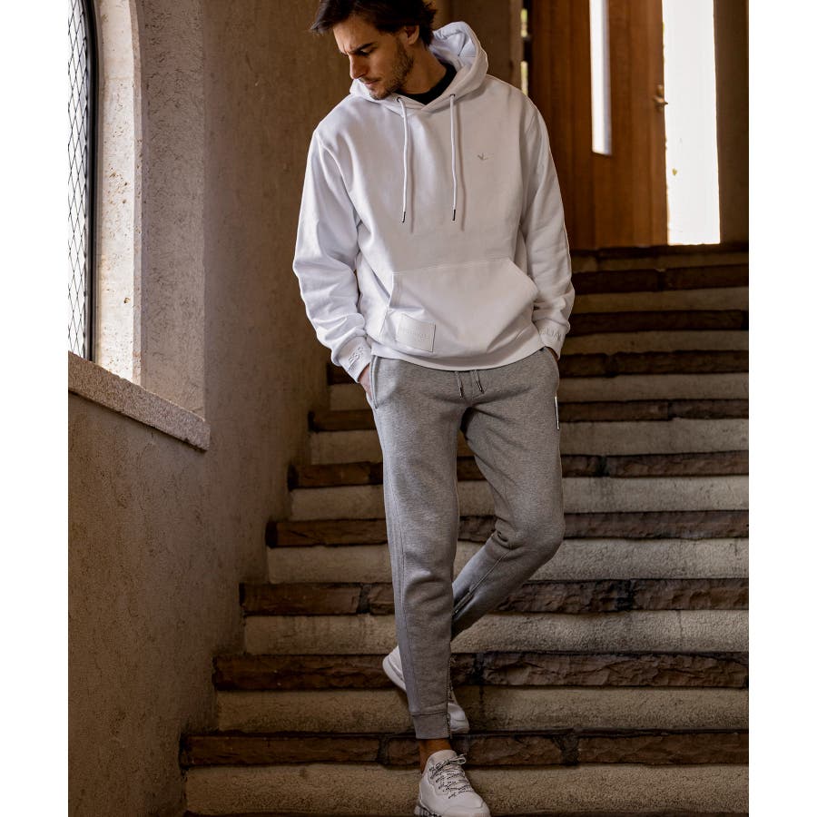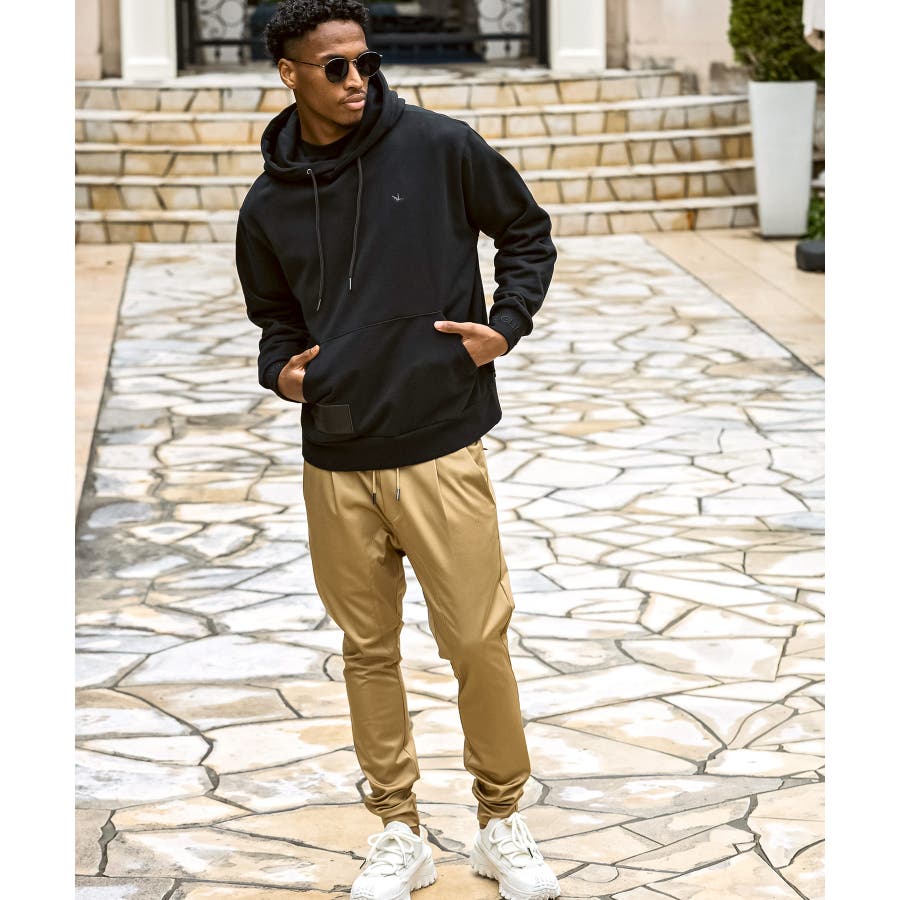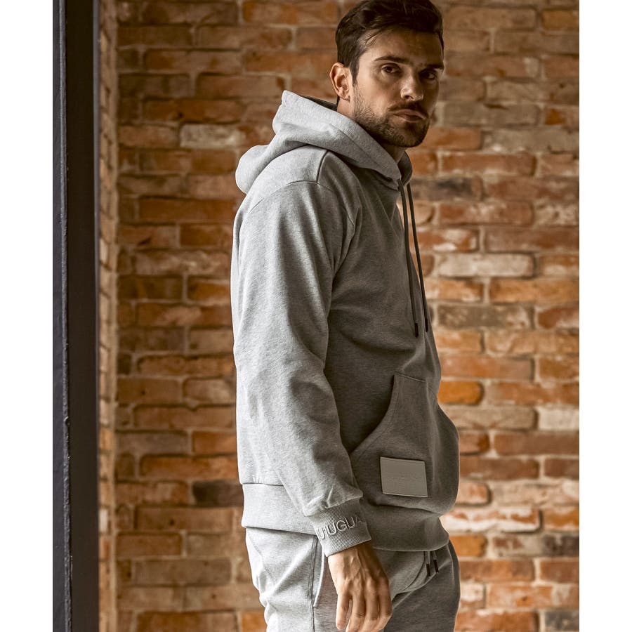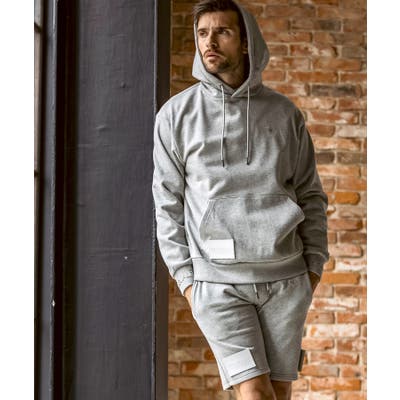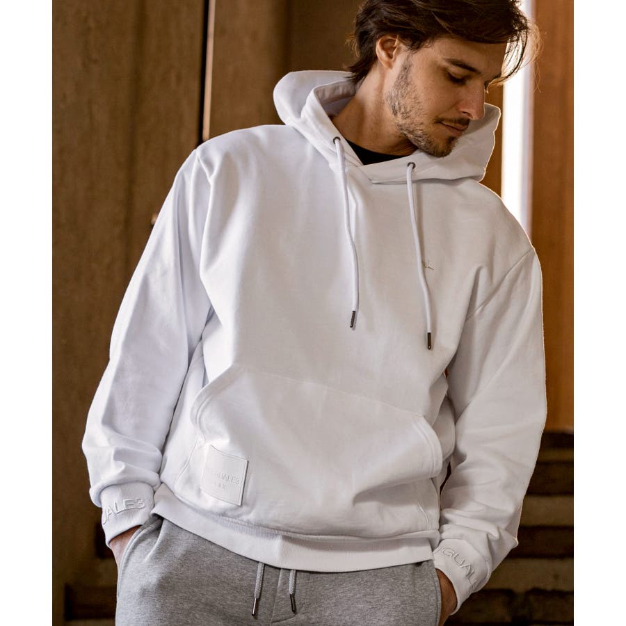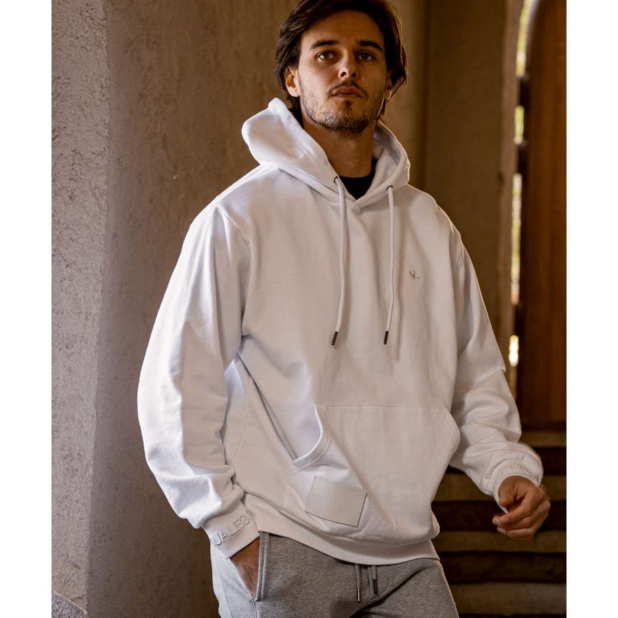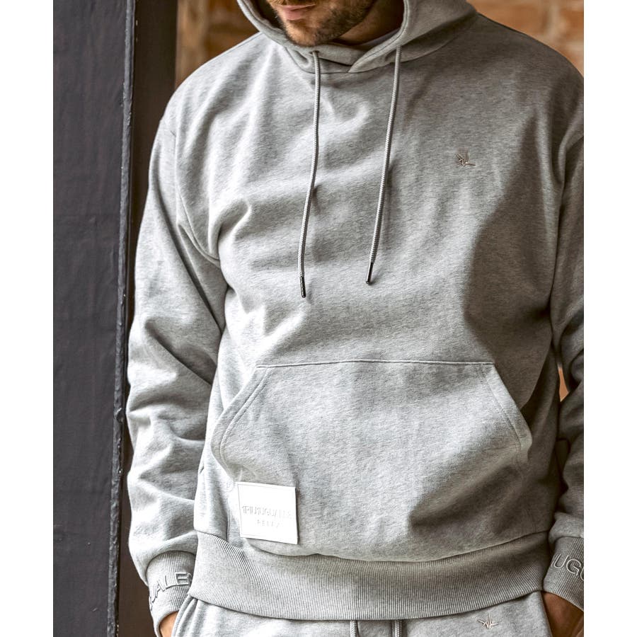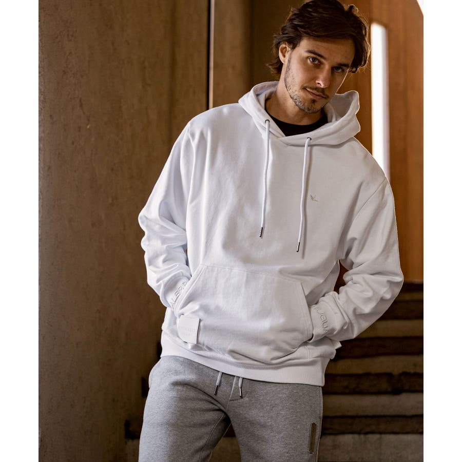 フェイクレザーに箔押しでブランドロゴを刻んだオリジナルのパッチがアクセントのプルフーディー。