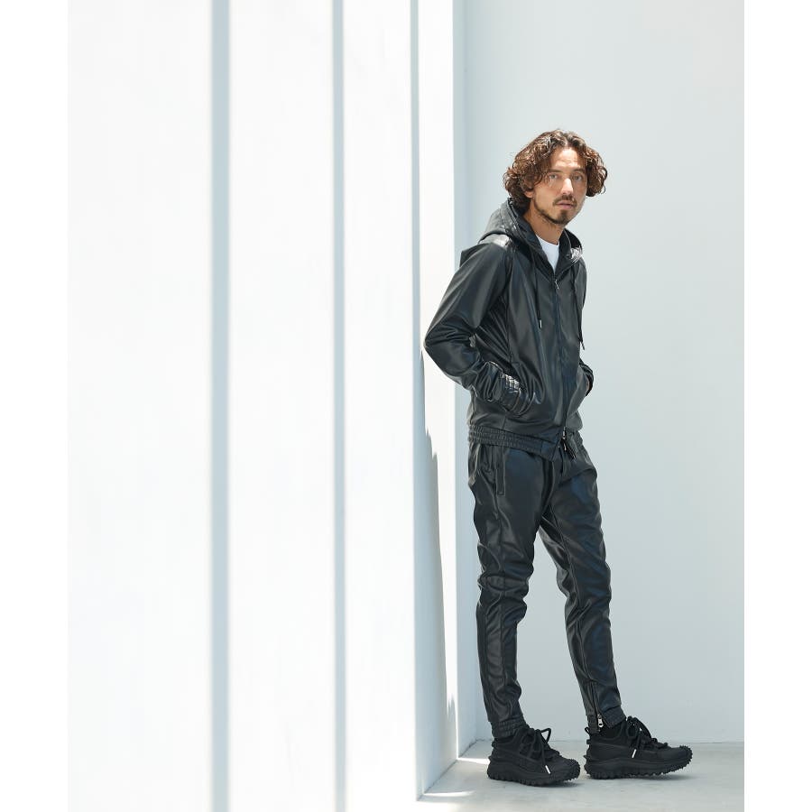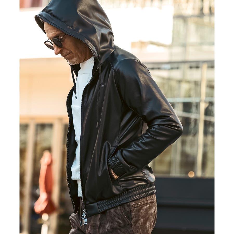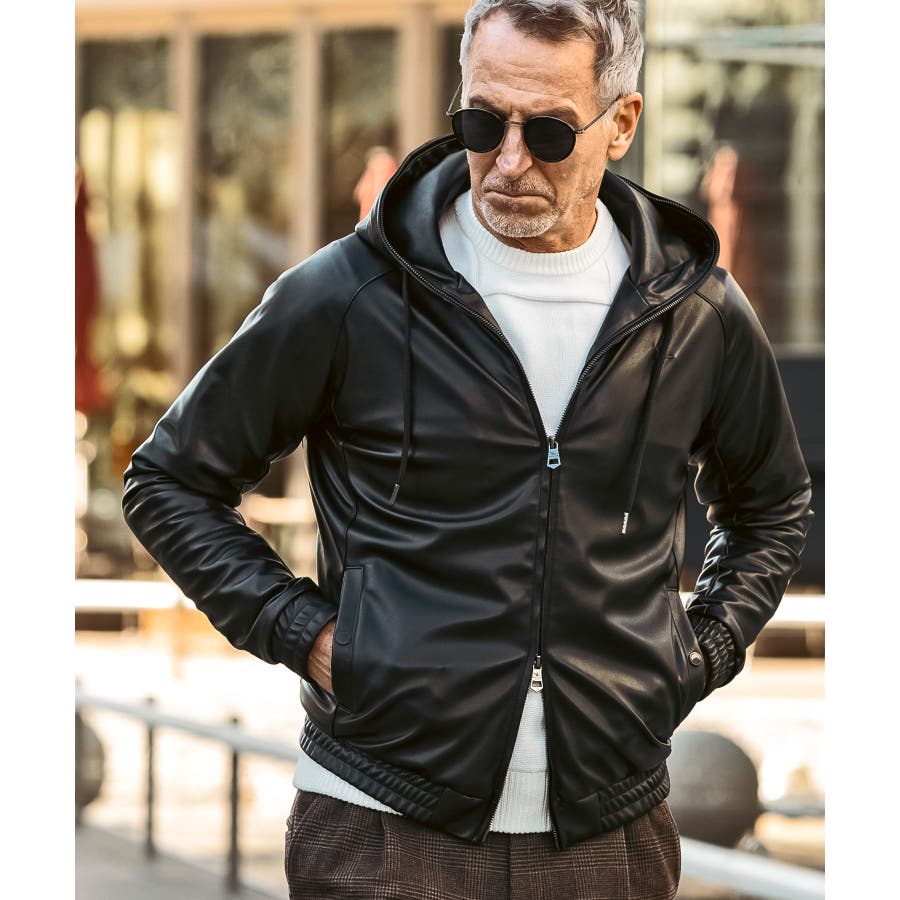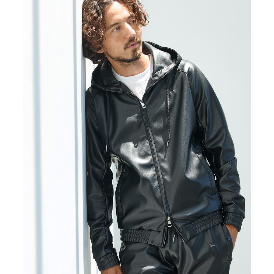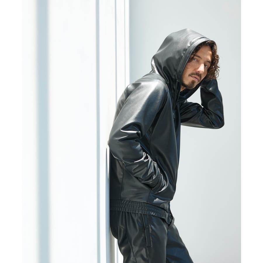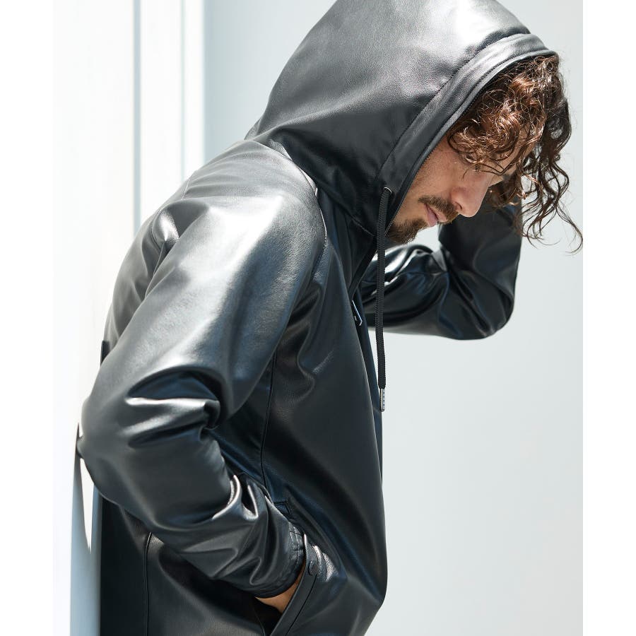 滑らかな艶感が上品なフェイクレザーを採用したジップアップパーカー。
