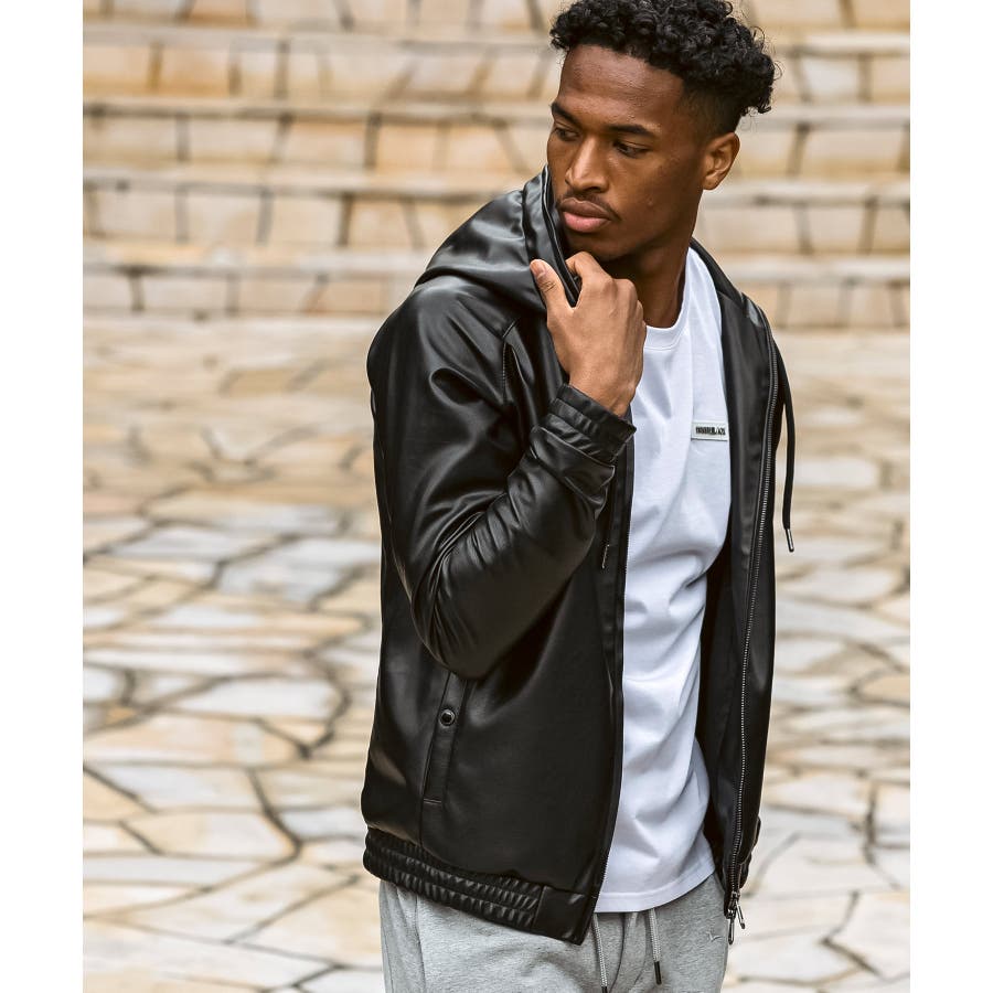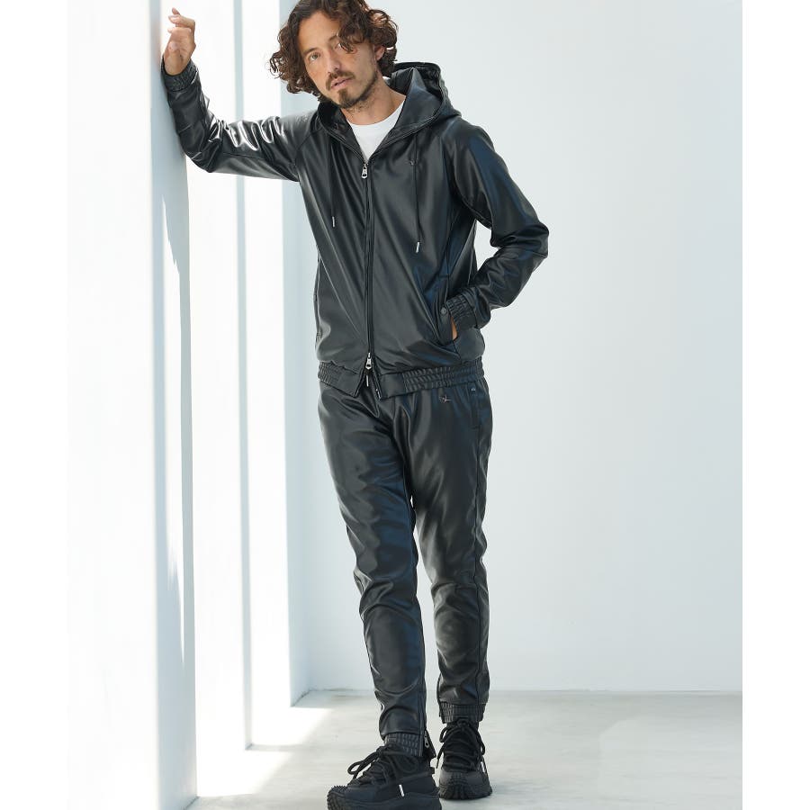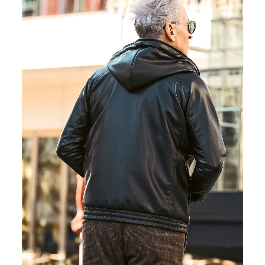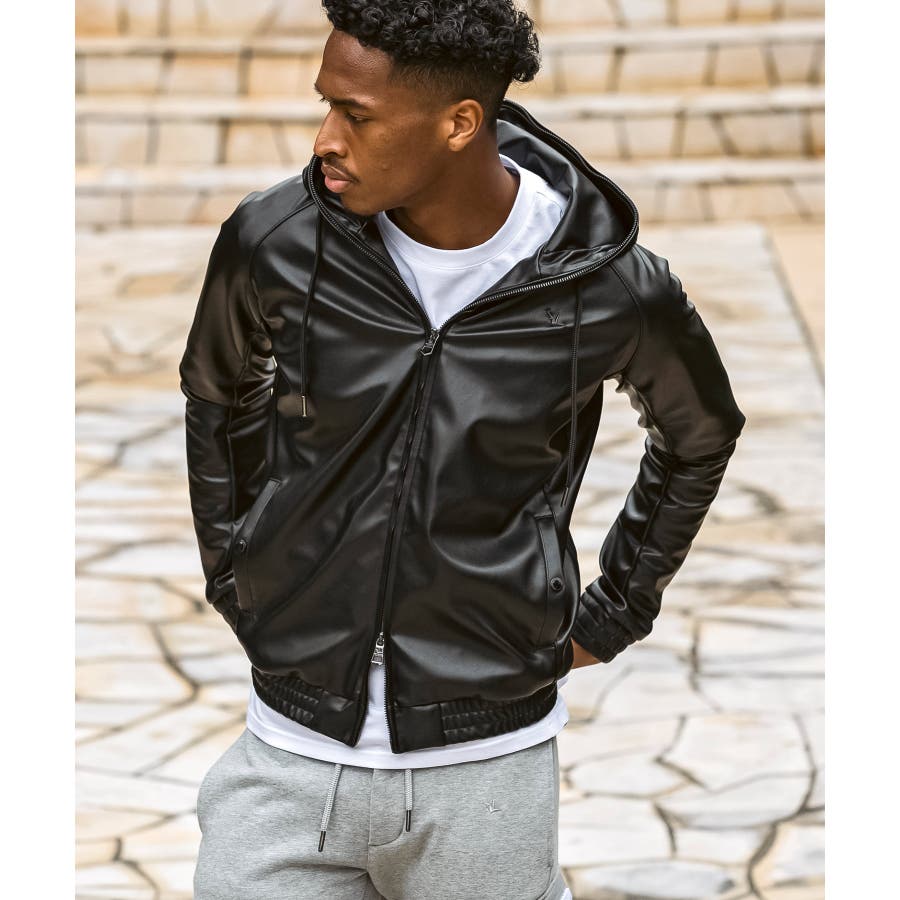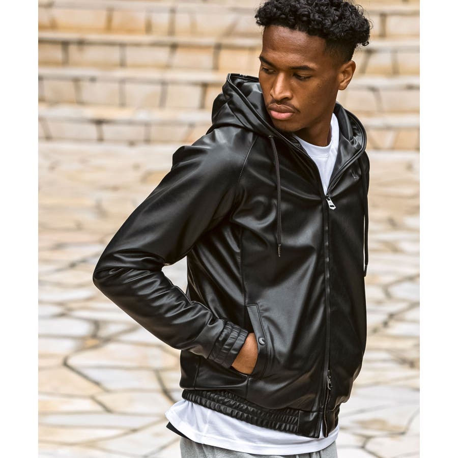 滑らかな艶感が上品なフェイクレザーを採用したジップアップパーカー。