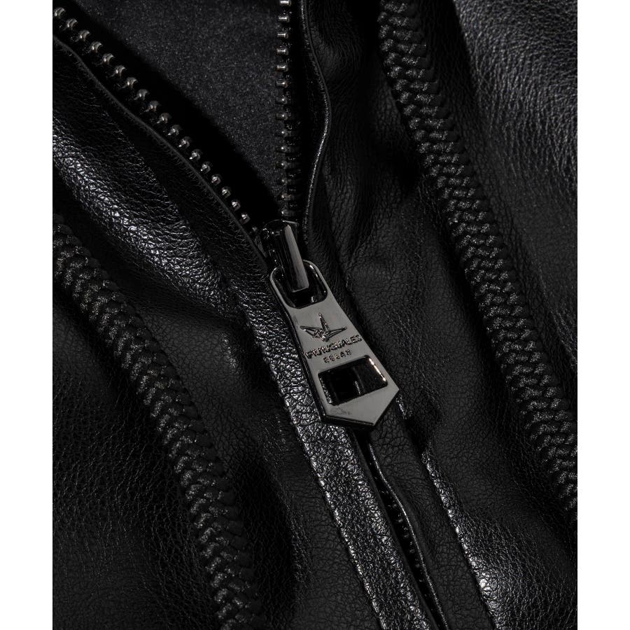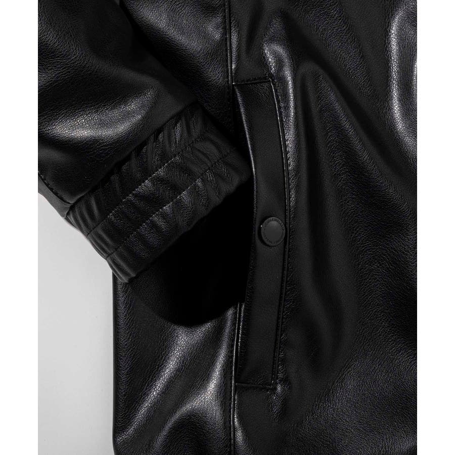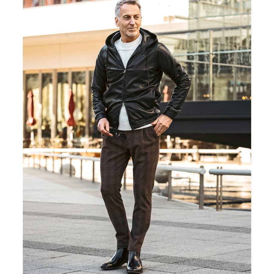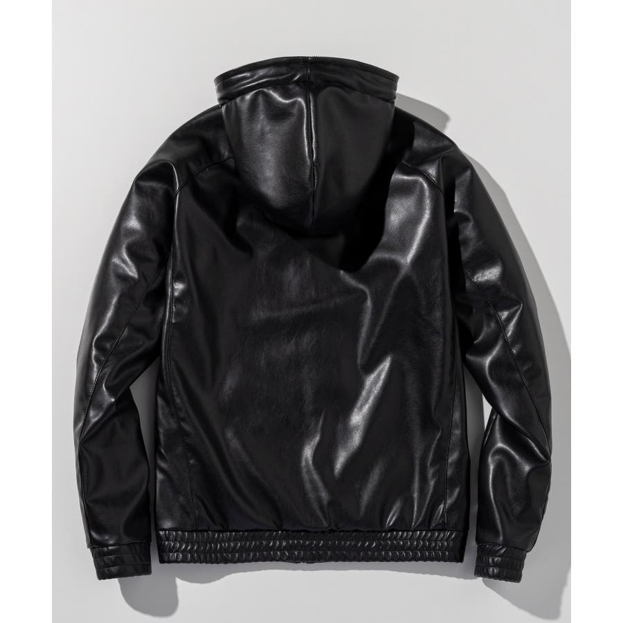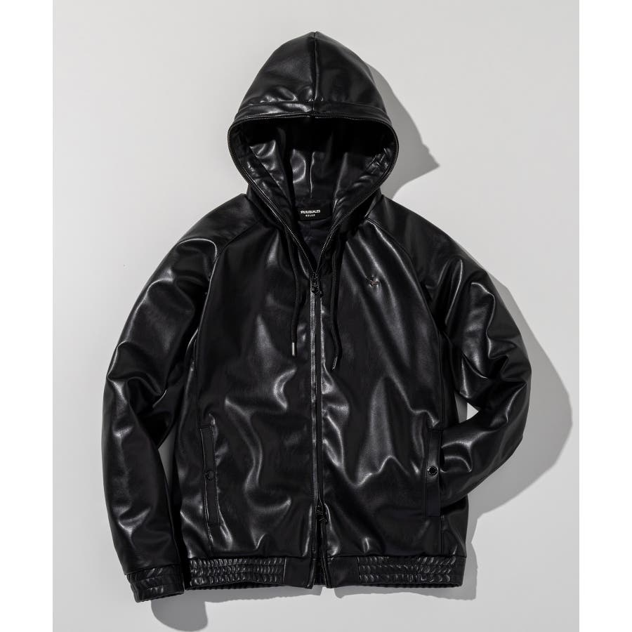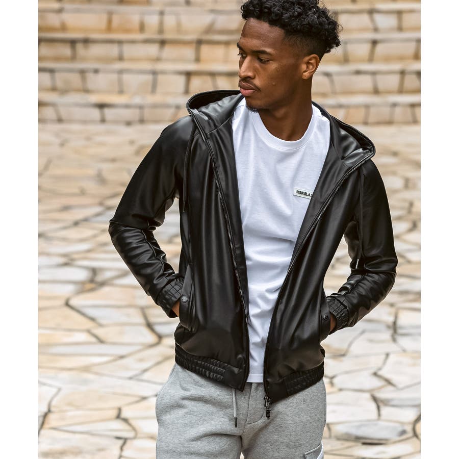 滑らかな艶感が上品なフェイクレザーを採用したジップアップパーカー。
