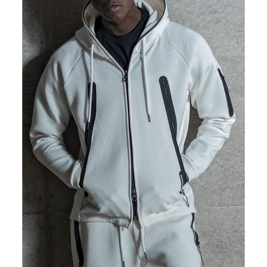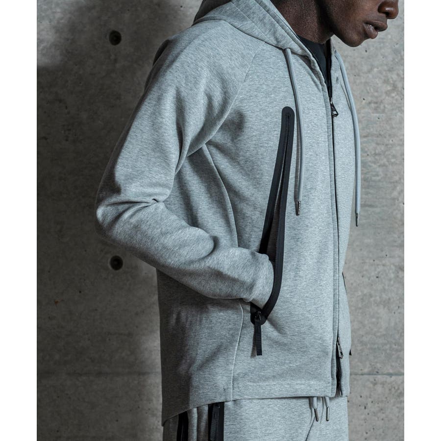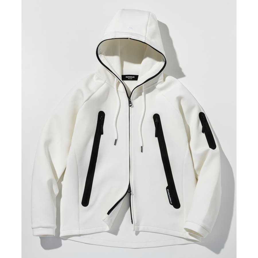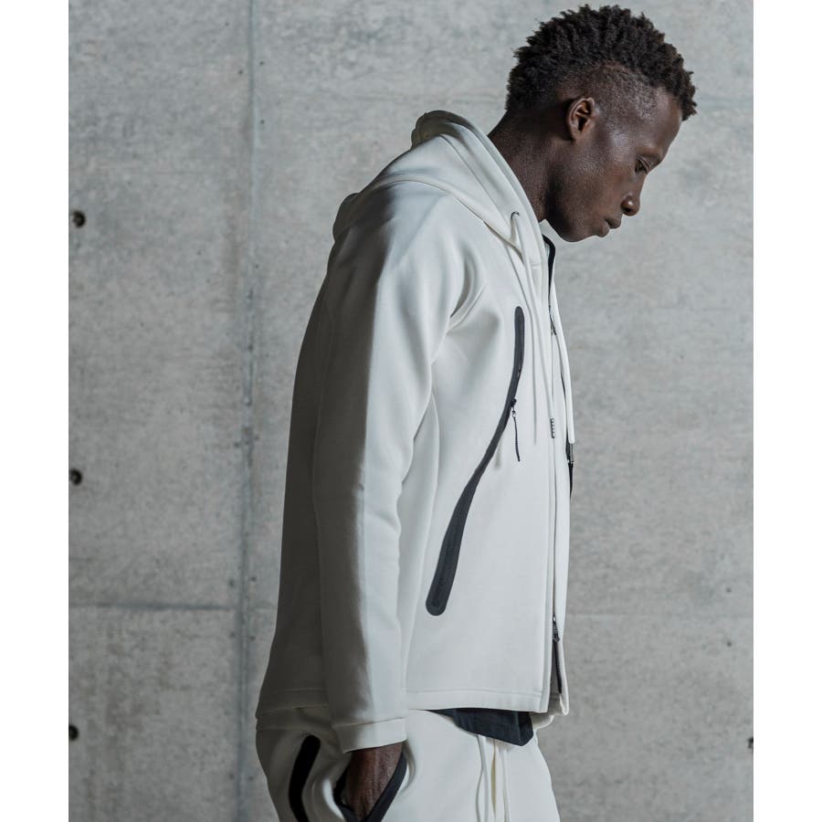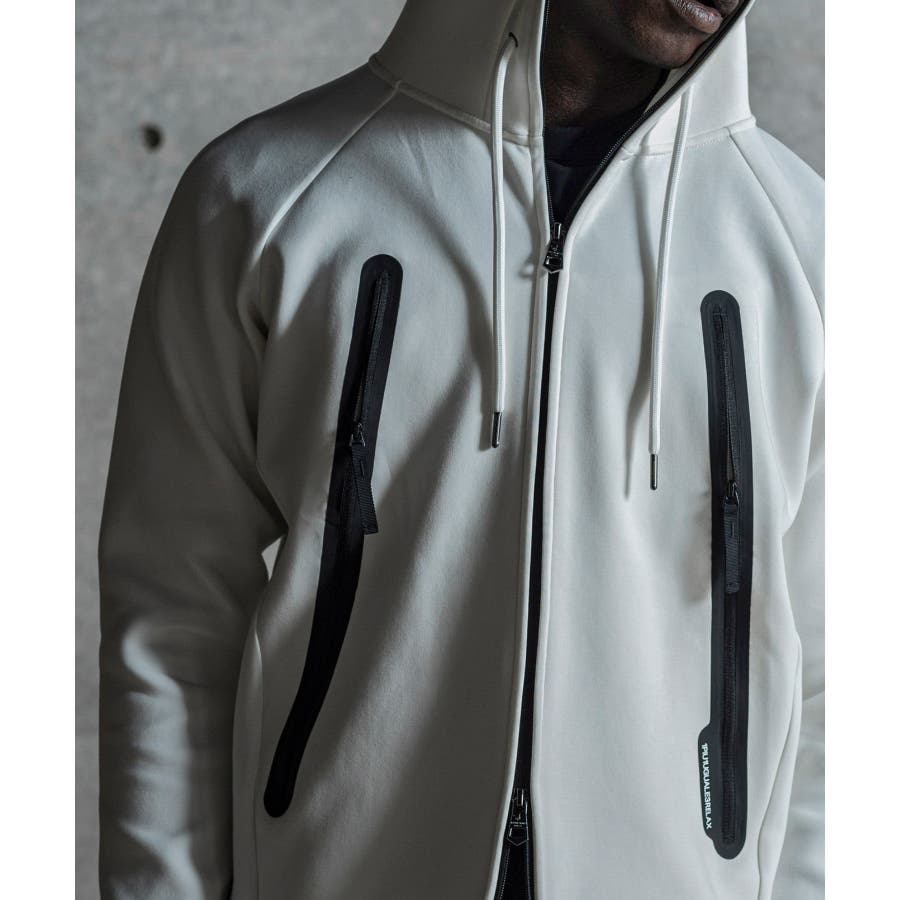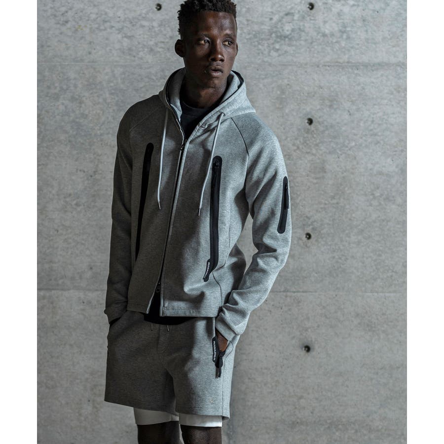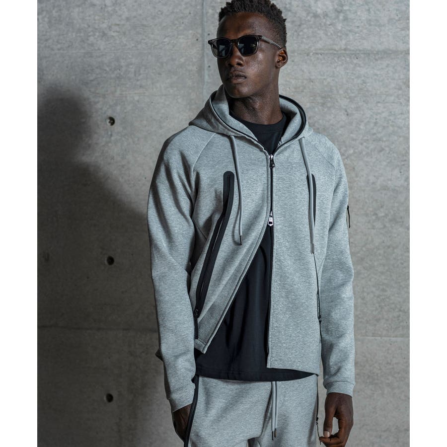 フロントに走る大胆なファスナーポケットがシャープな表情のジップアップパーカー。
