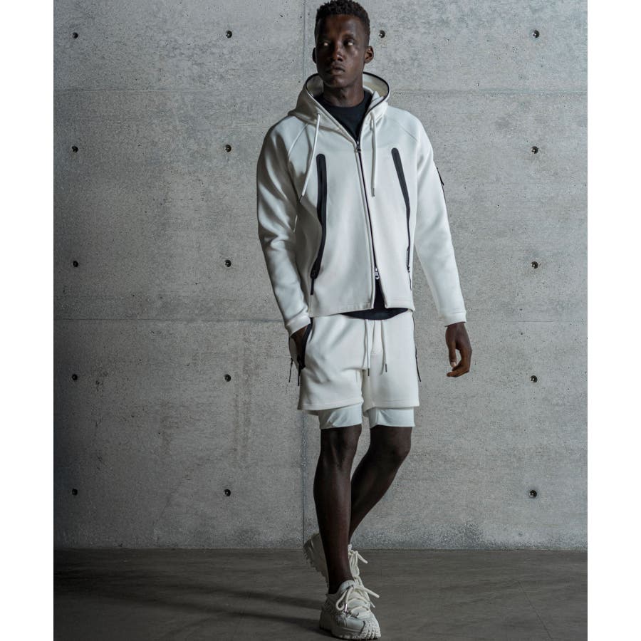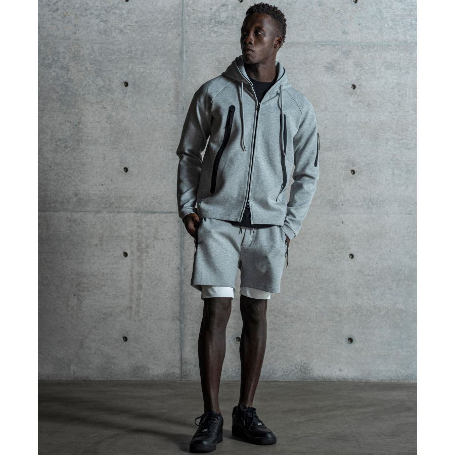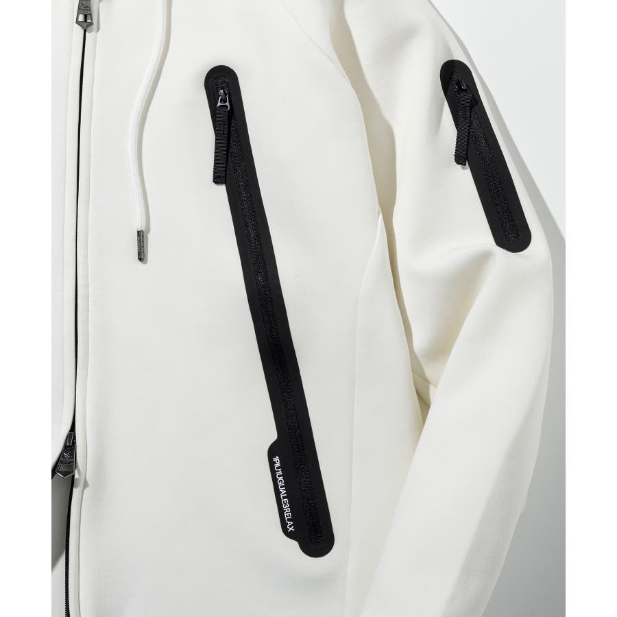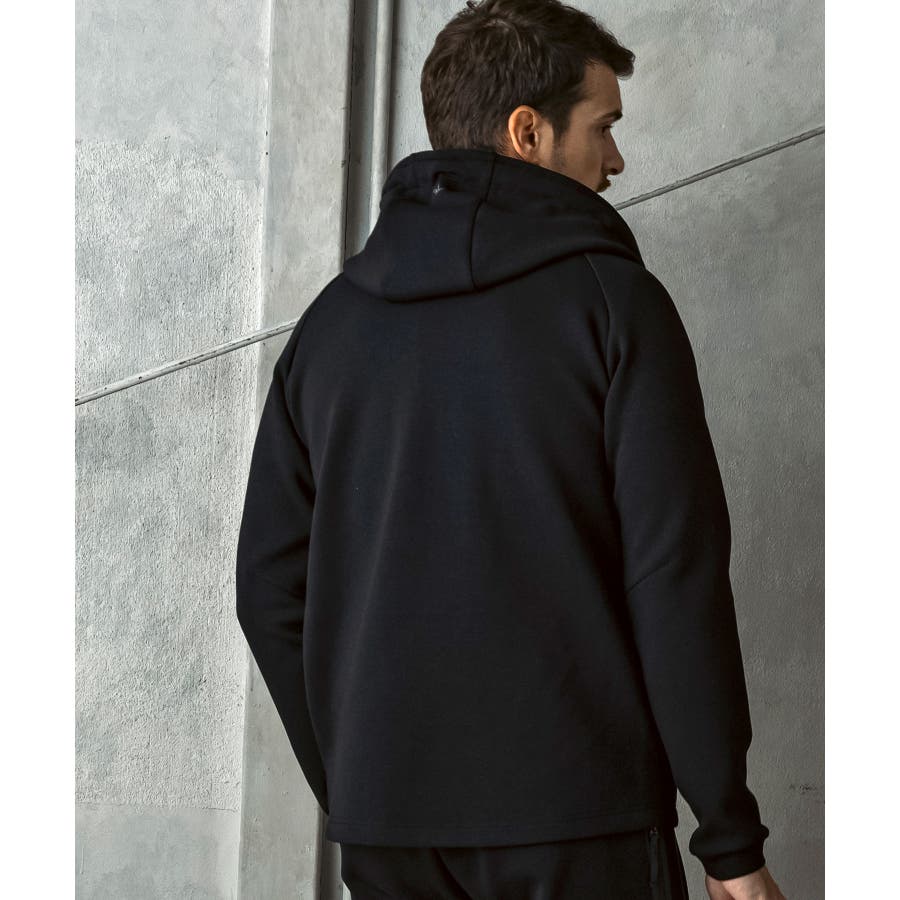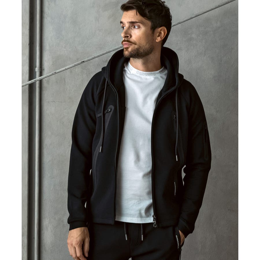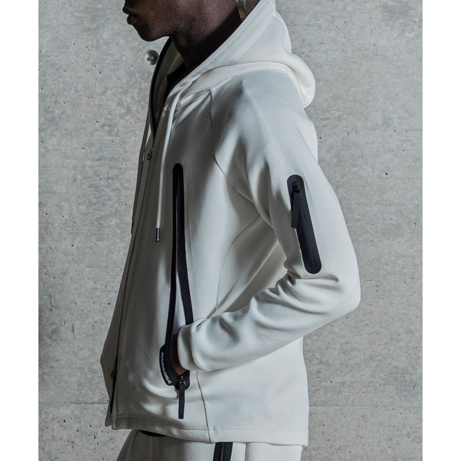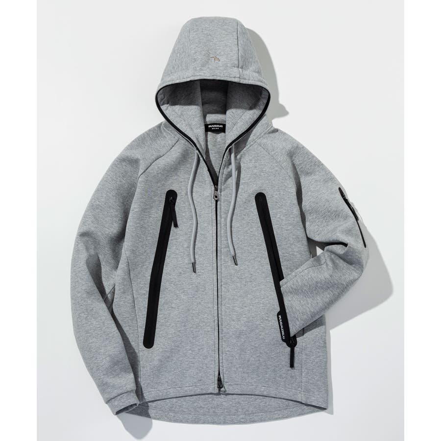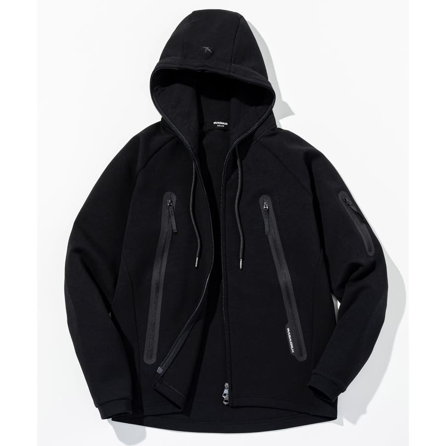 フロントに走る大胆なファスナーポケットがシャープな表情のジップアップパーカー。