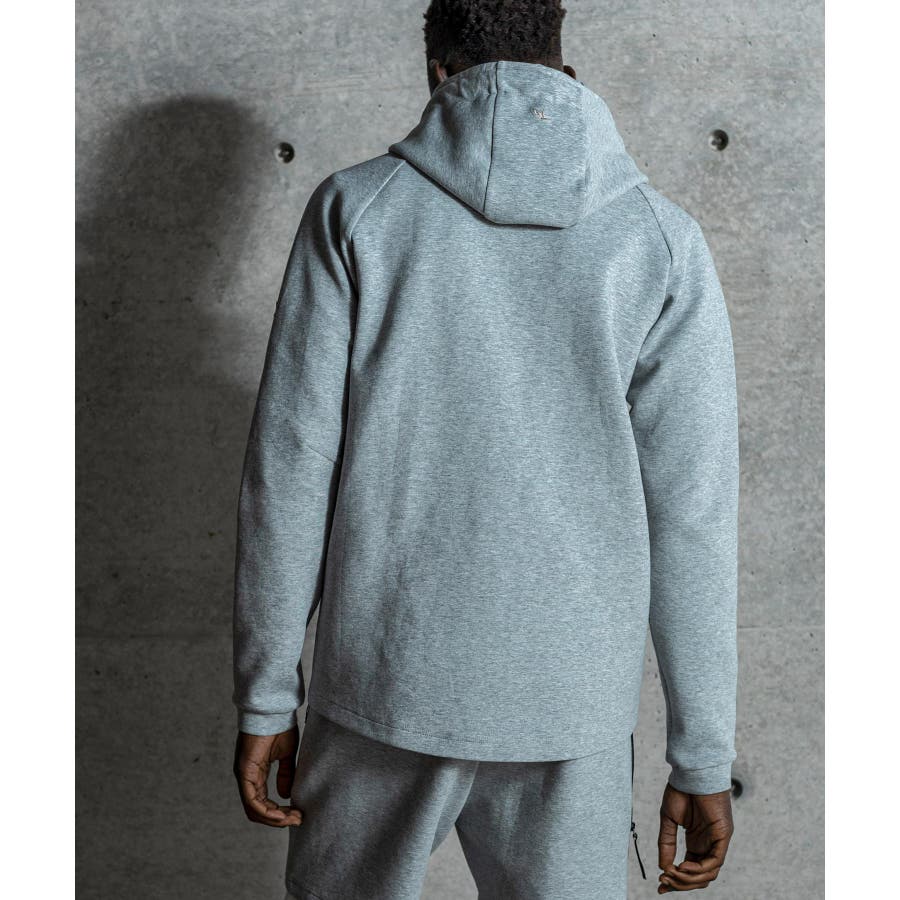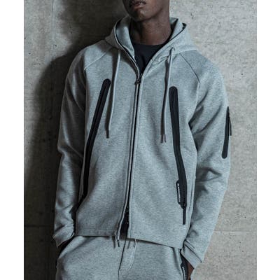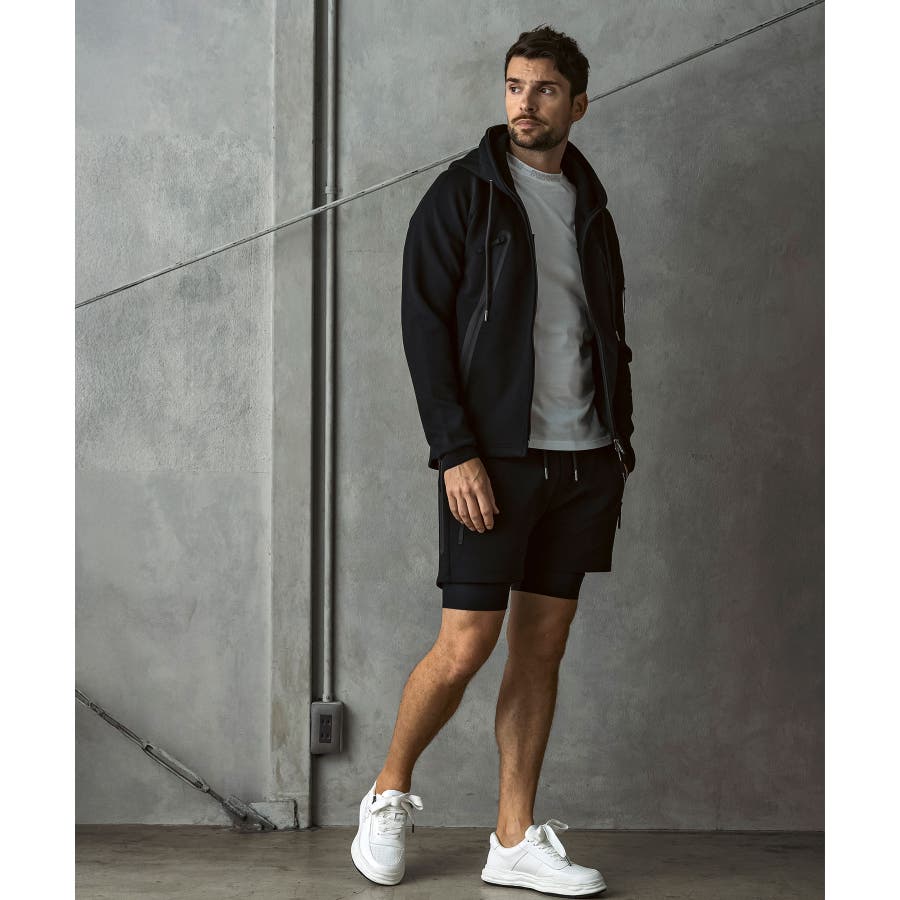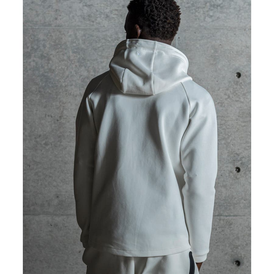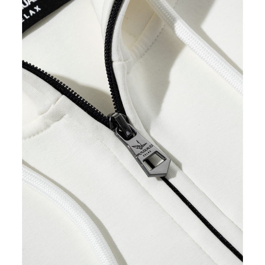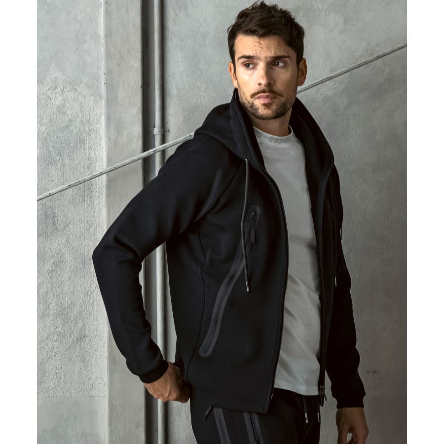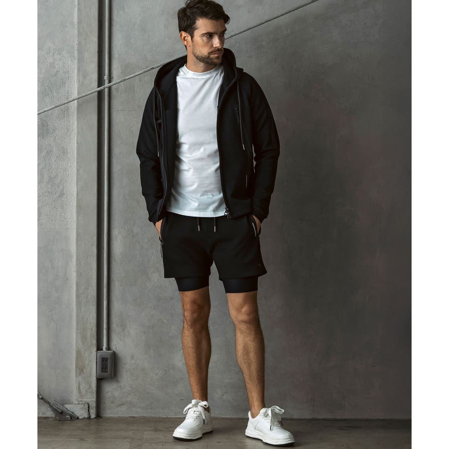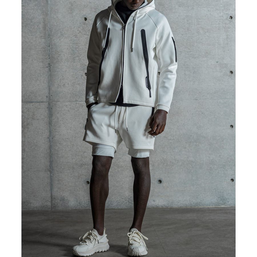 フロントに走る大胆なファスナーポケットがシャープな表情のジップアップパーカー。