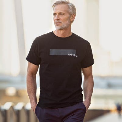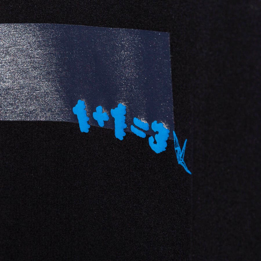 光沢のあるラバー素材を使用した同色のボックスプリントがポイントのクルーネックTシャツ。