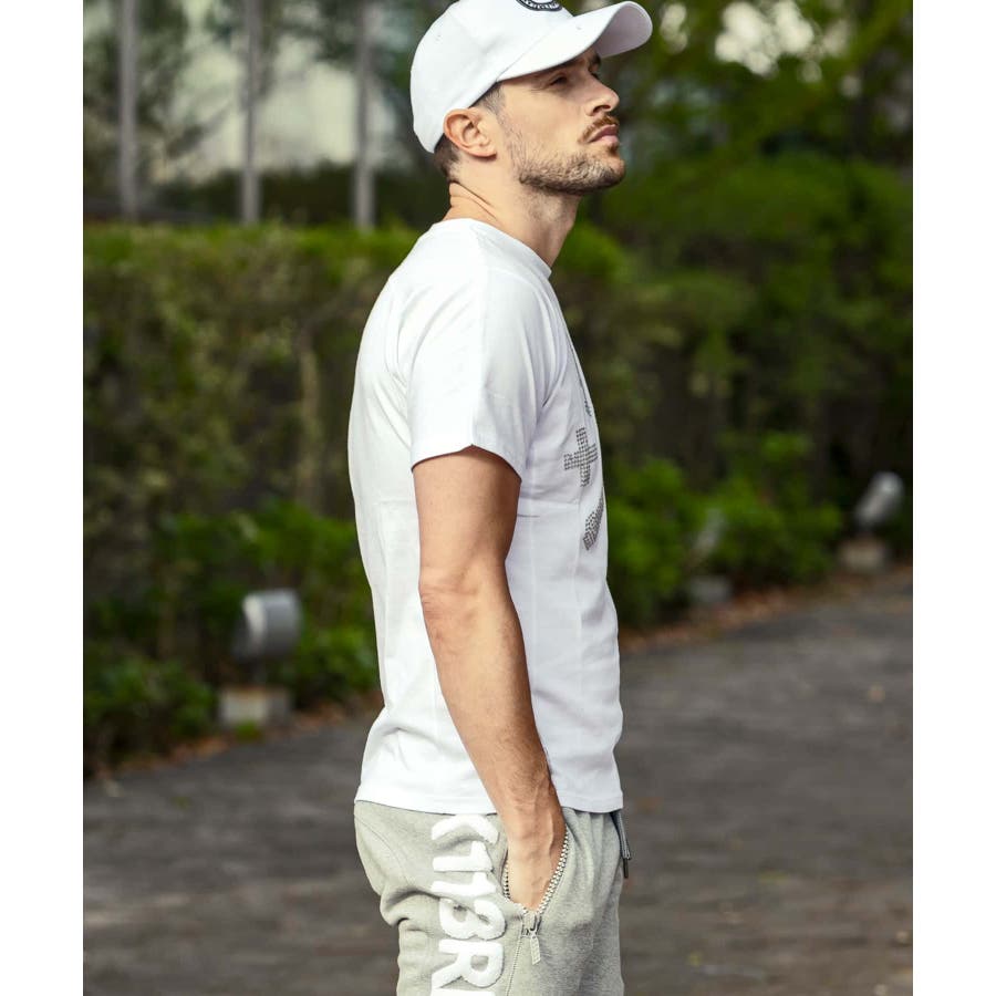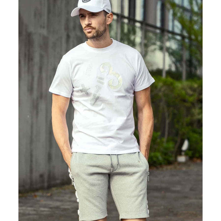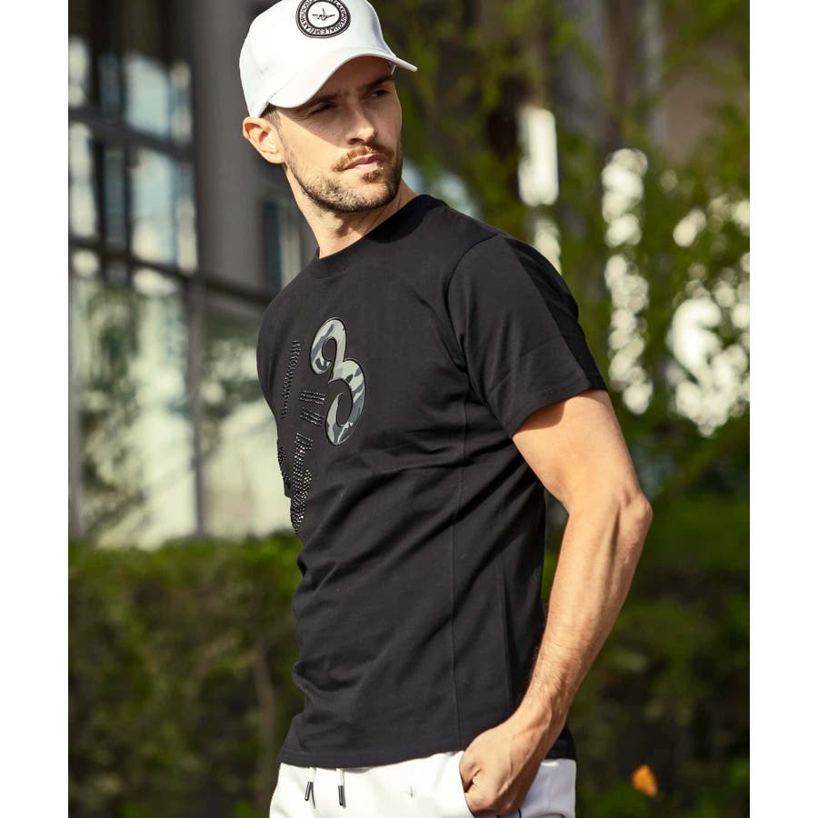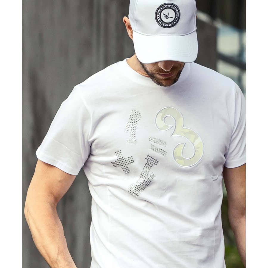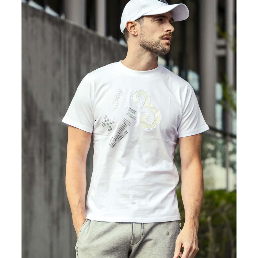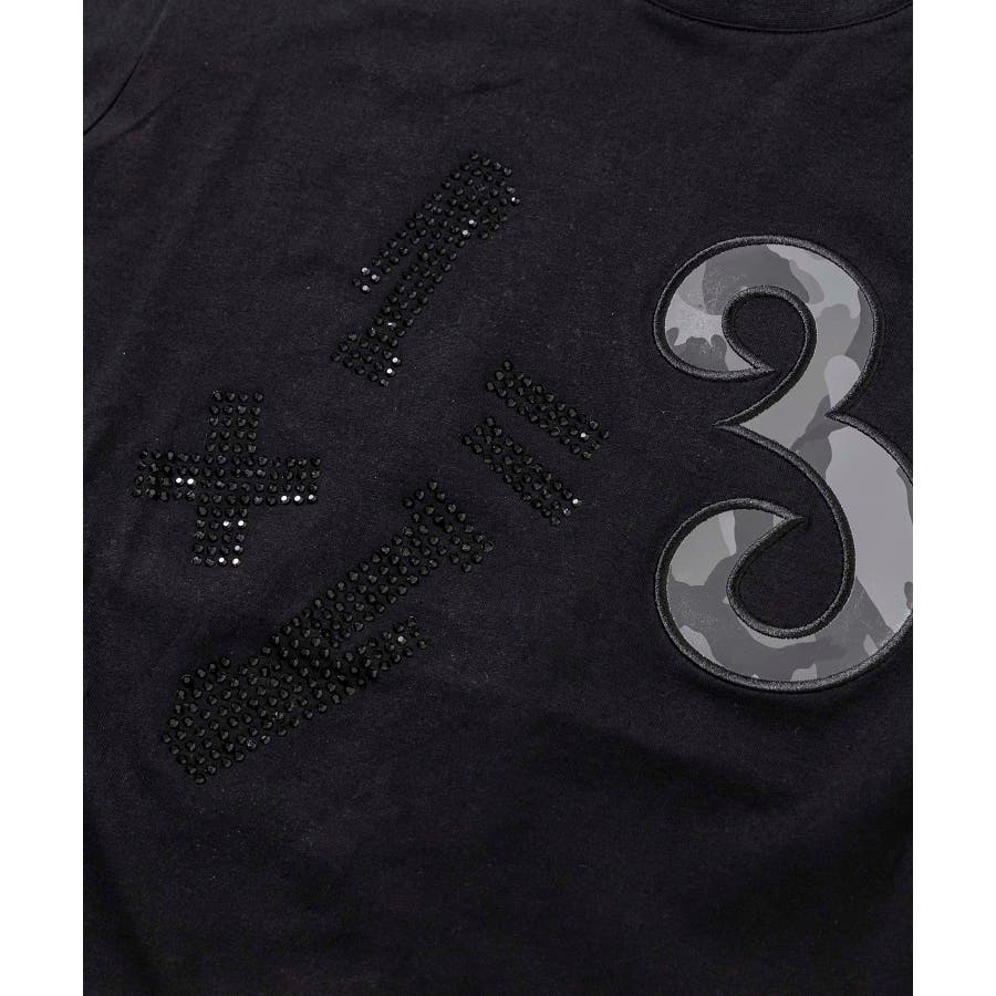 ブランド名の意を持つ「1+1=3」を配した半袖Tシャツ。