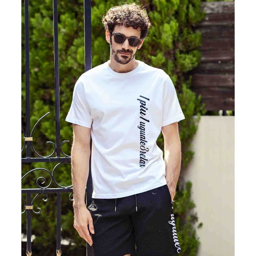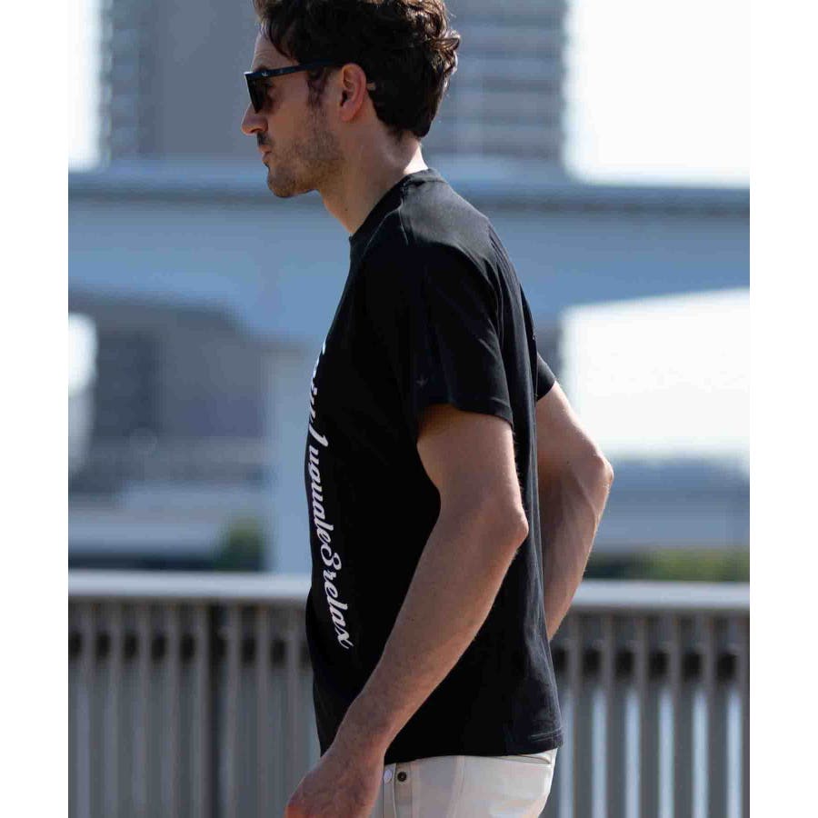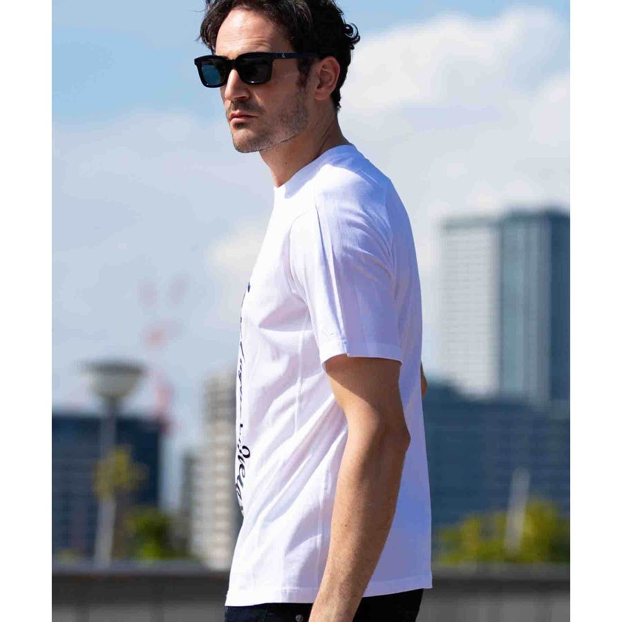 人気の筆記体ロゴを大胆に縦使いした半袖Tシャツ。
