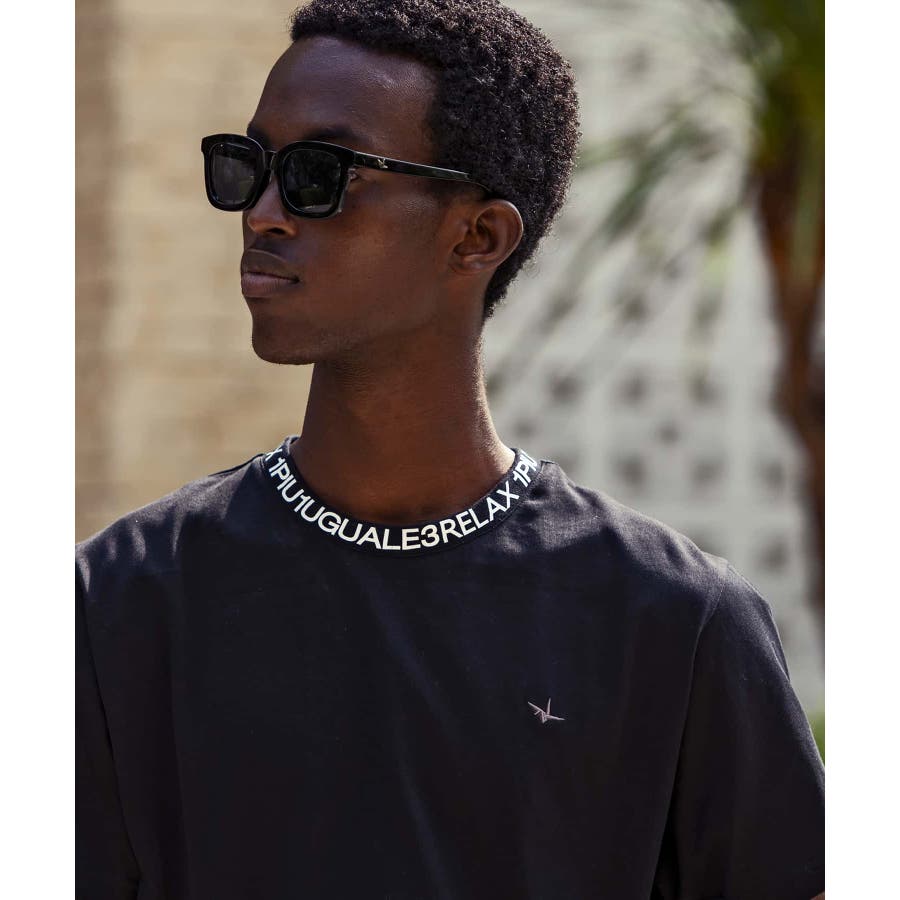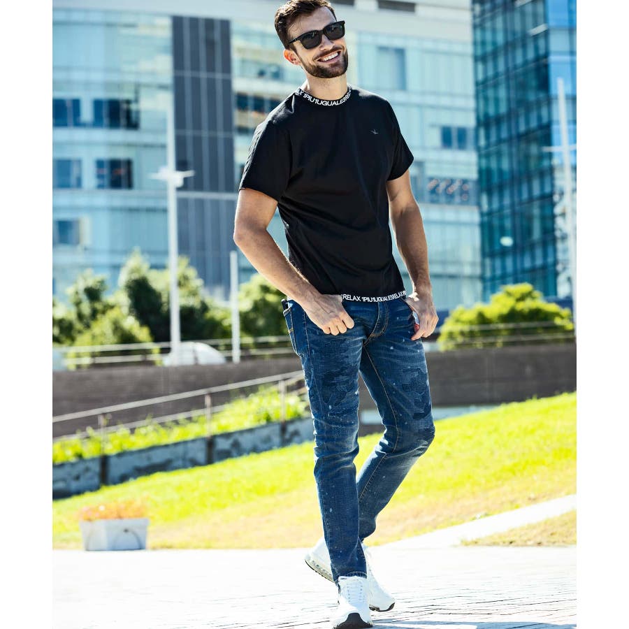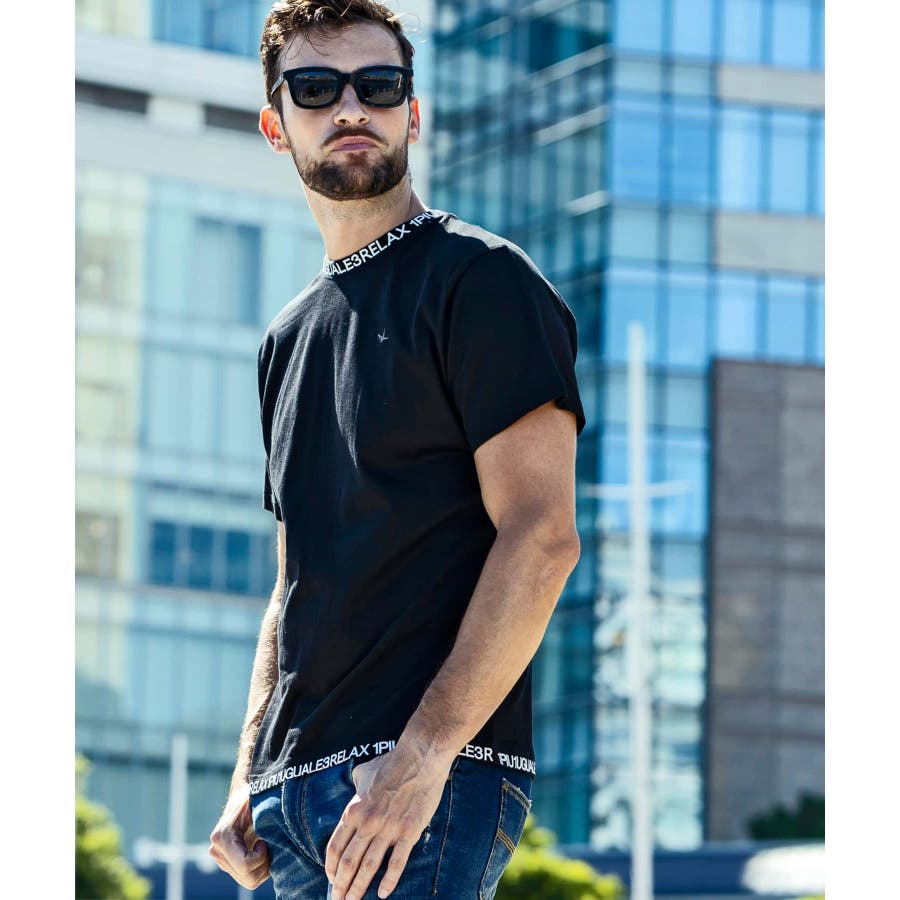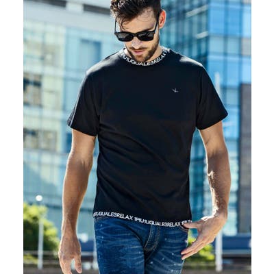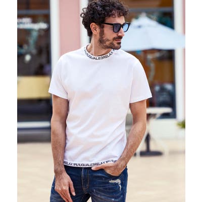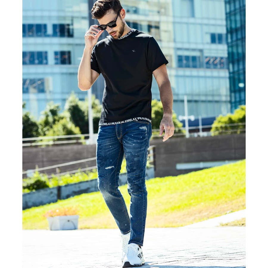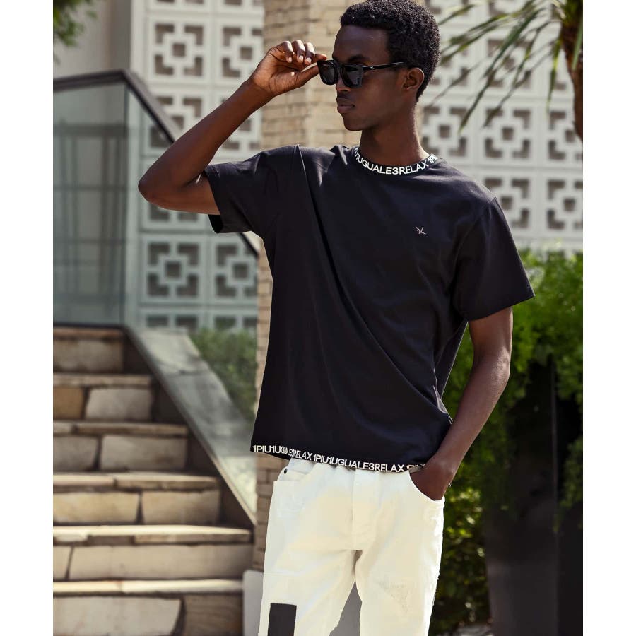 ネックと裾部分にブランドロゴを印象的に配置した半袖Tシャツ。
