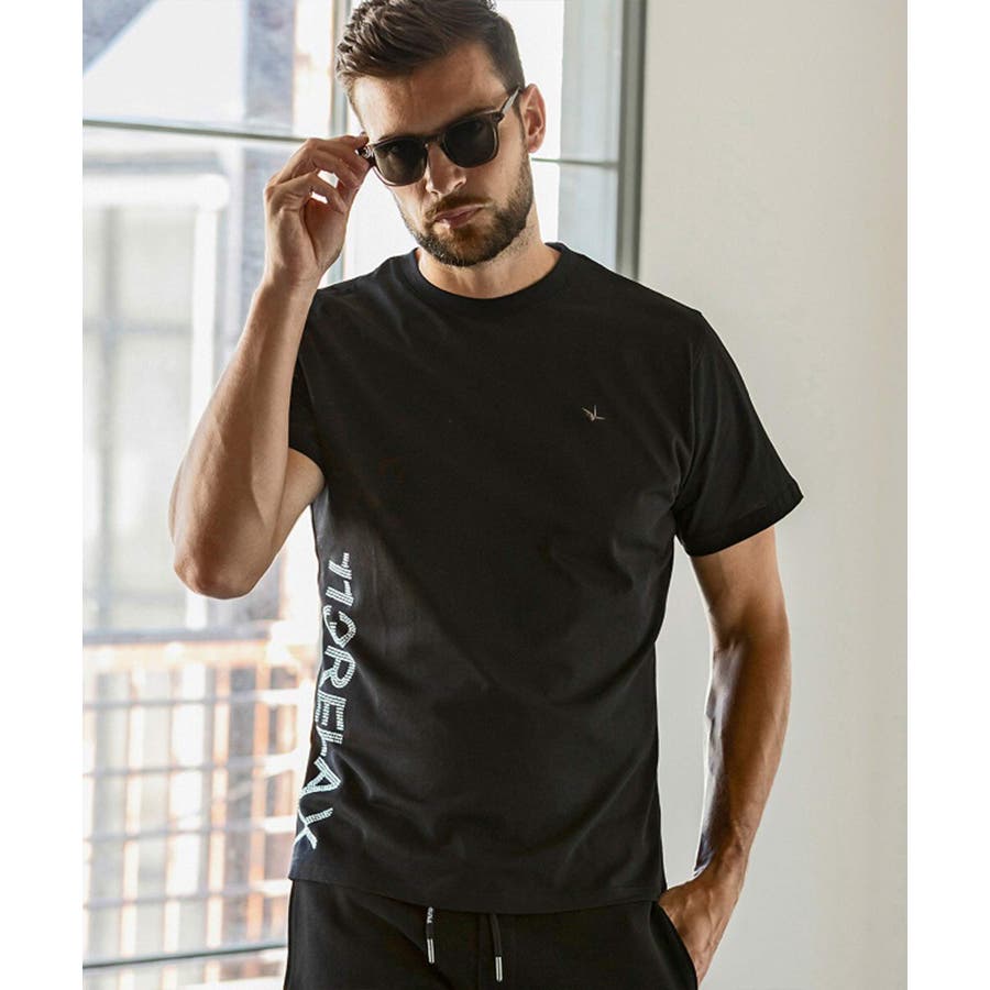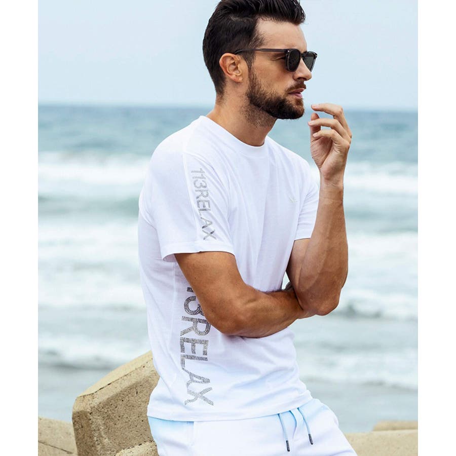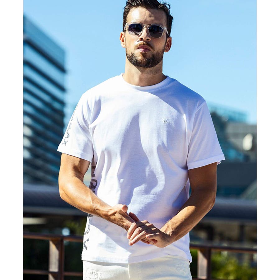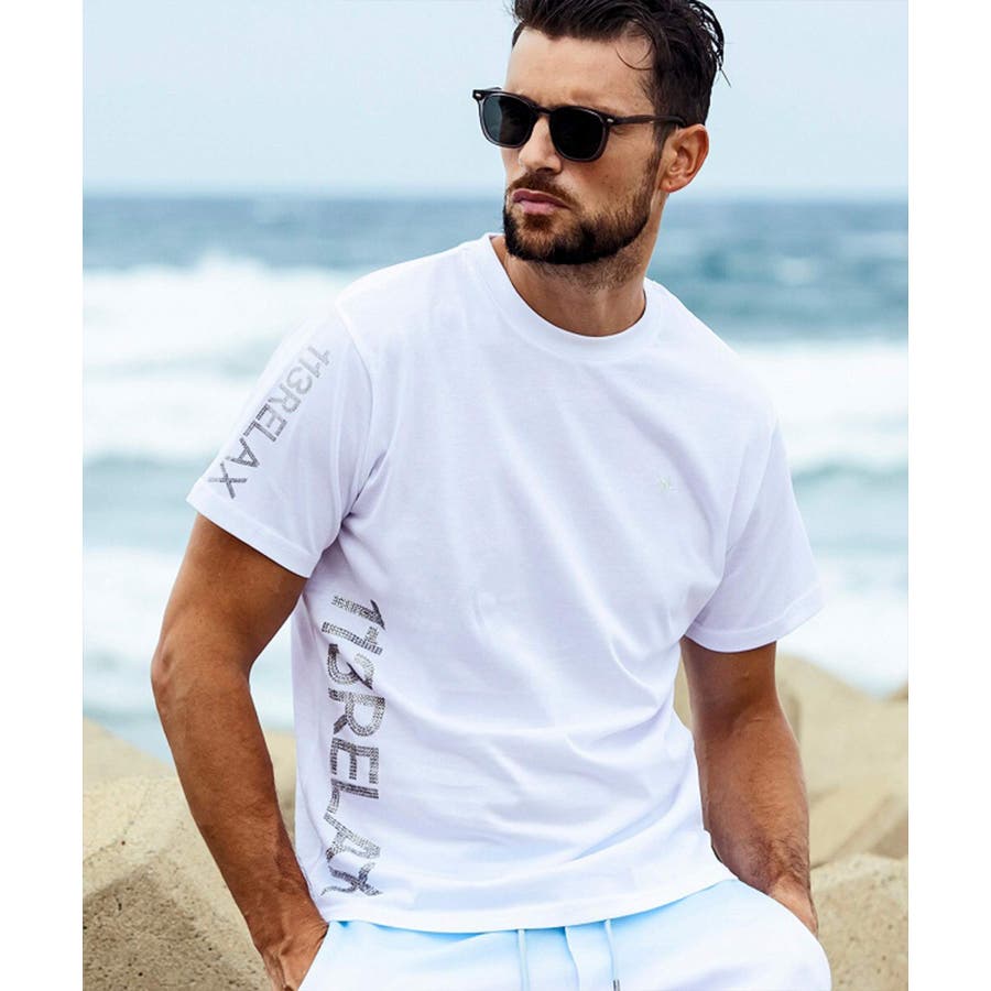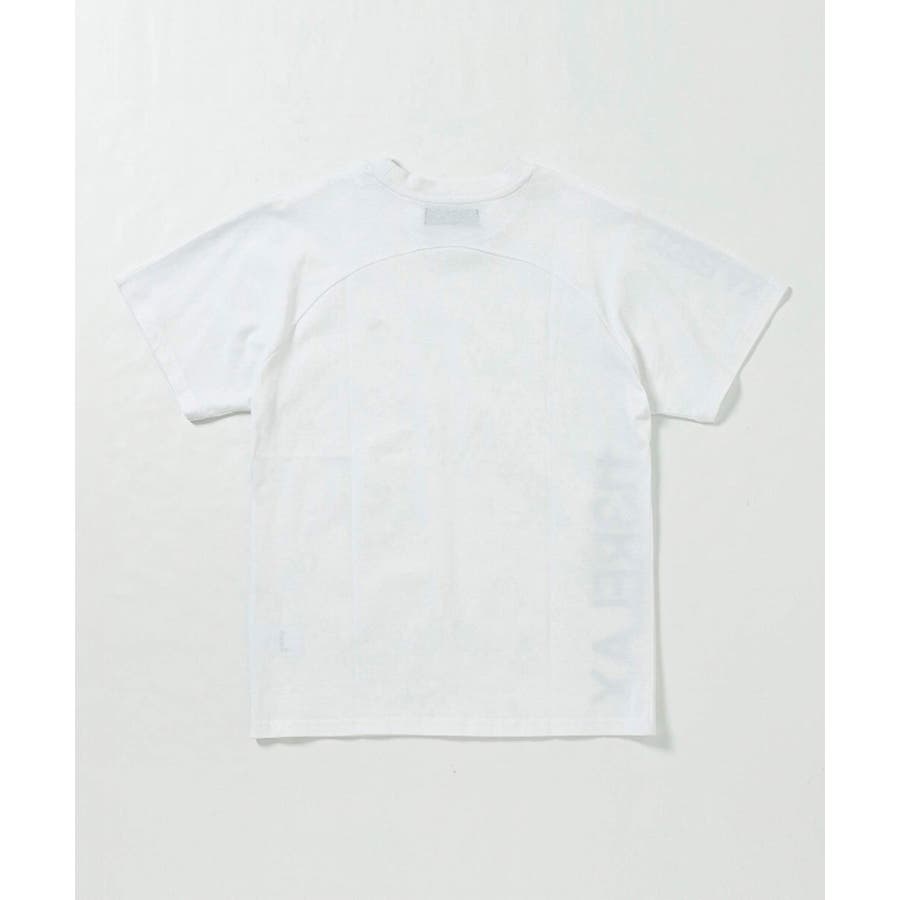 ブランドロゴをライントーンで大胆に配置した半袖Tシャツ。