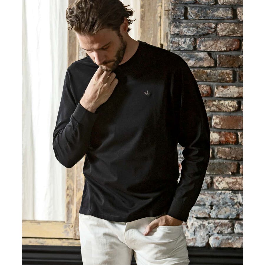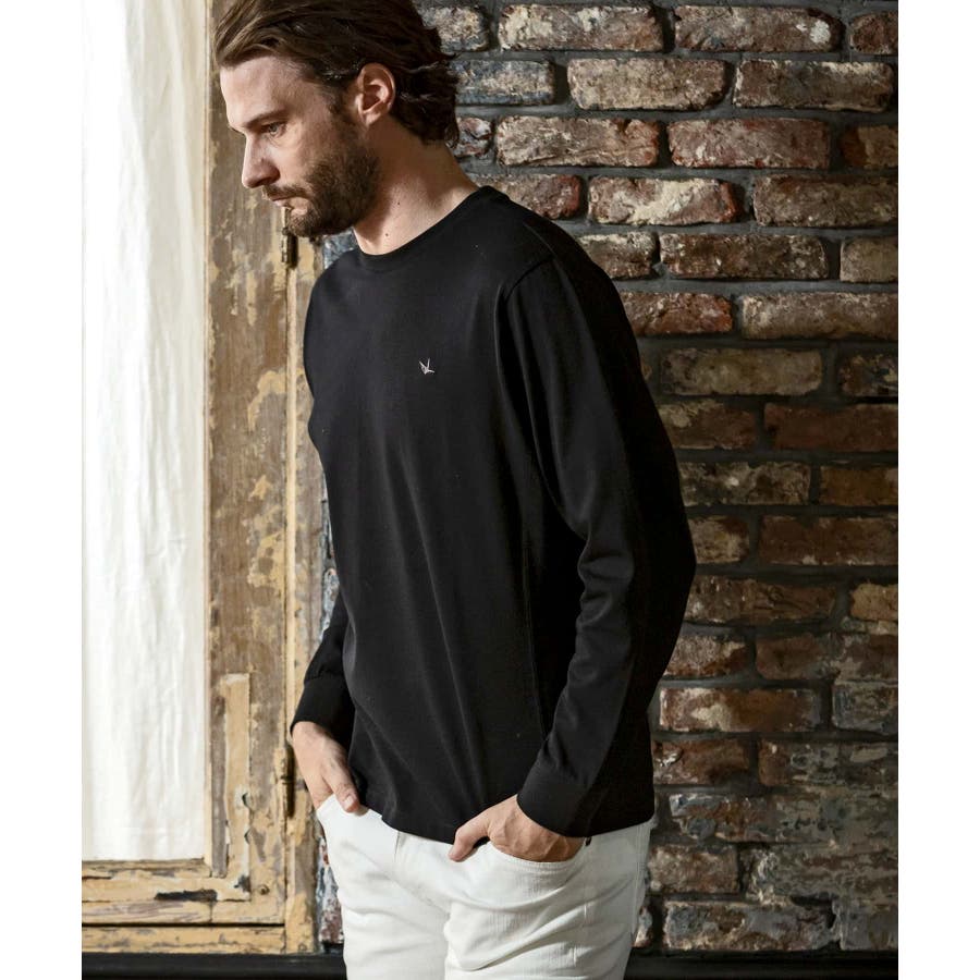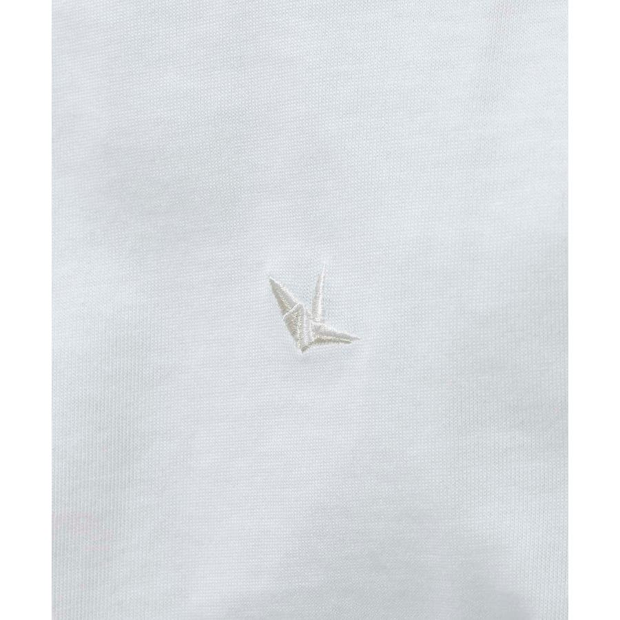 左胸にブランドアイコンである折り鶴を同色の刺繍で添えて後ろ姿とのギャップを演出します。