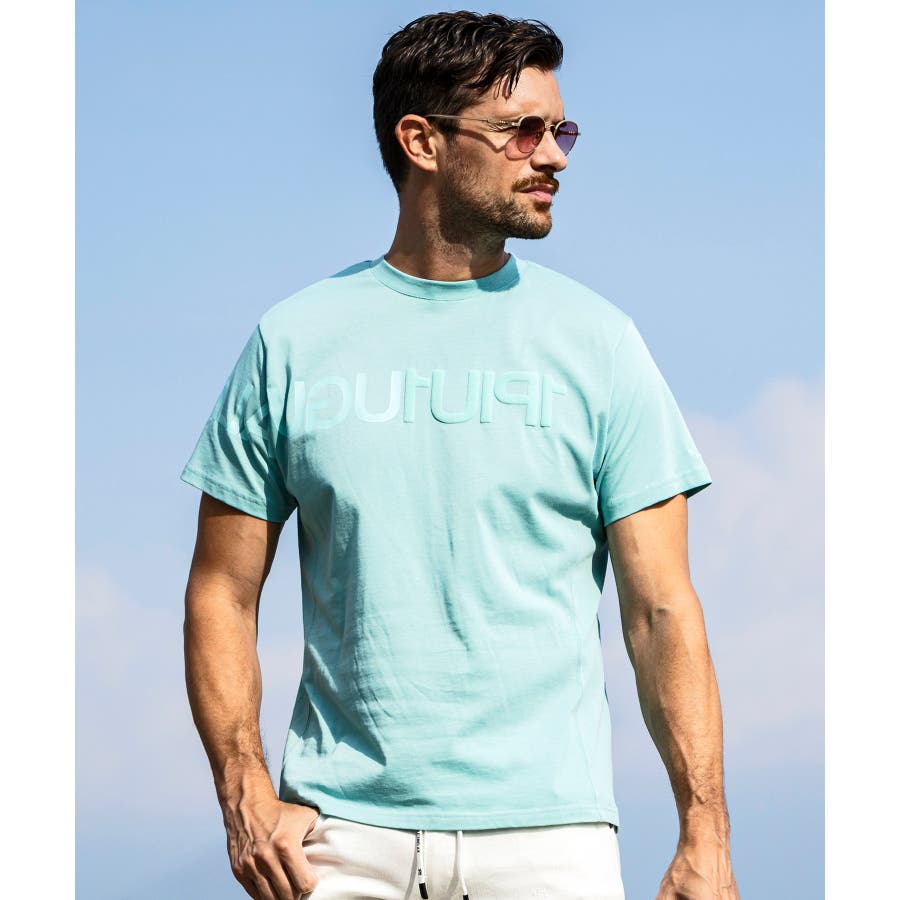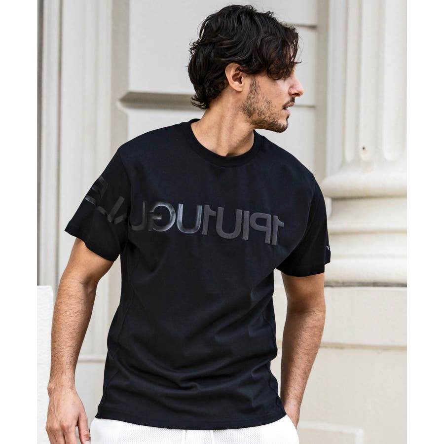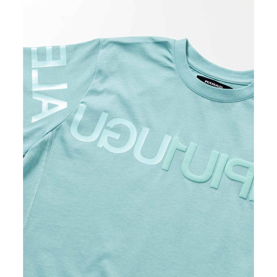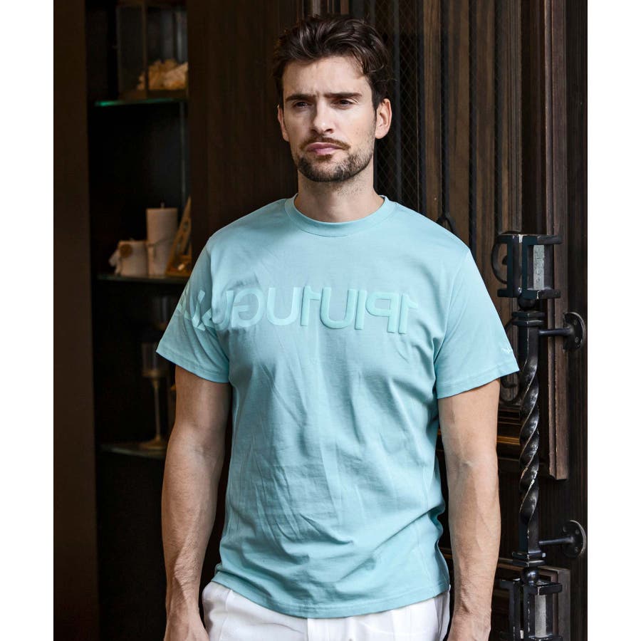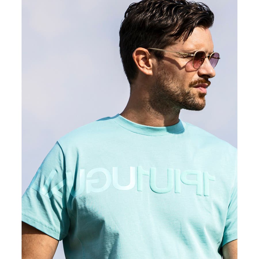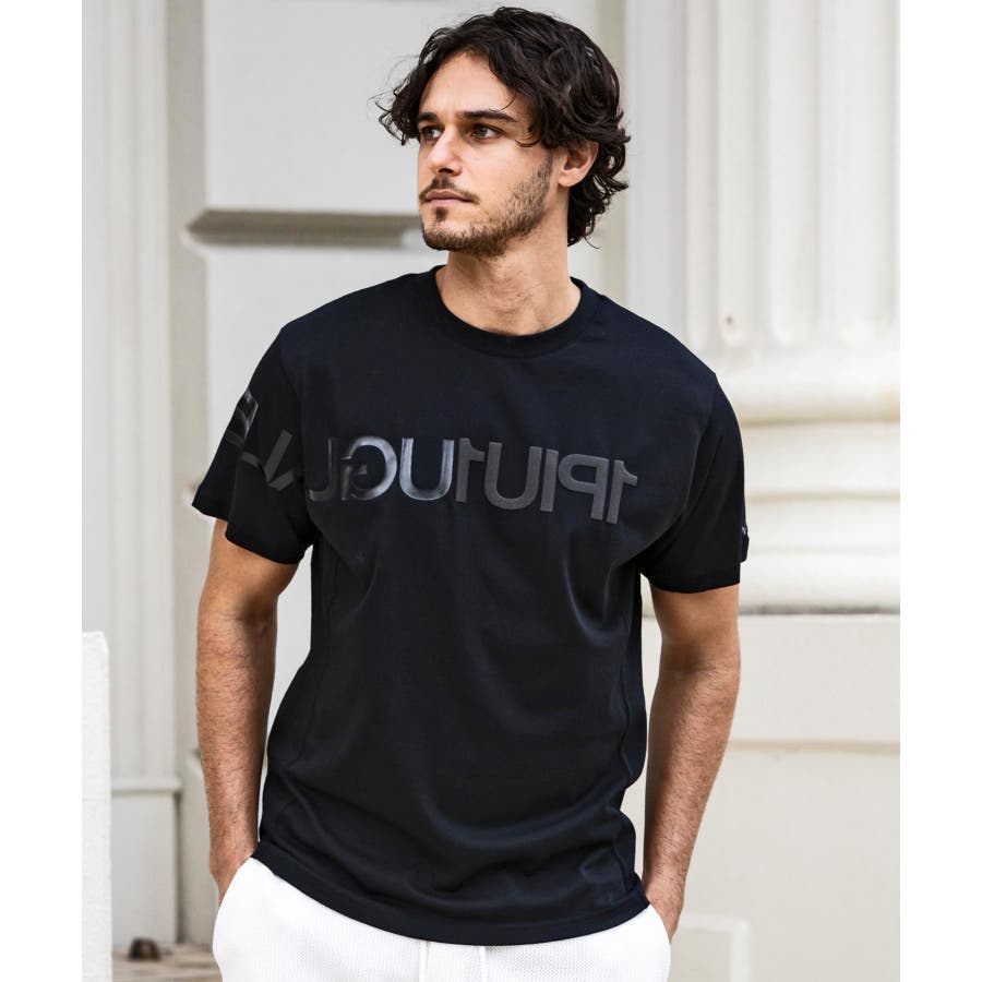 前から後ろに大胆に配置した1PIU1UGUALE3 RELAXロゴがプリント加工の凸凹により立体感を演出しています。
