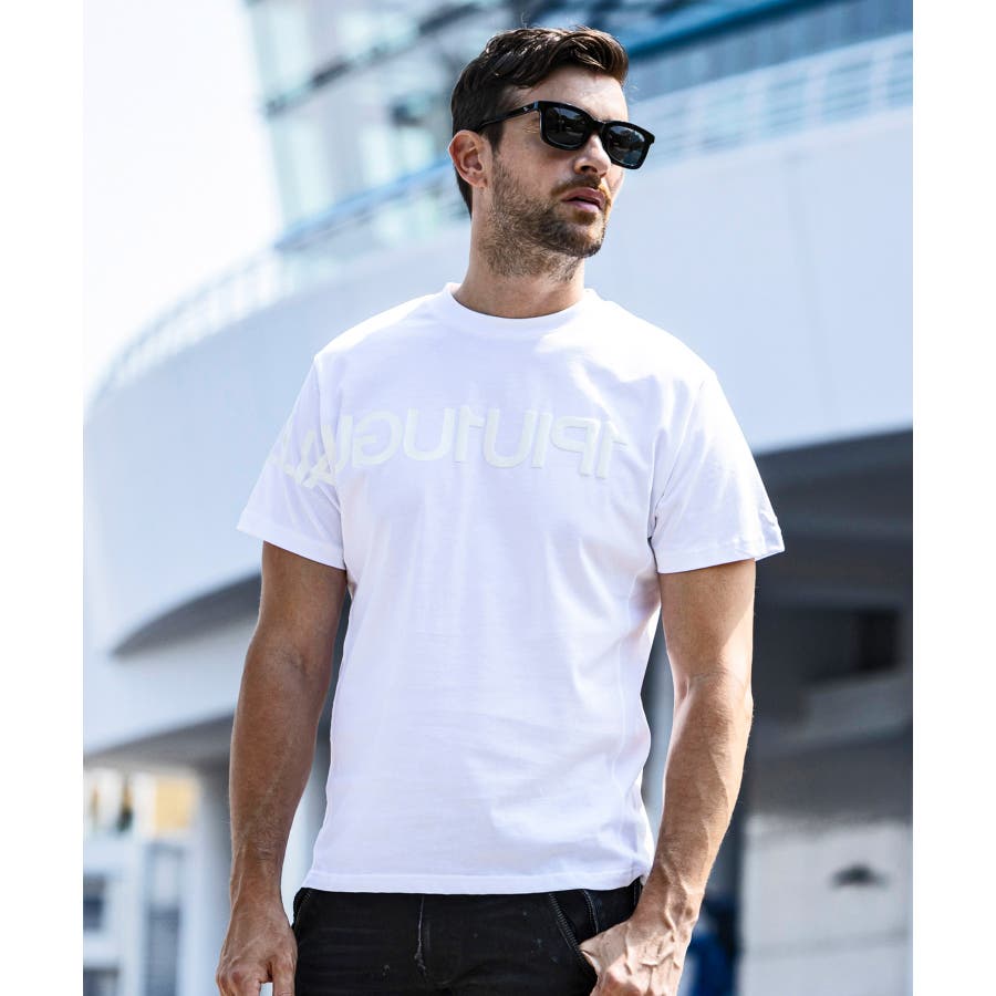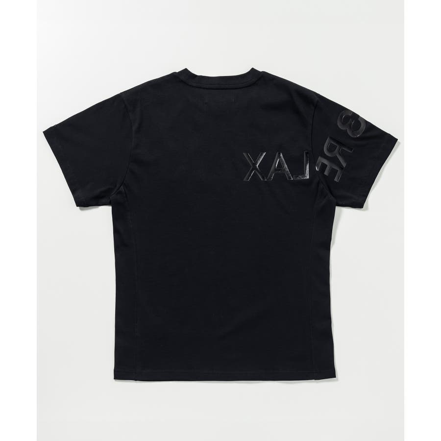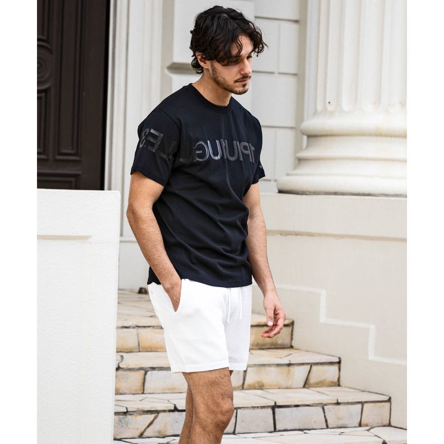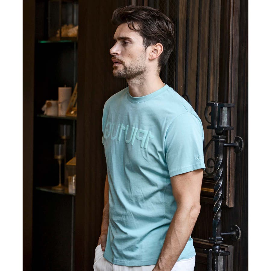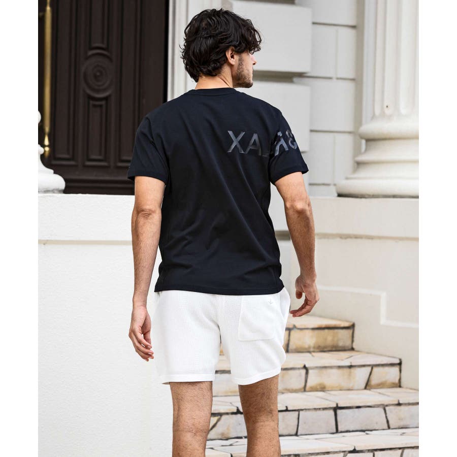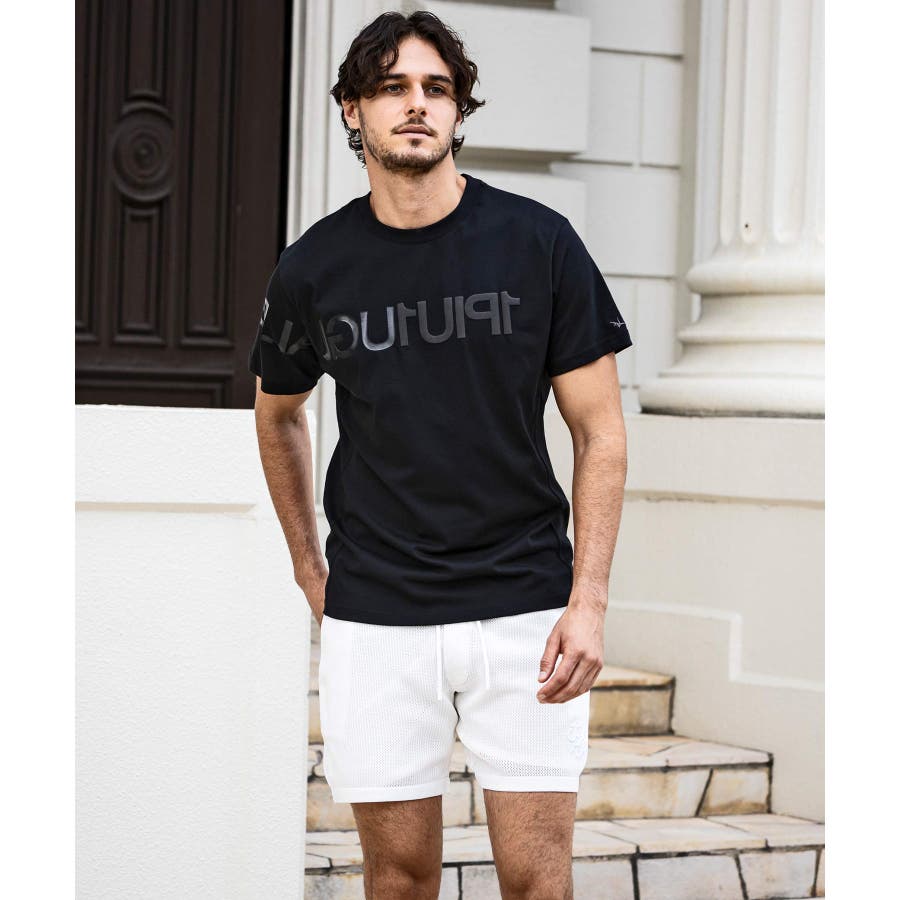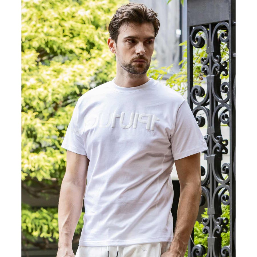 前から後ろに大胆に配置した1PIU1UGUALE3 RELAXロゴがプリント加工の凸凹により立体感を演出しています。