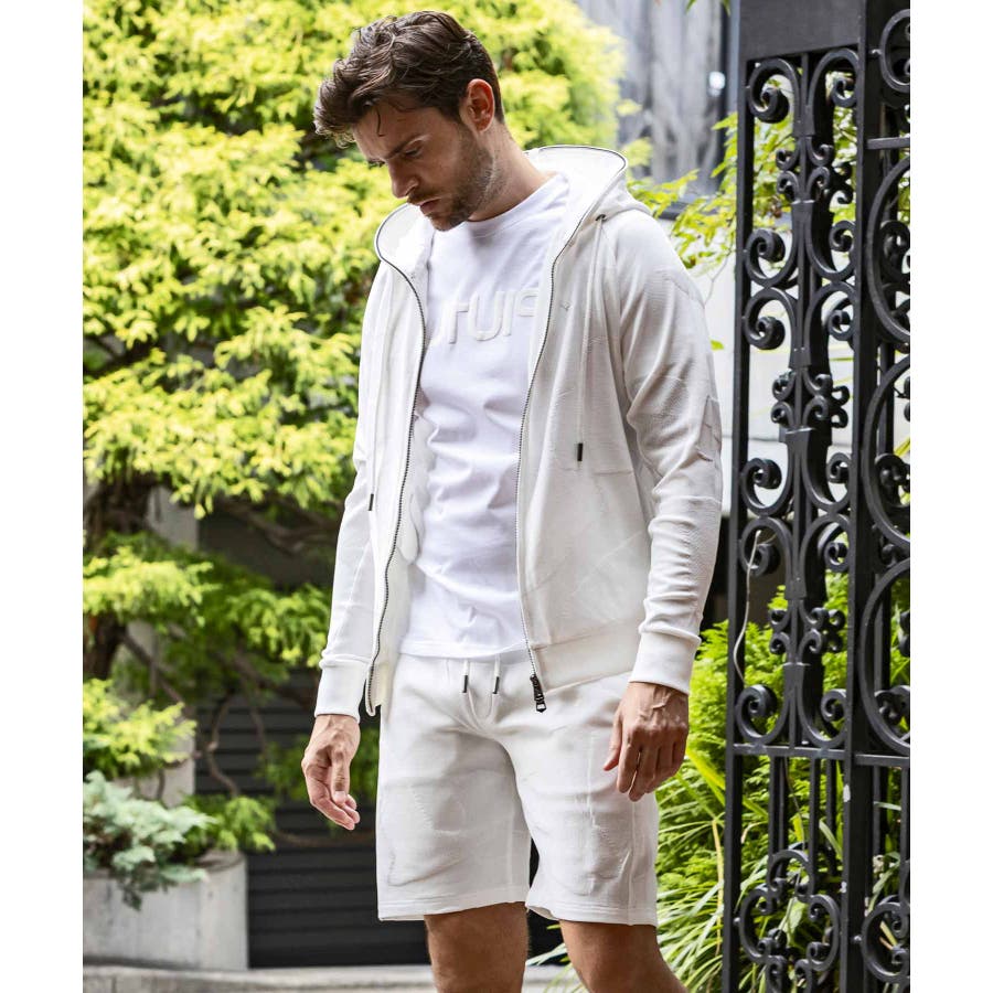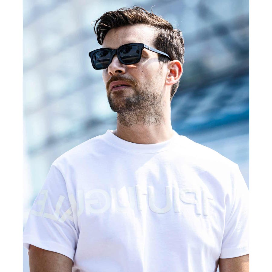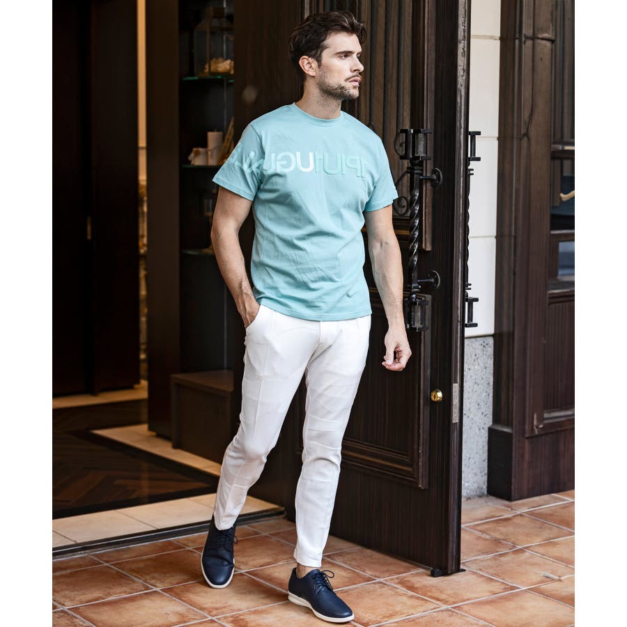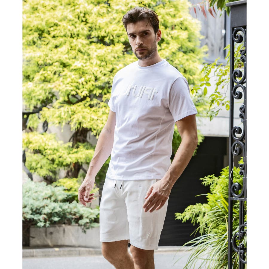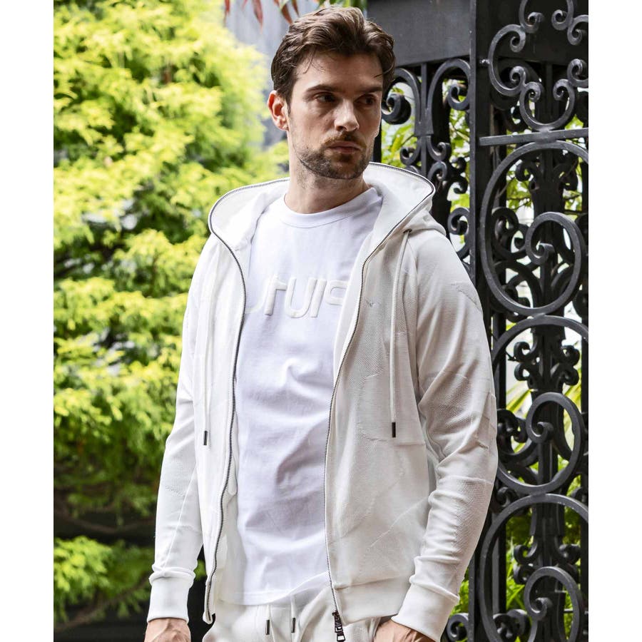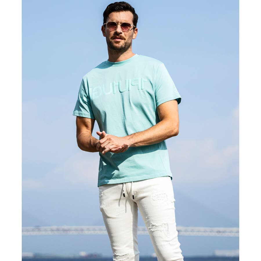 前から後ろに大胆に配置した1PIU1UGUALE3 RELAXロゴがプリント加工の凸凹により立体感を演出しています。