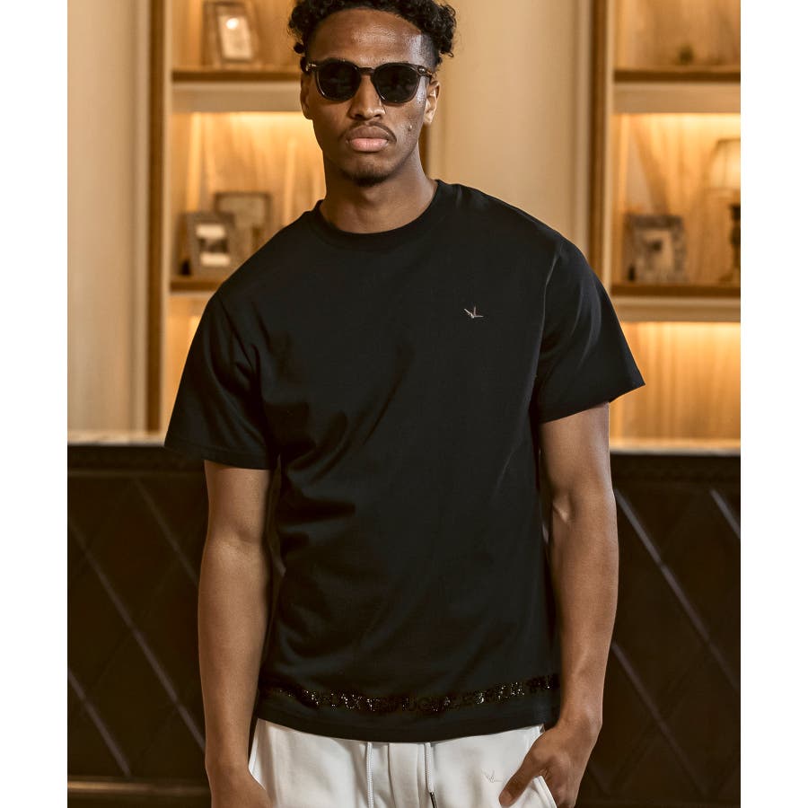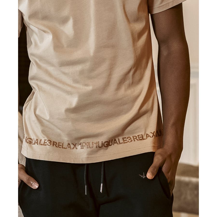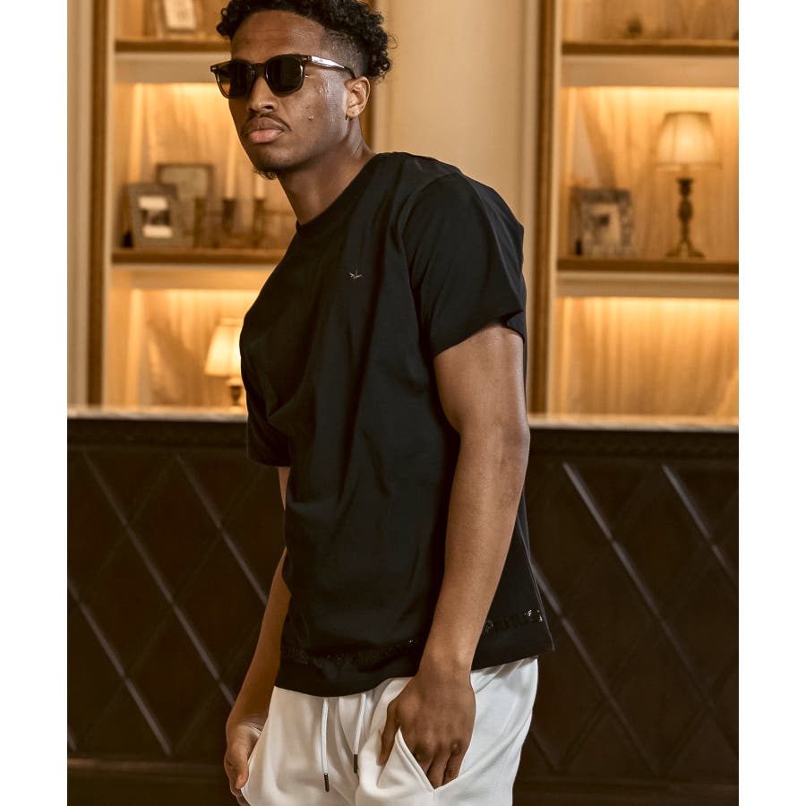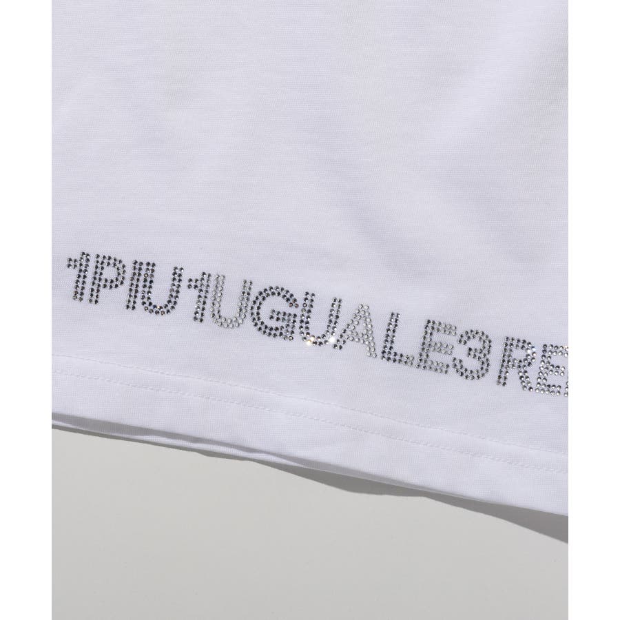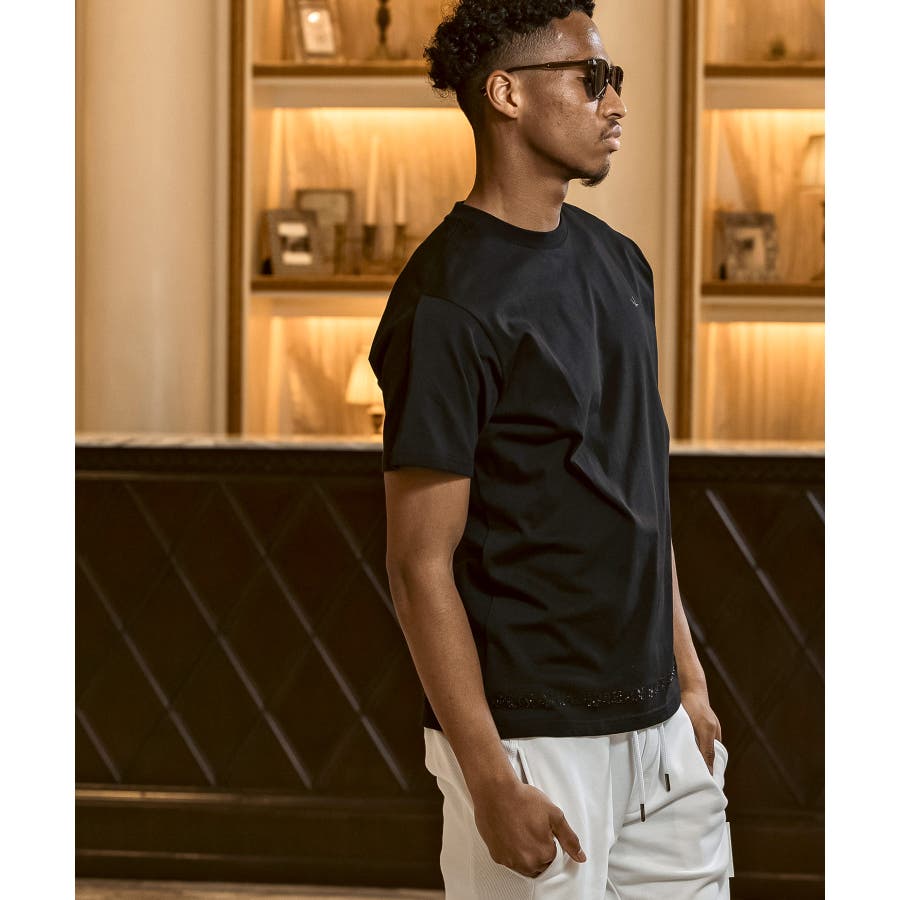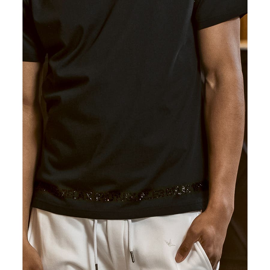 裾にブランドロゴをラインストーンでデザインした半袖カットソー。