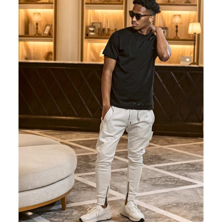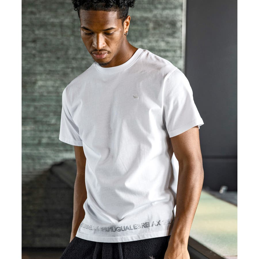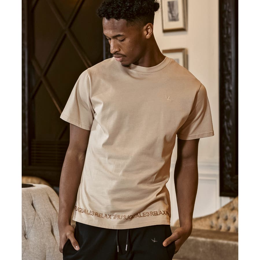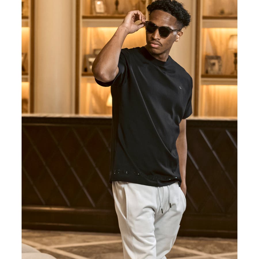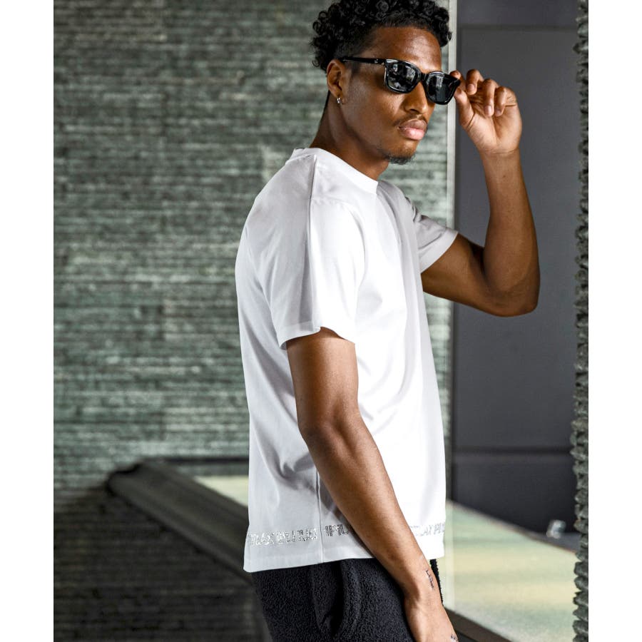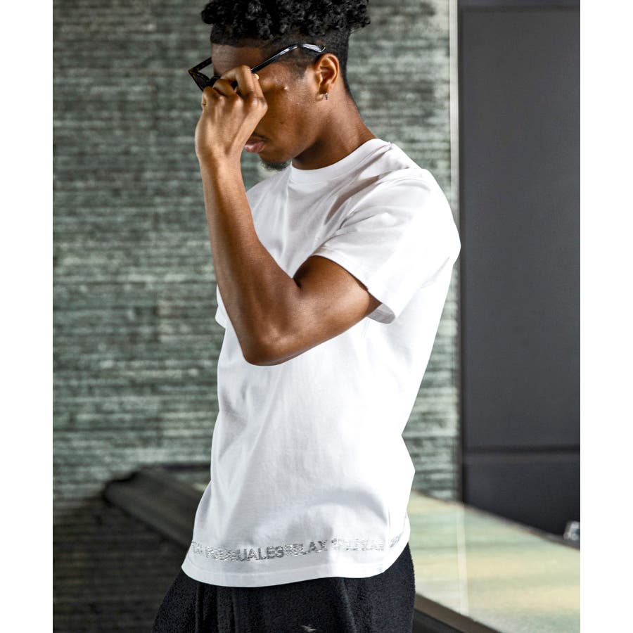 裾にブランドロゴをラインストーンでデザインした半袖カットソー。