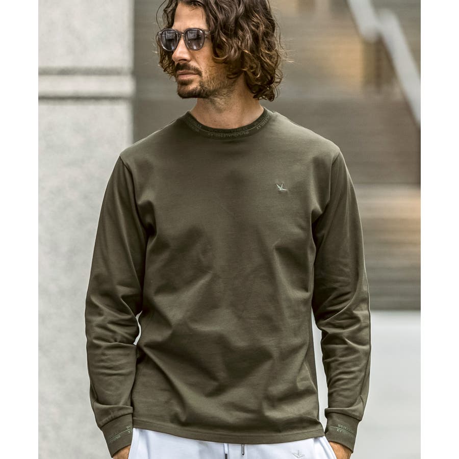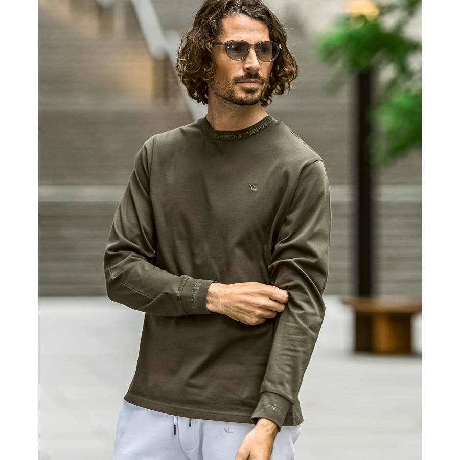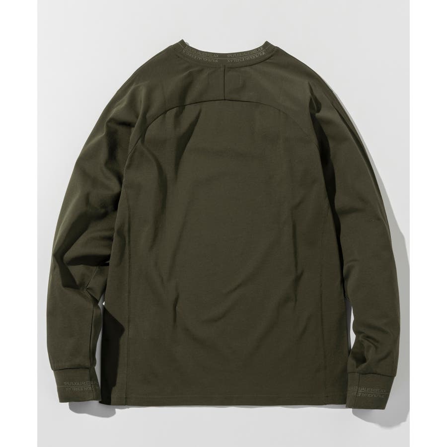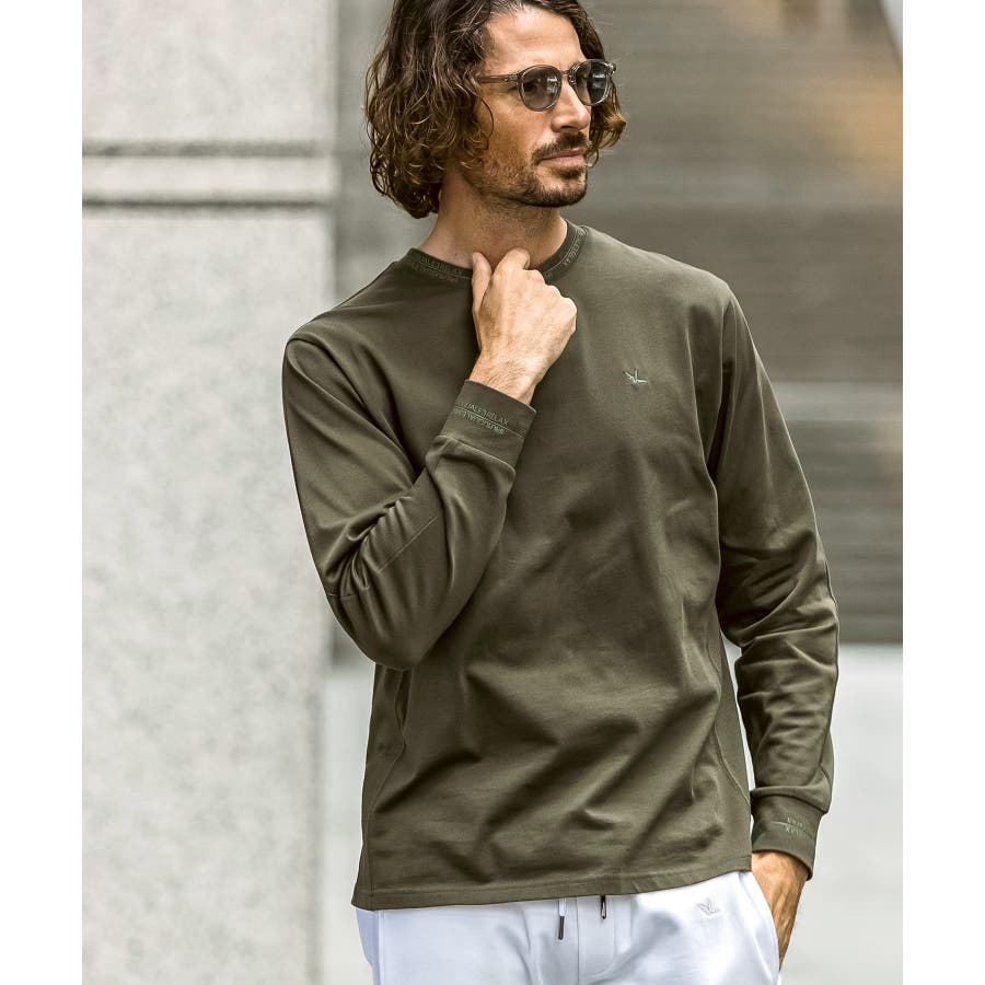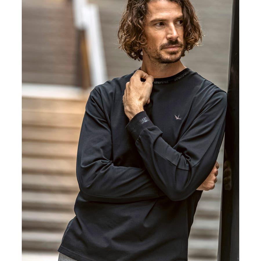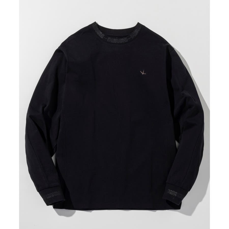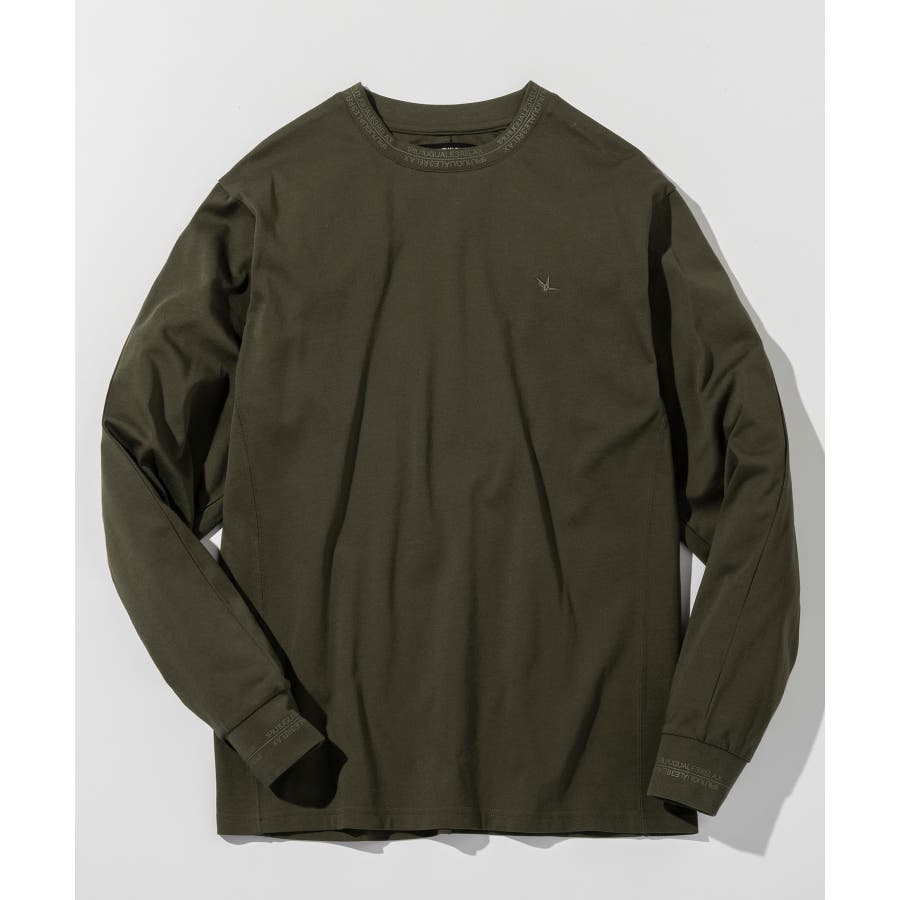 首元と袖口にブランドロゴを配置した長袖カットソー。