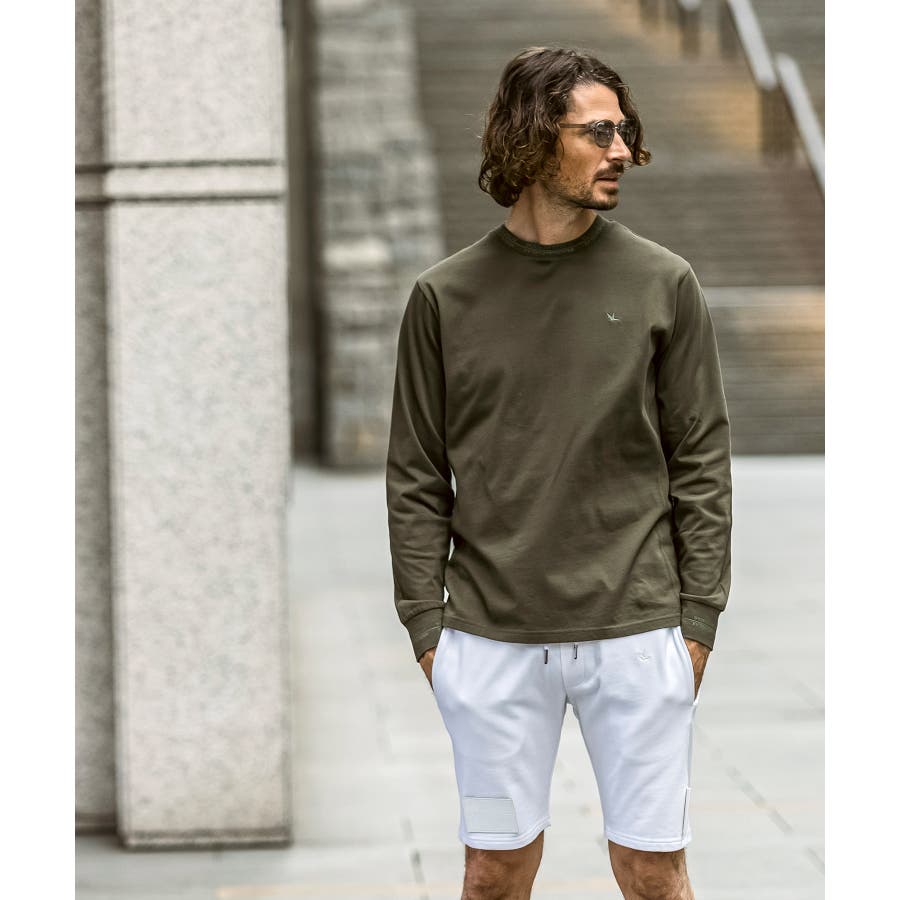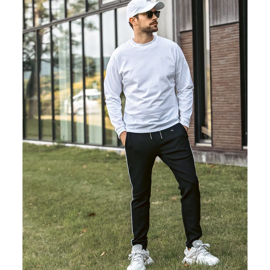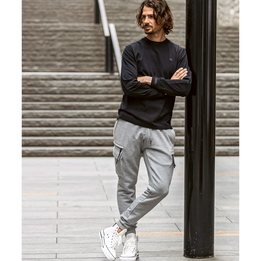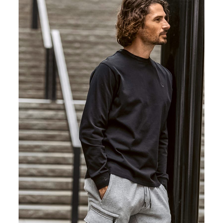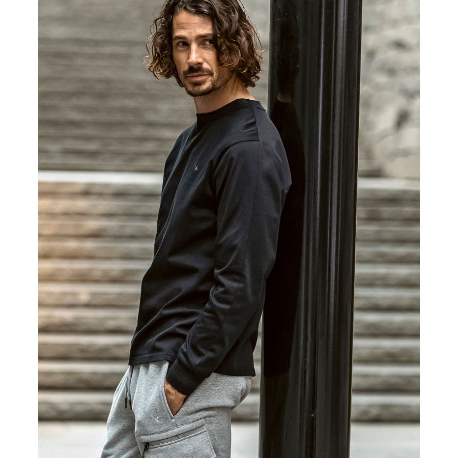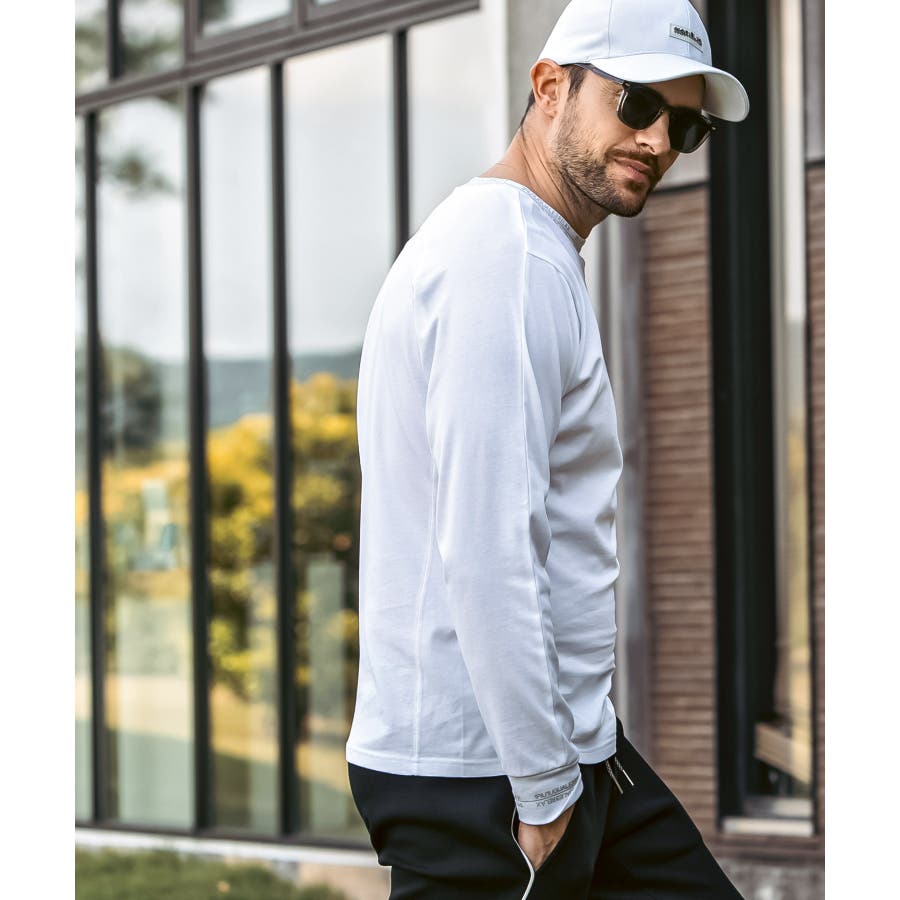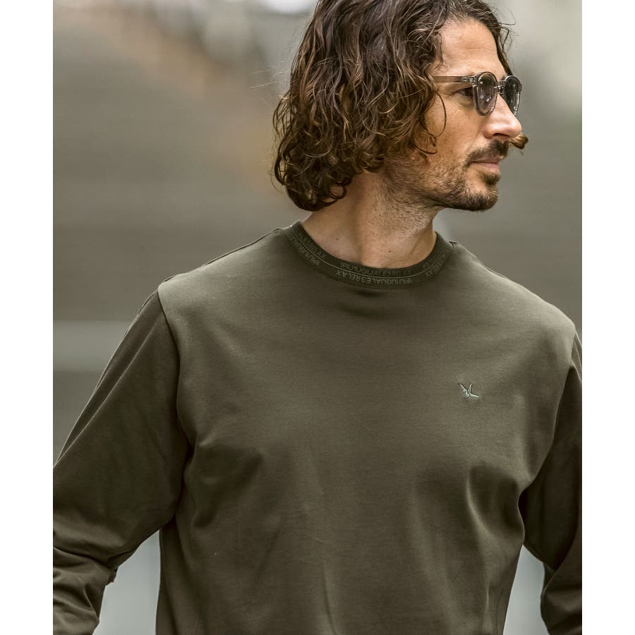 首元と袖口にブランドロゴを配置した長袖カットソー。