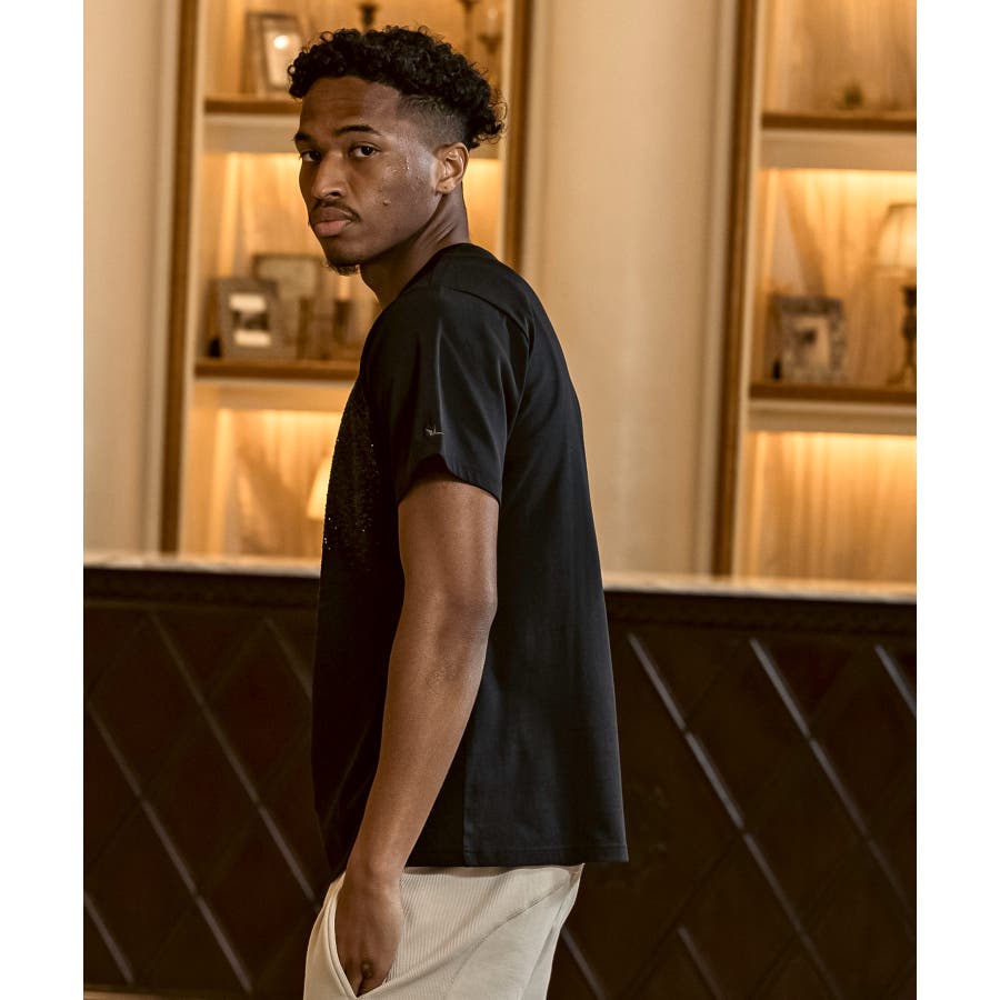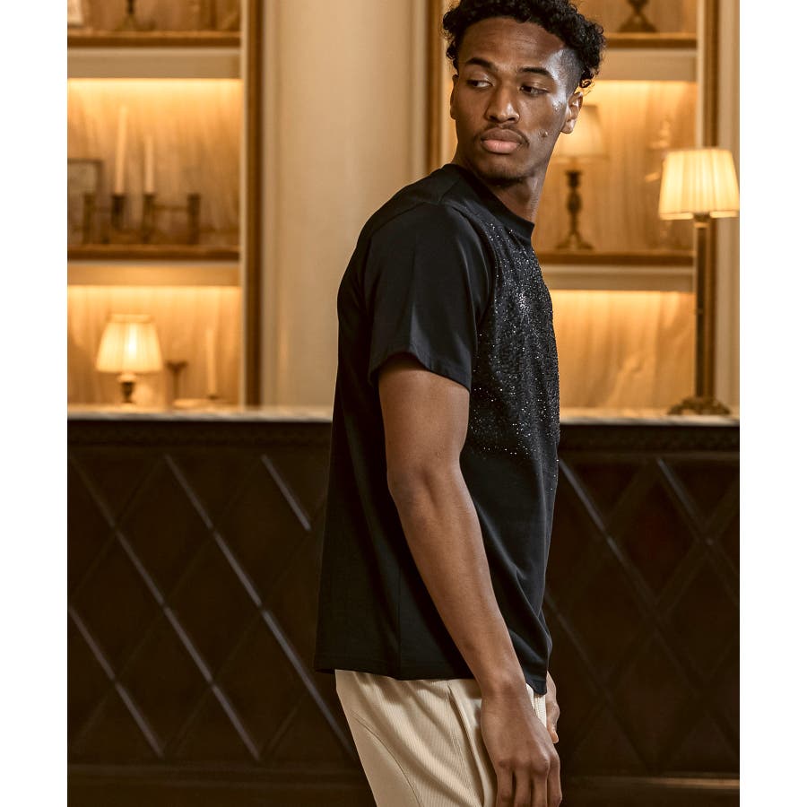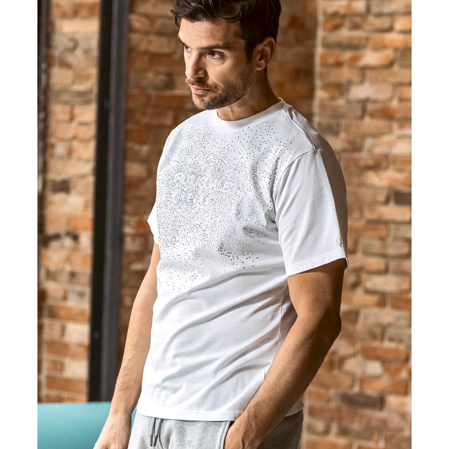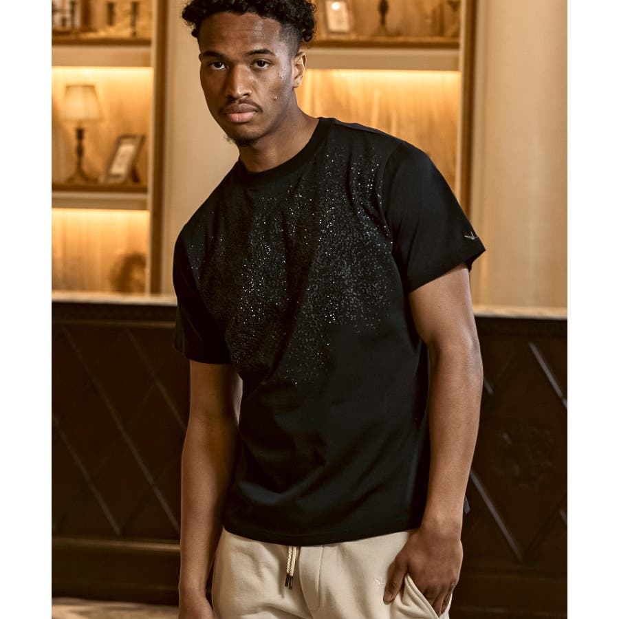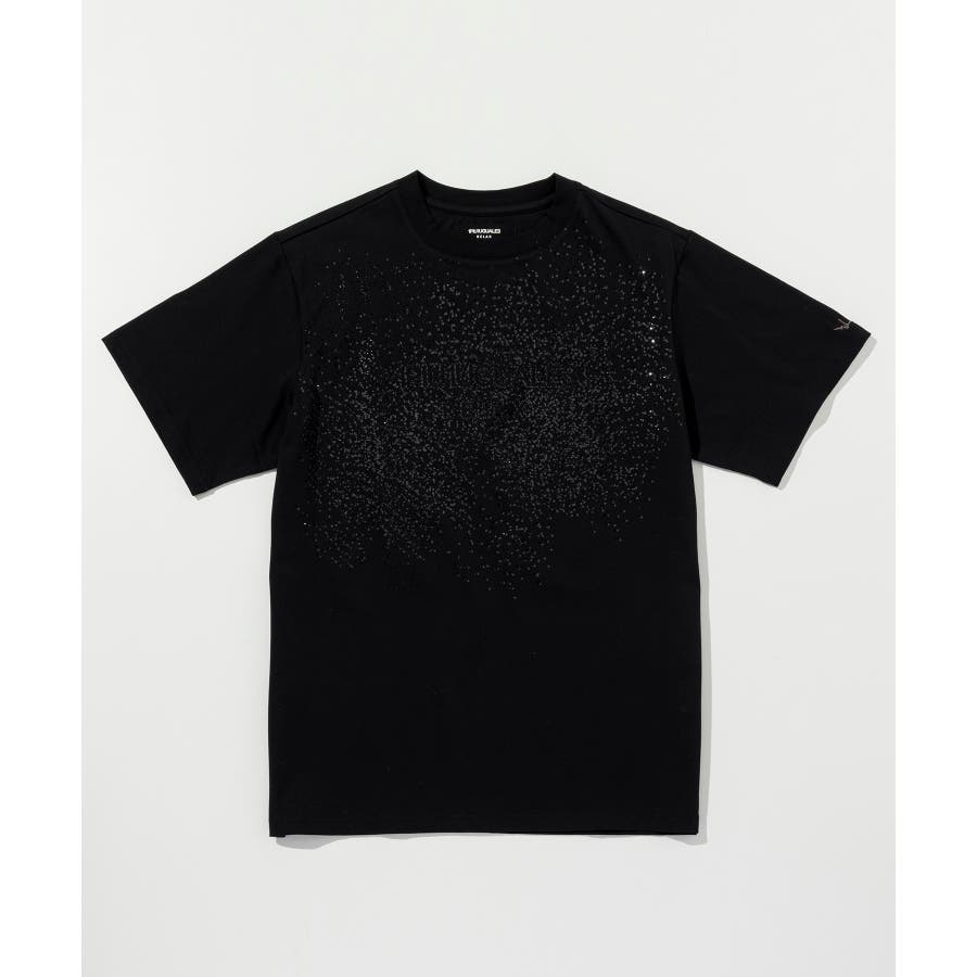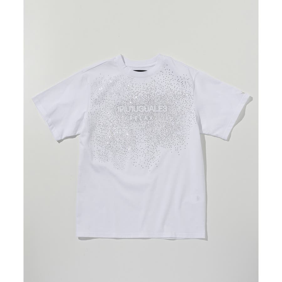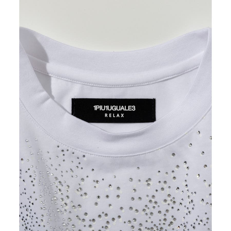 胸元にラインストーンとプリントを散りばめた華やかなデザインの半袖カットソー。