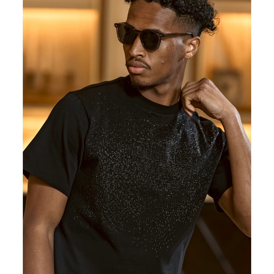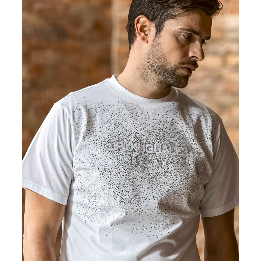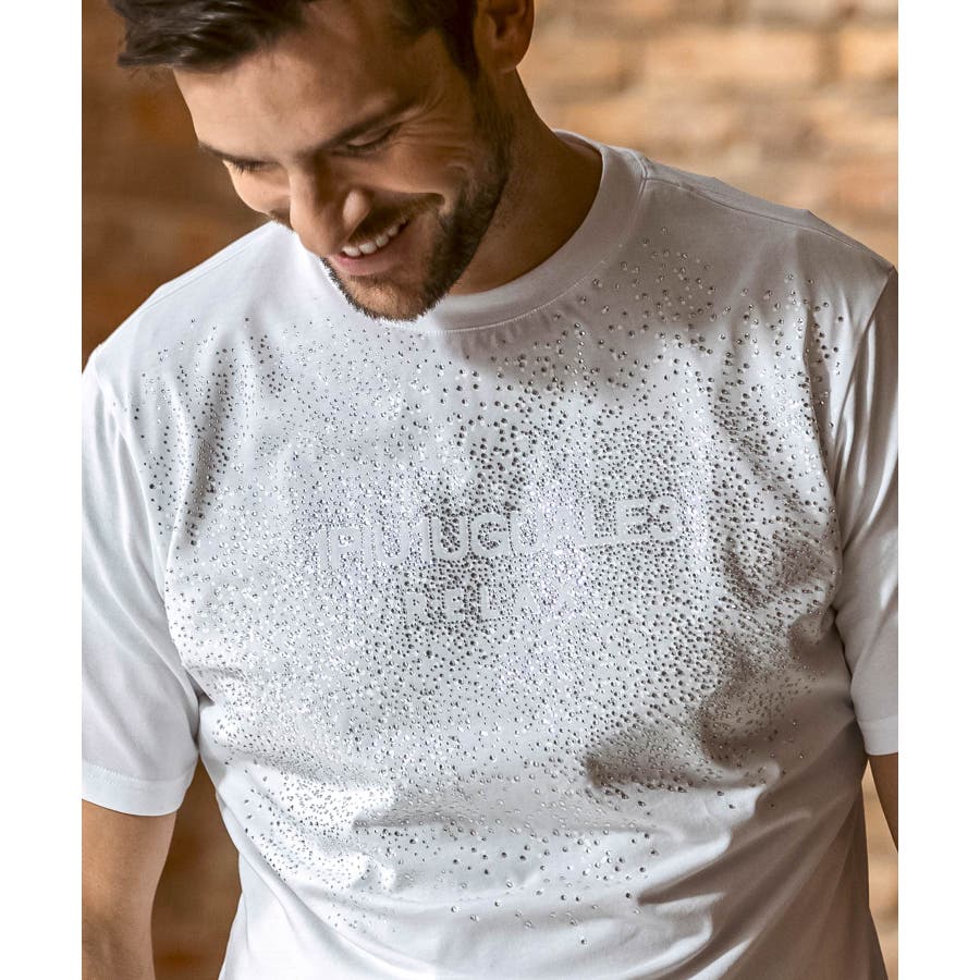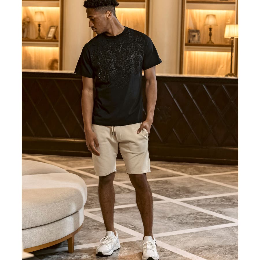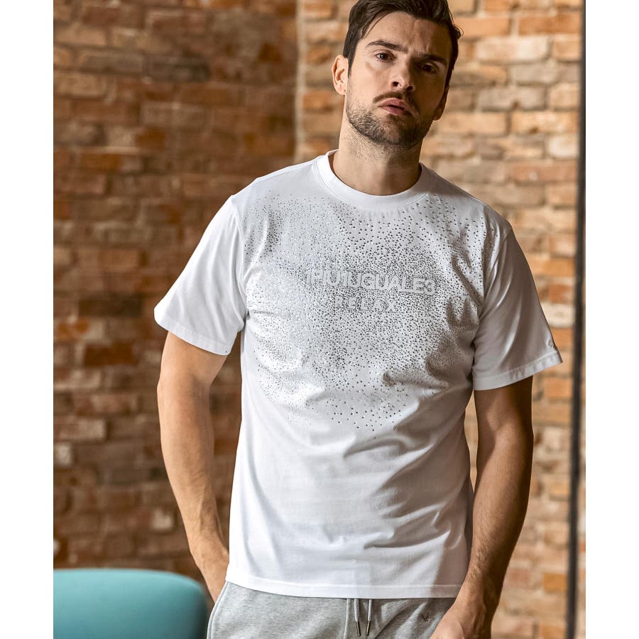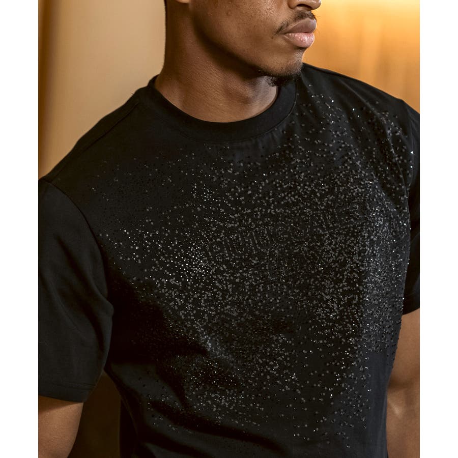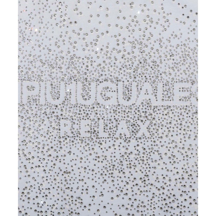 胸元にラインストーンとプリントを散りばめた華やかなデザインの半袖カットソー。