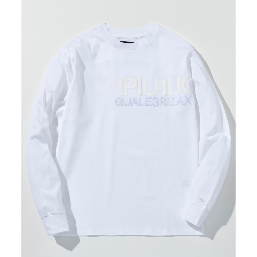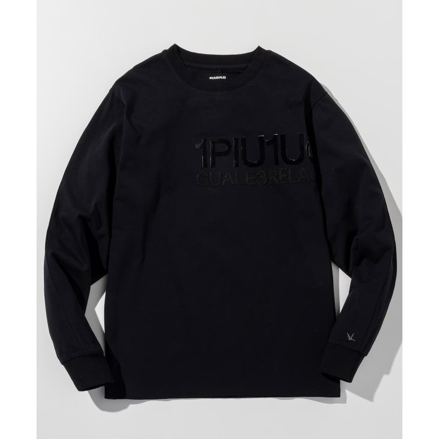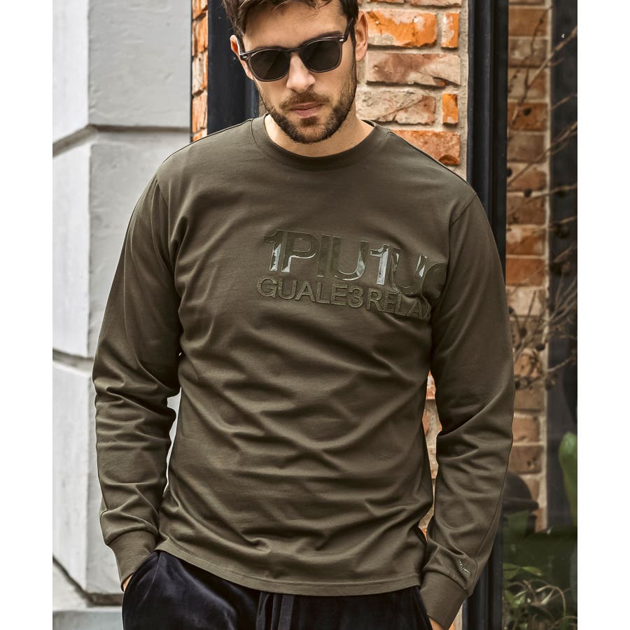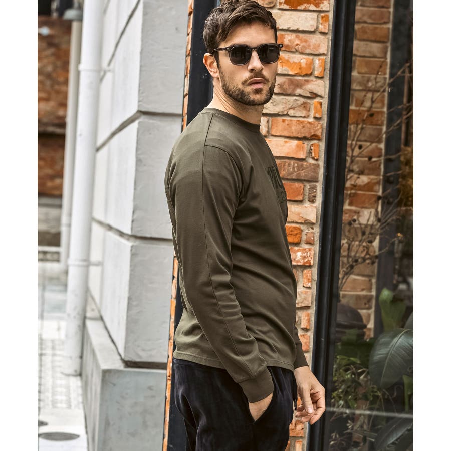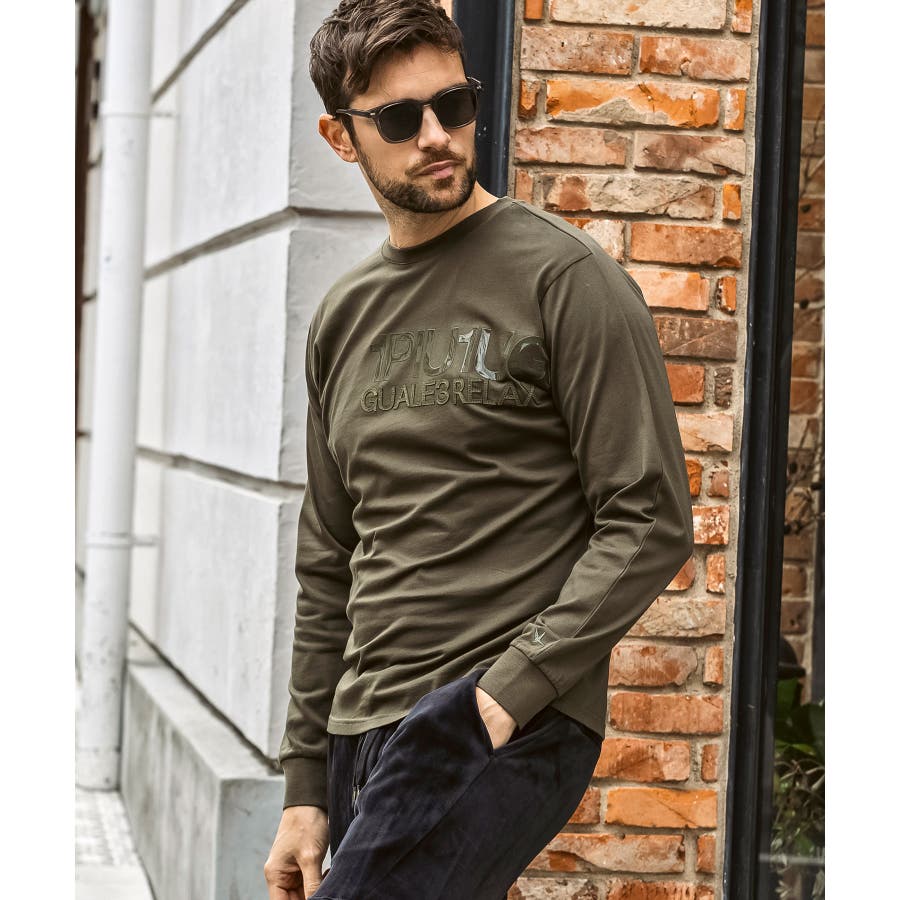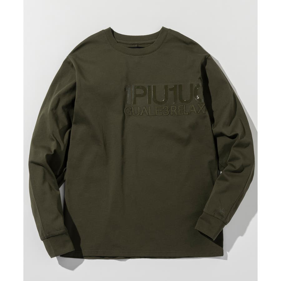 異なる加工のロゴを2段に配置した長袖カットソー。