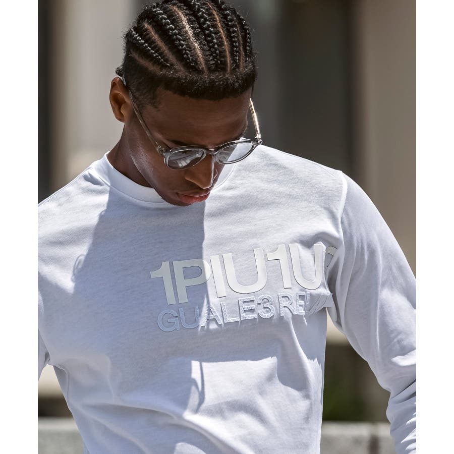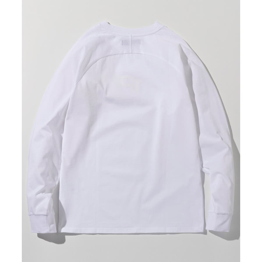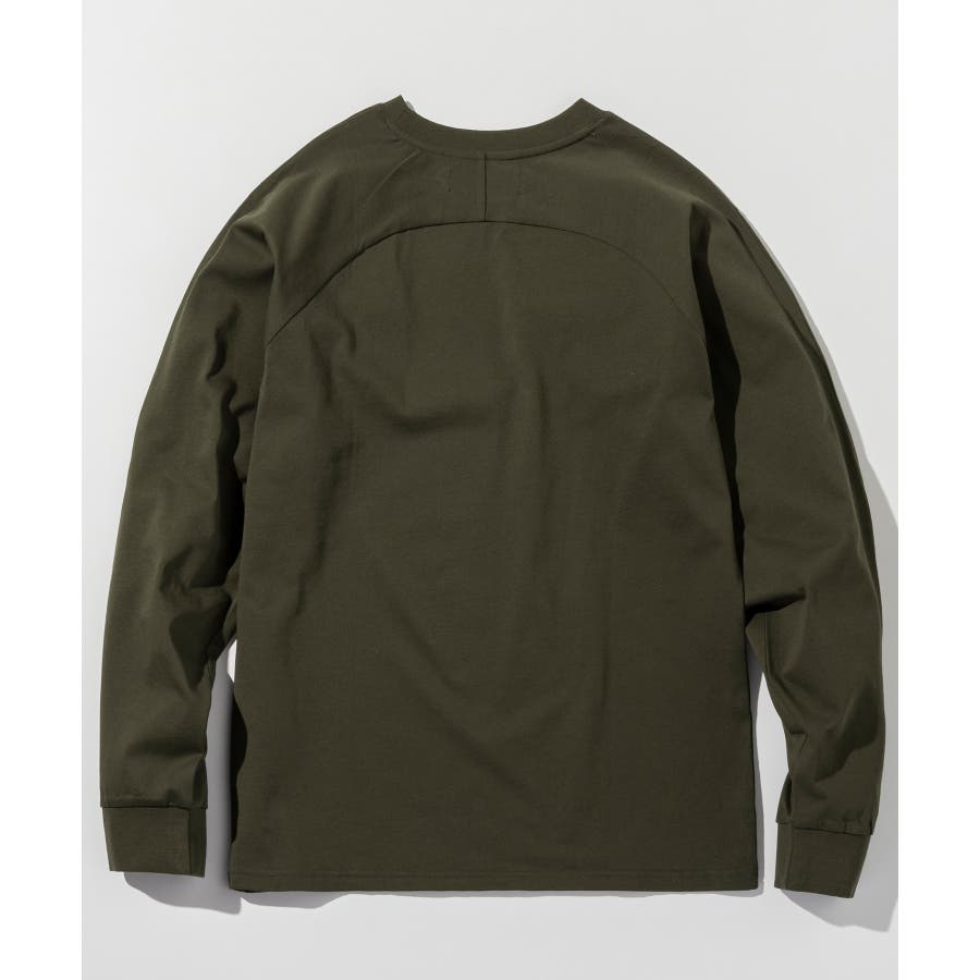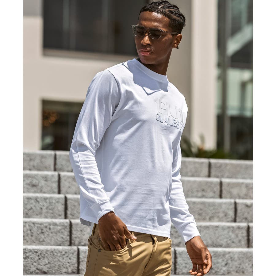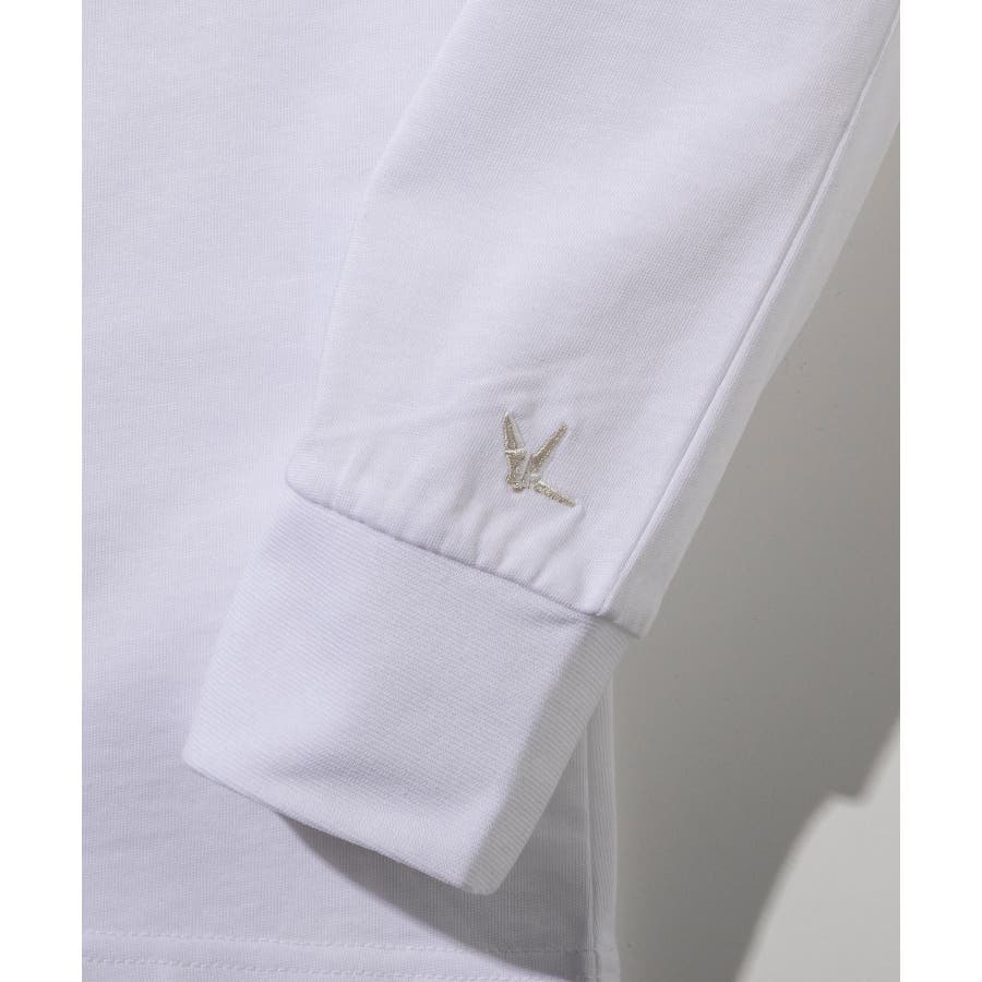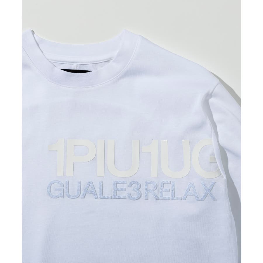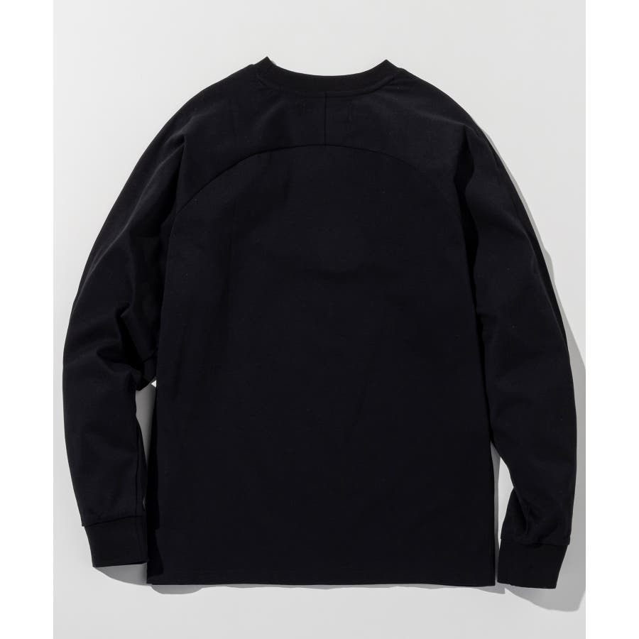 異なる加工のロゴを2段に配置した長袖カットソー。