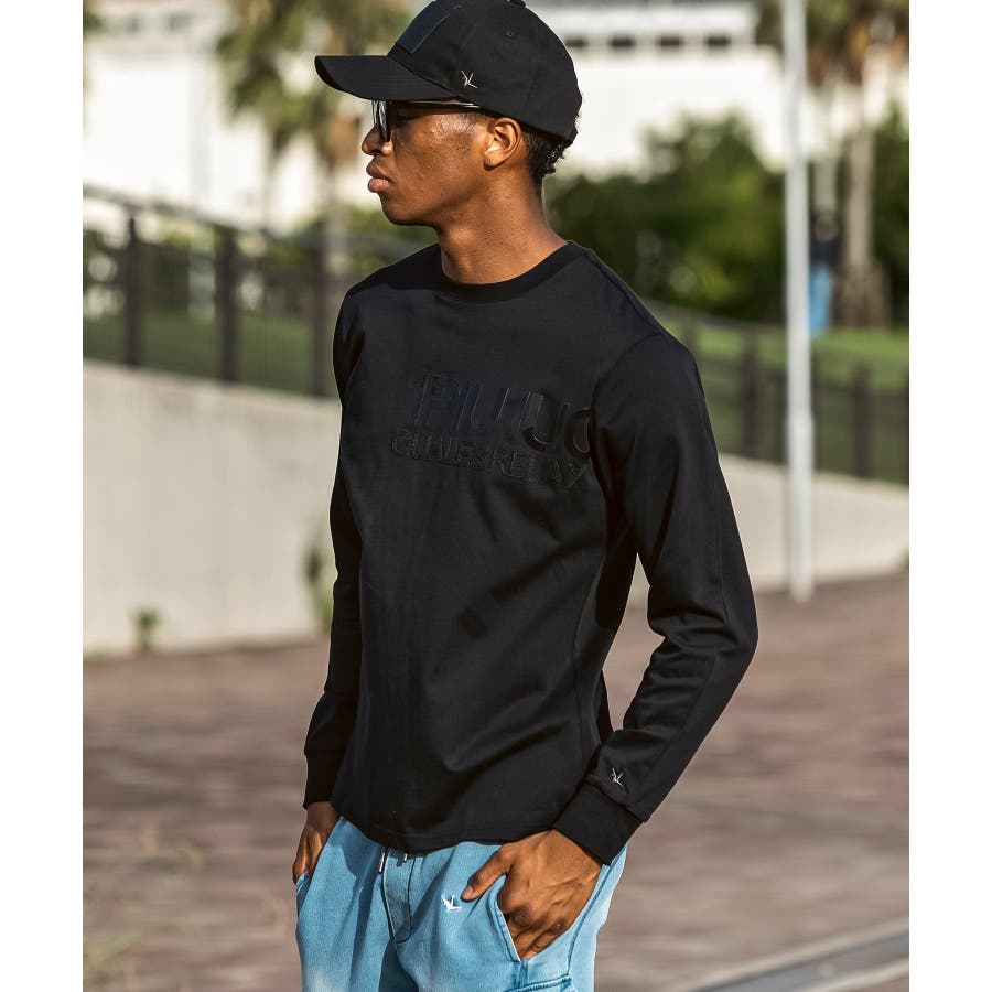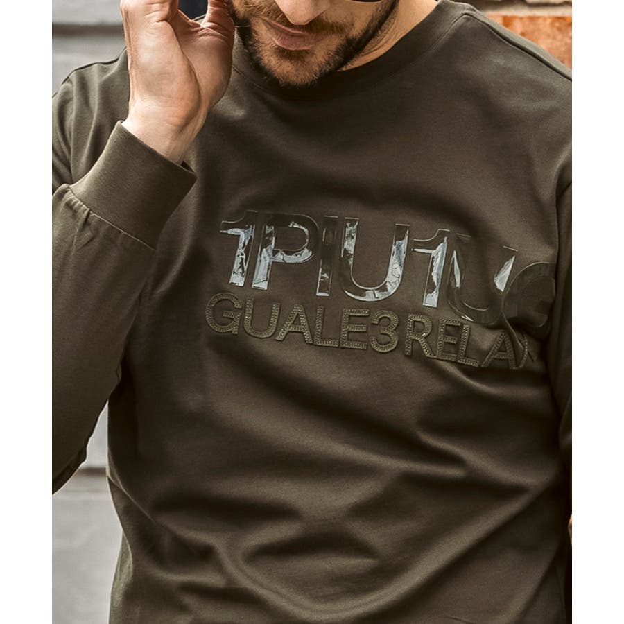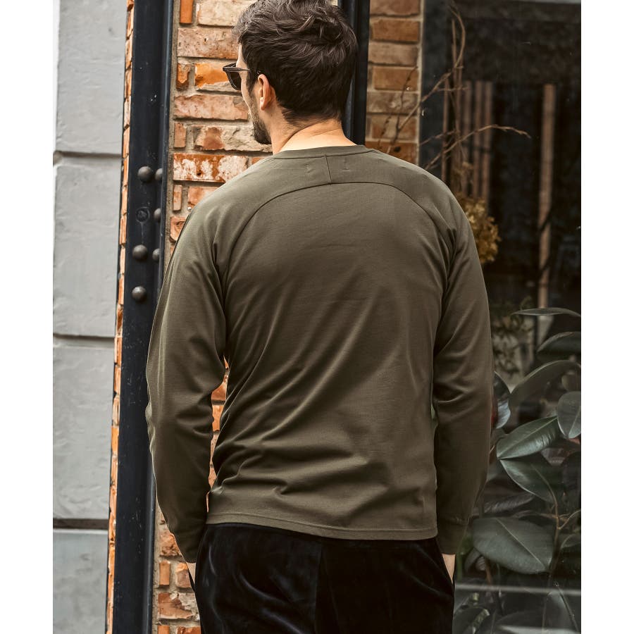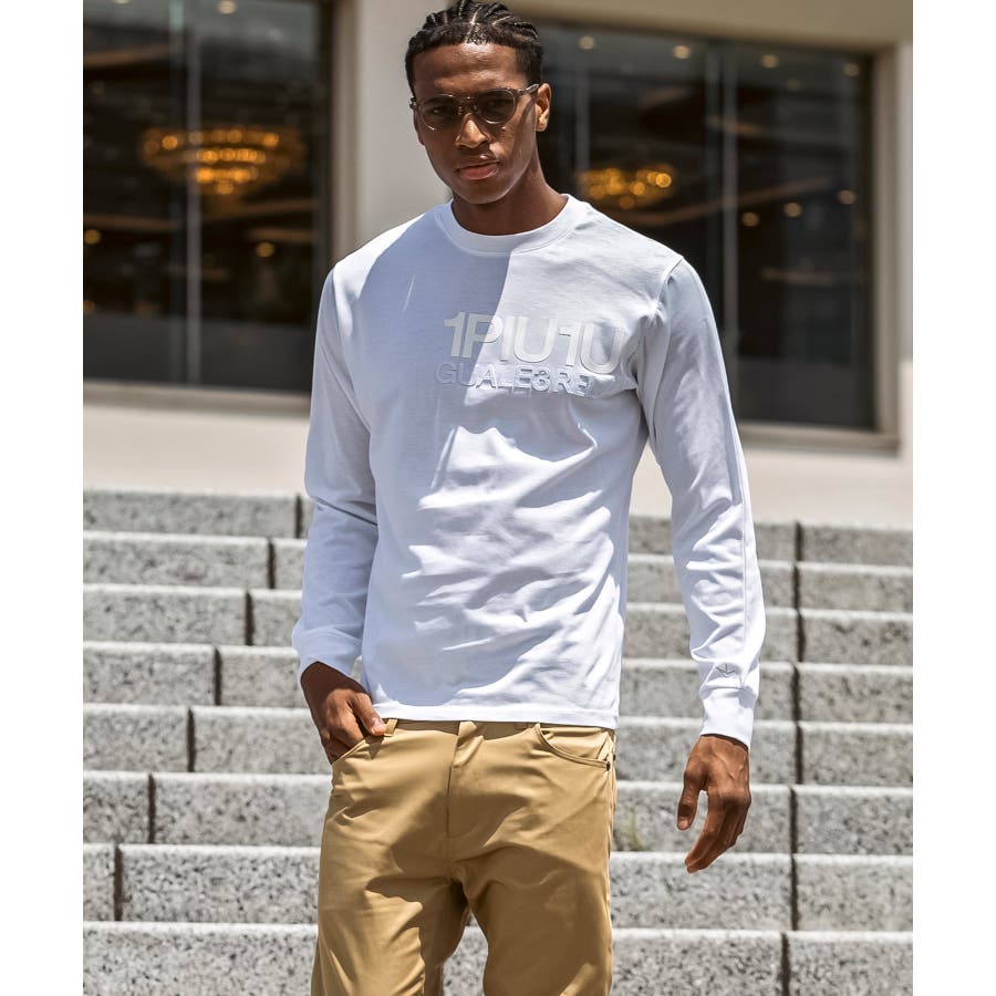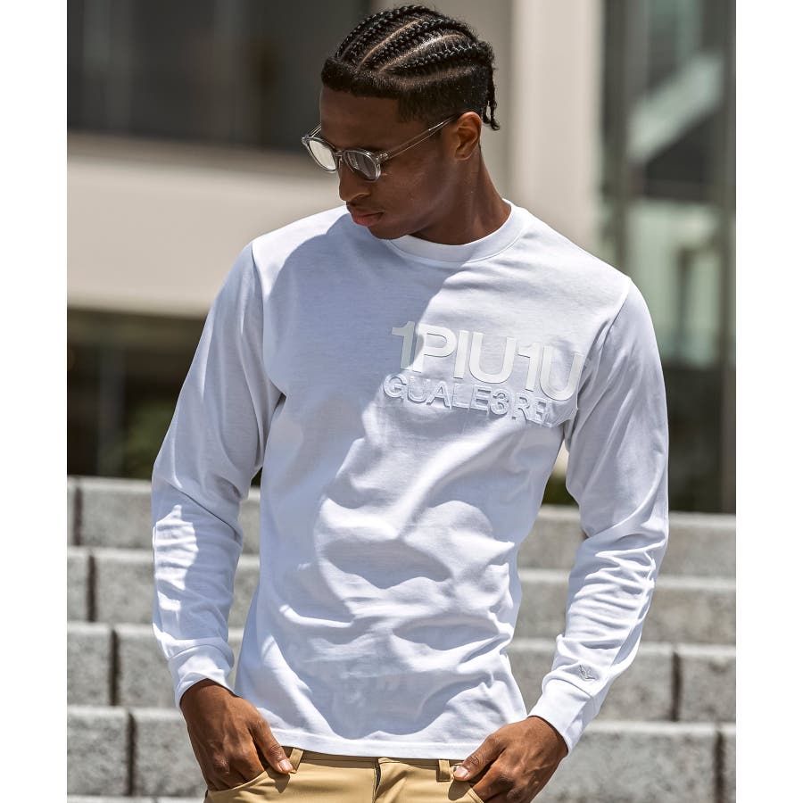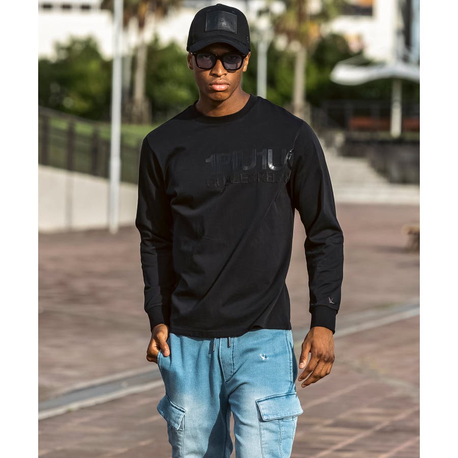 異なる加工のロゴを2段に配置した長袖カットソー。