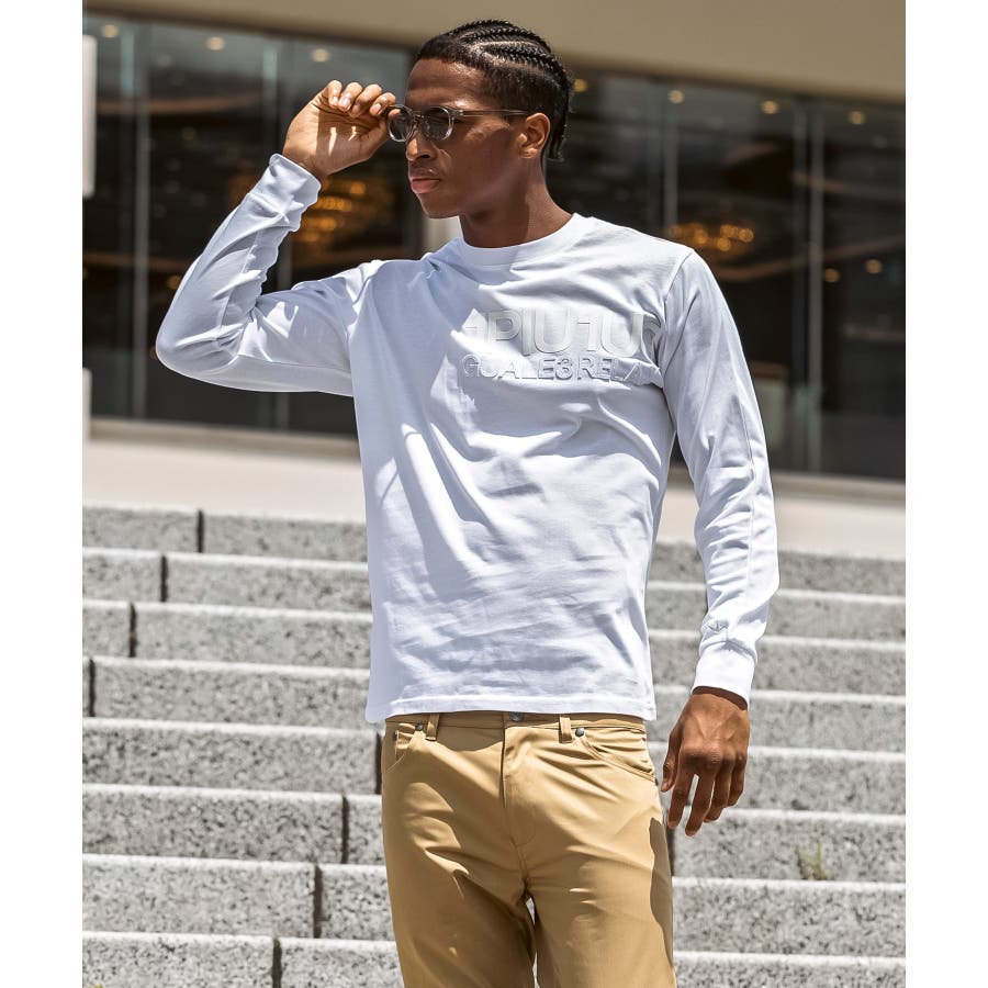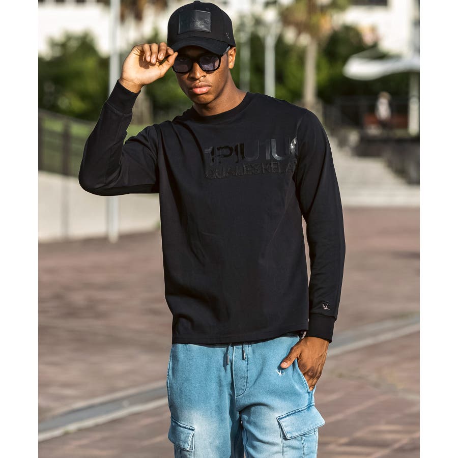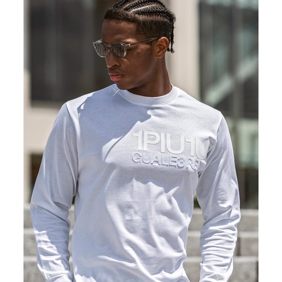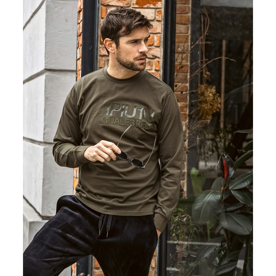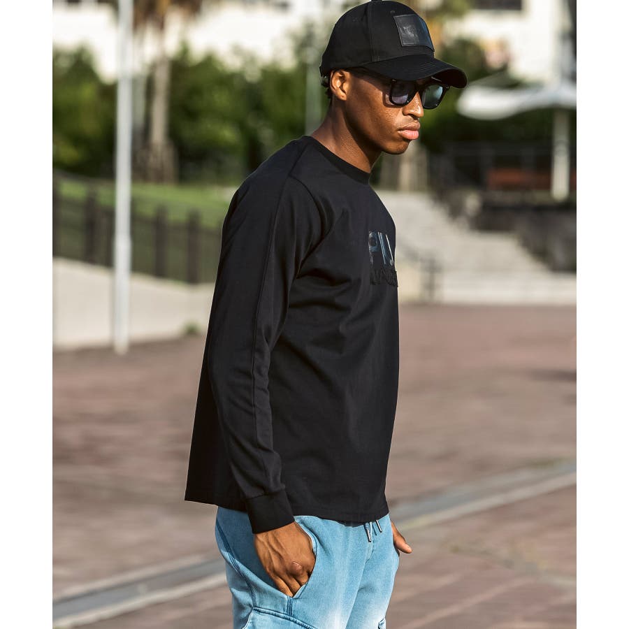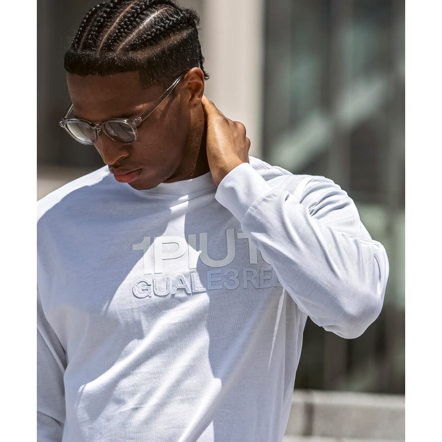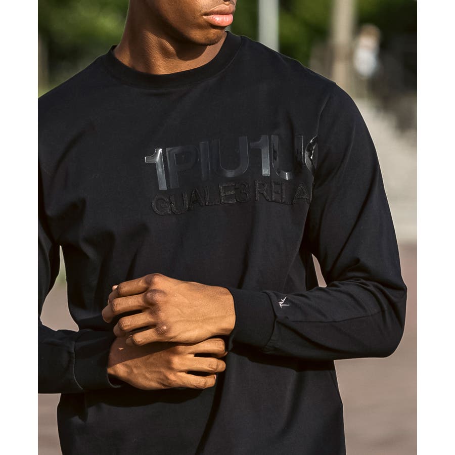 異なる加工のロゴを2段に配置した長袖カットソー。