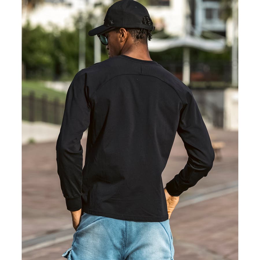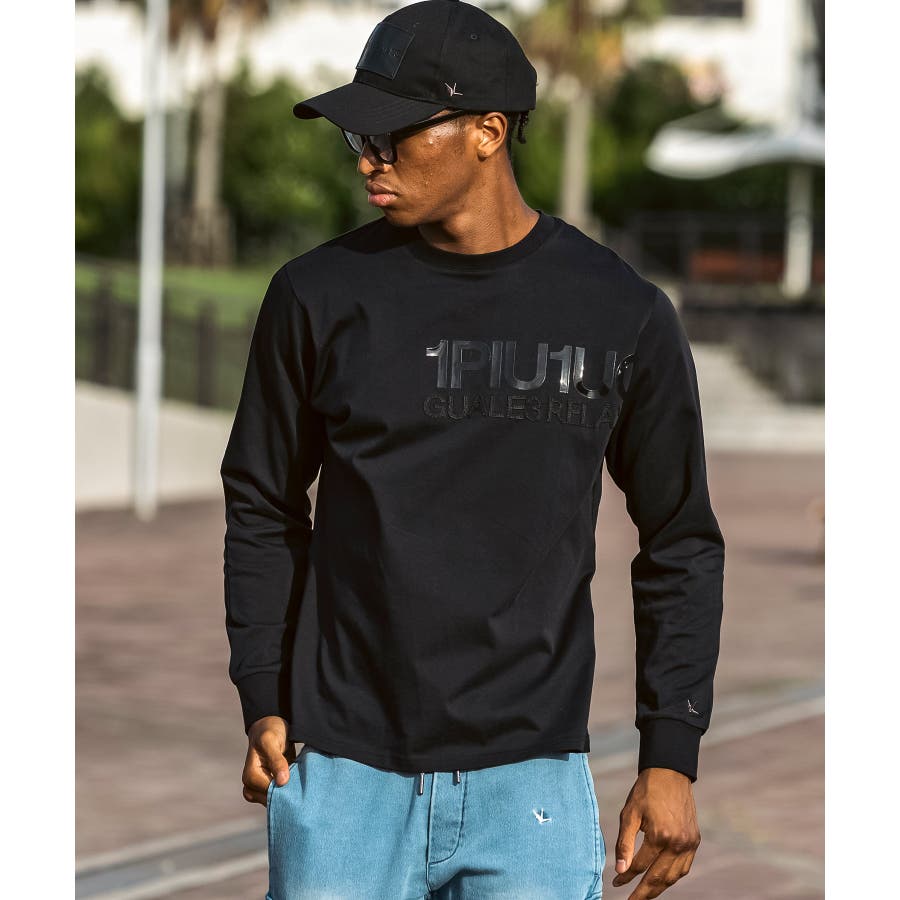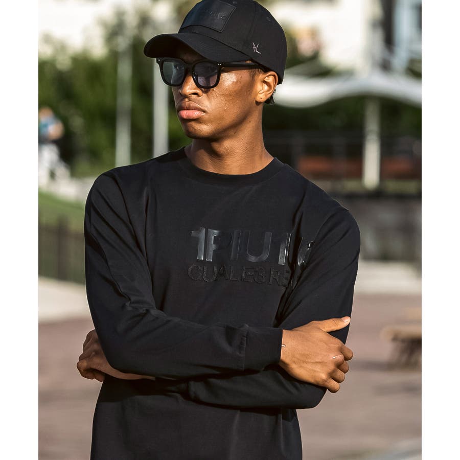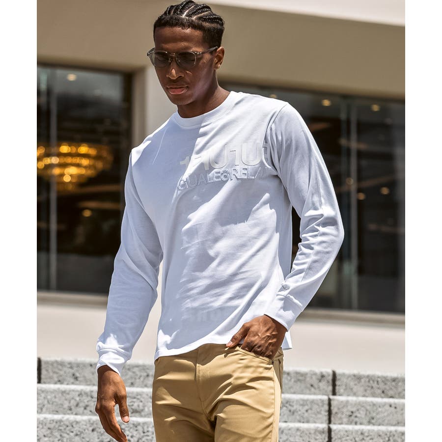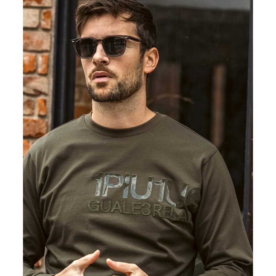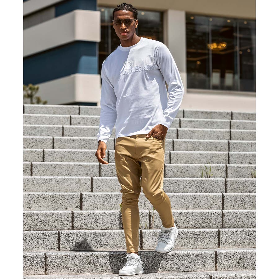 異なる加工のロゴを2段に配置した長袖カットソー。
