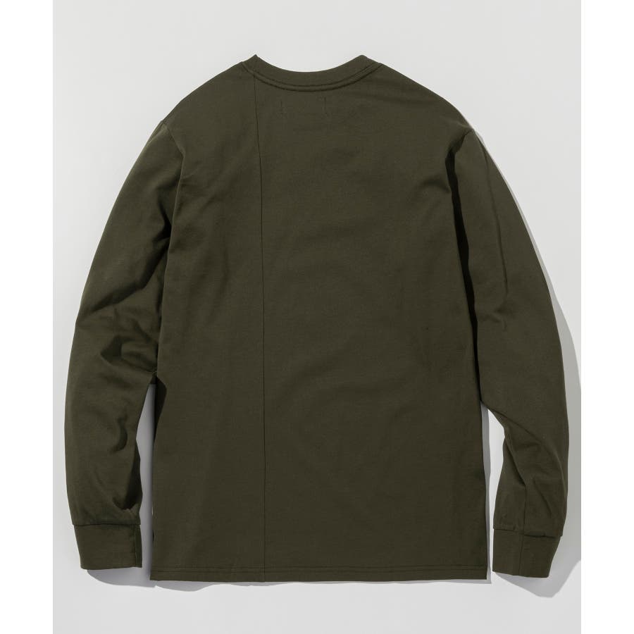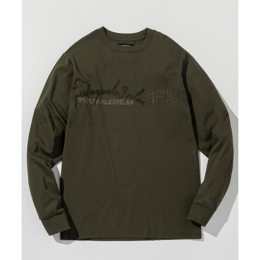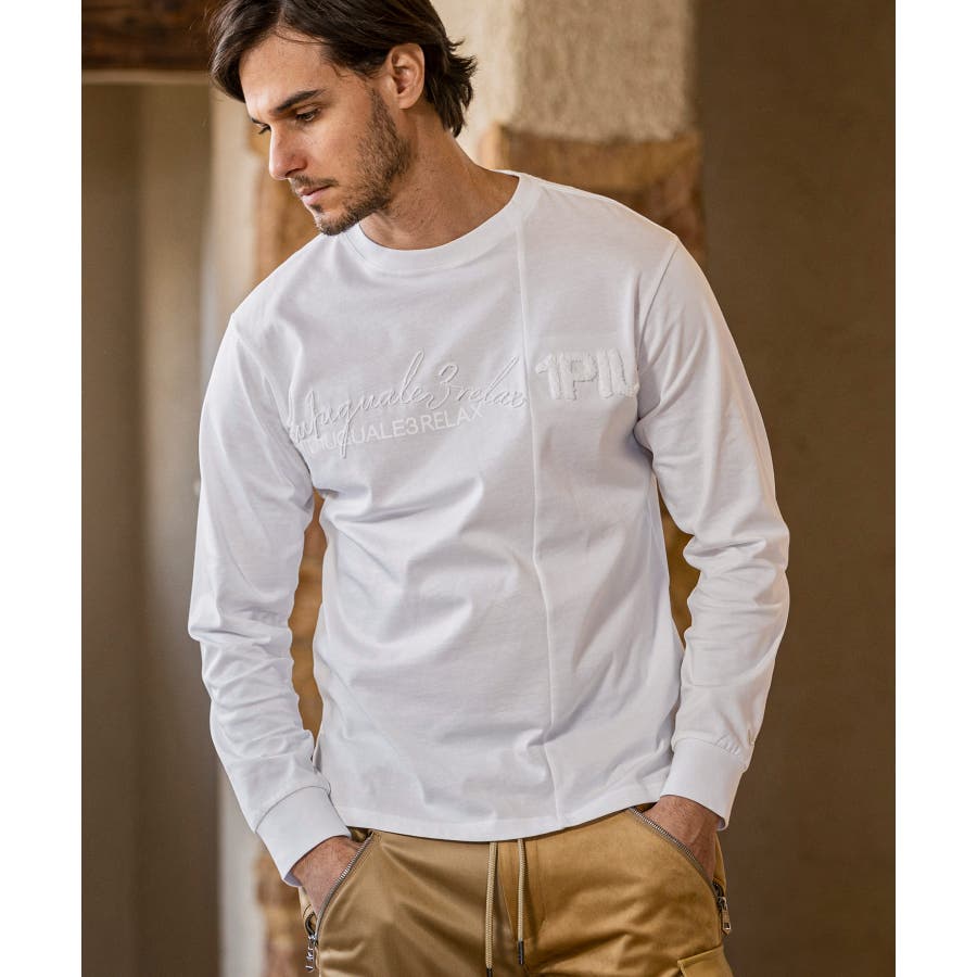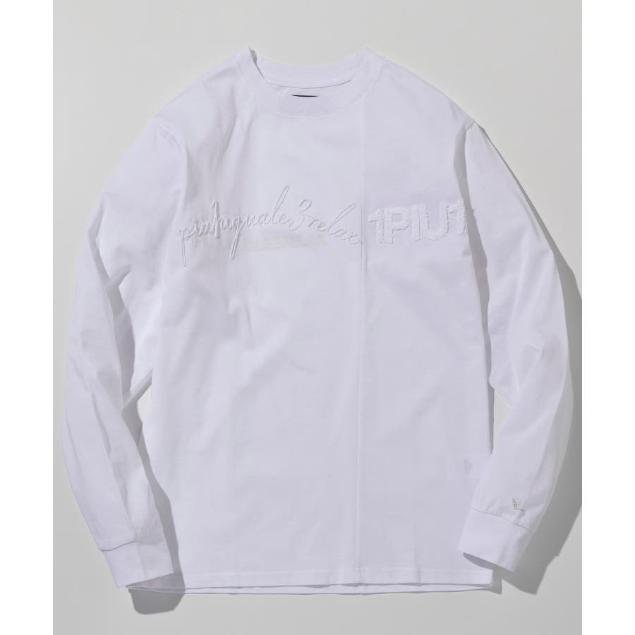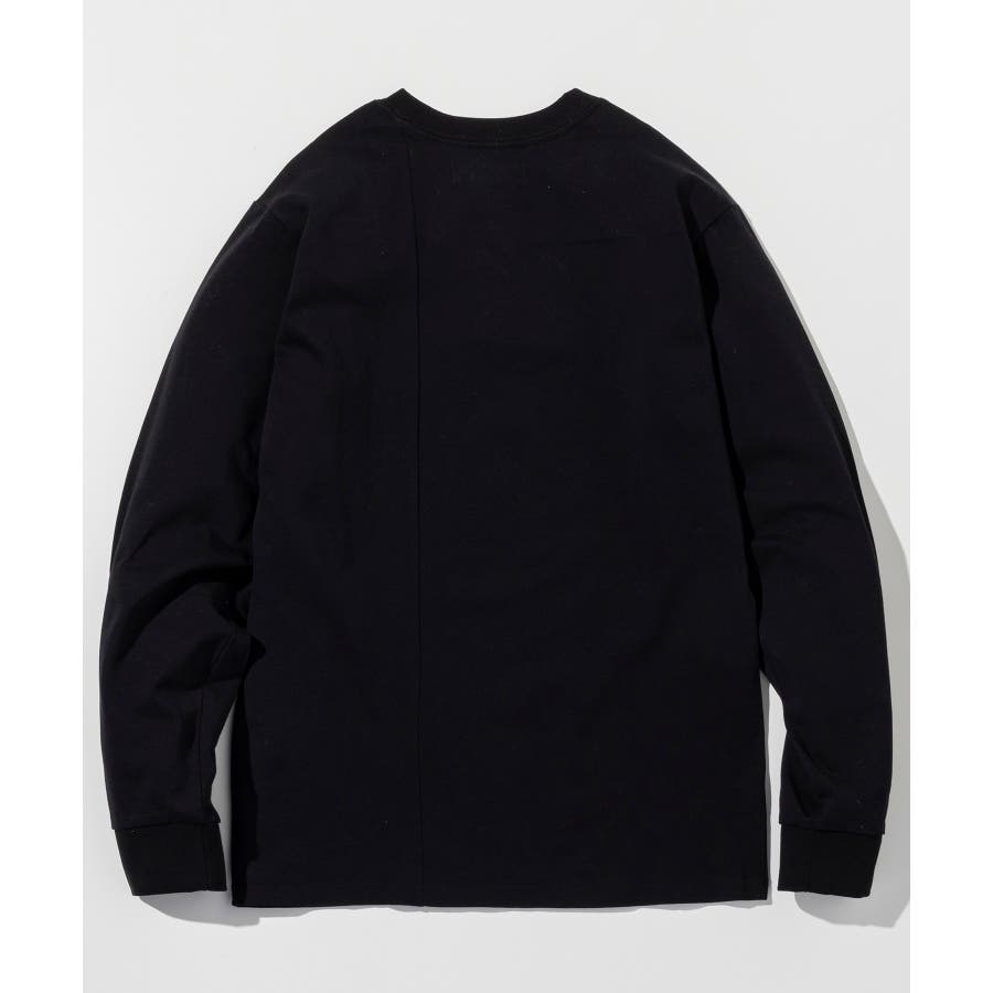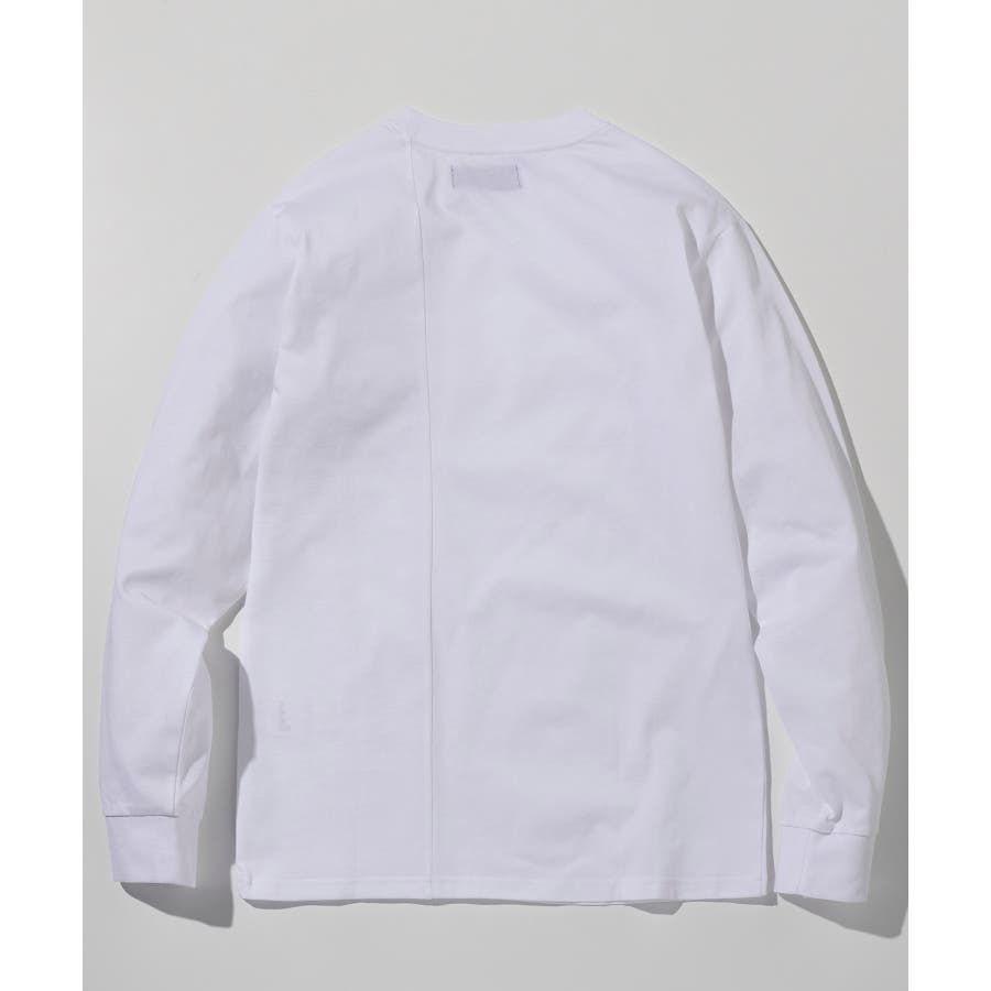 左右で異なる加工のロゴを配置したスウィッチングデザインの長袖カットソー。