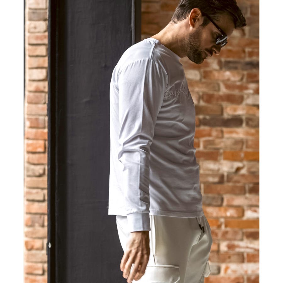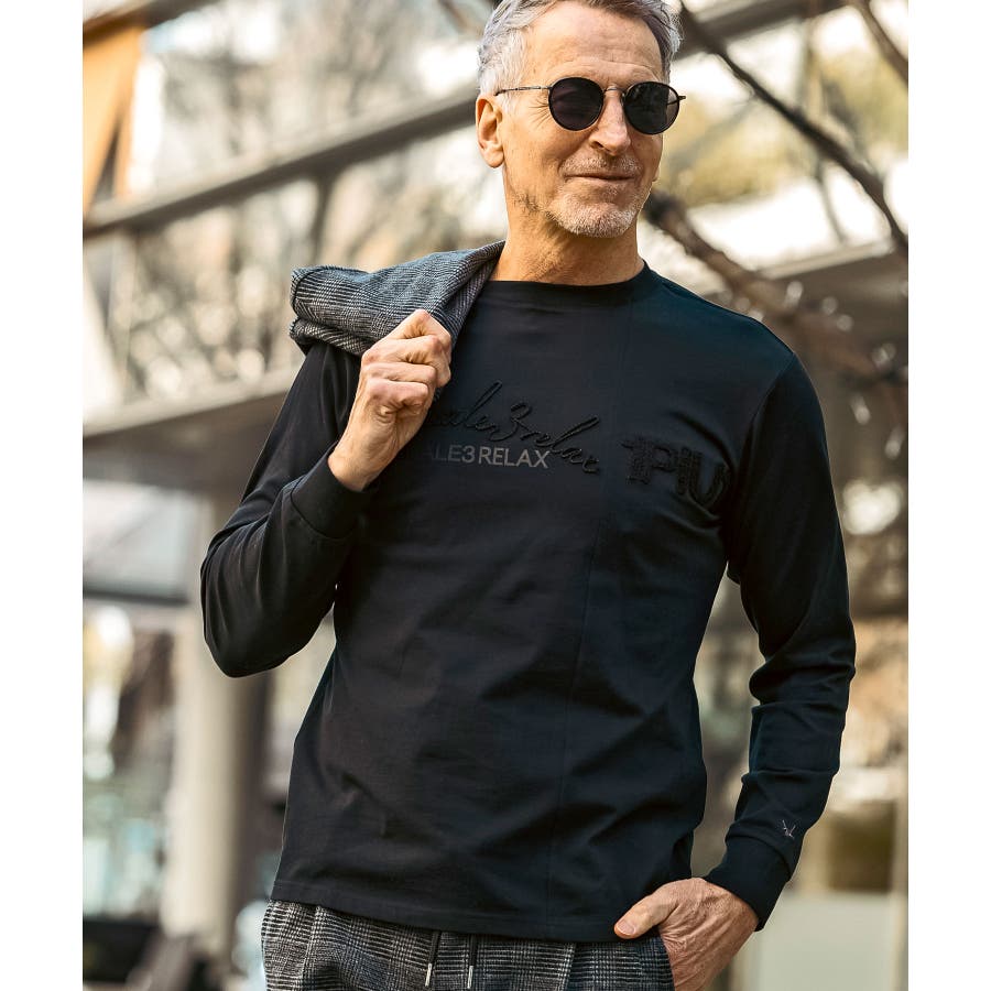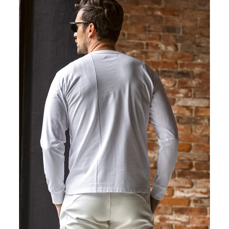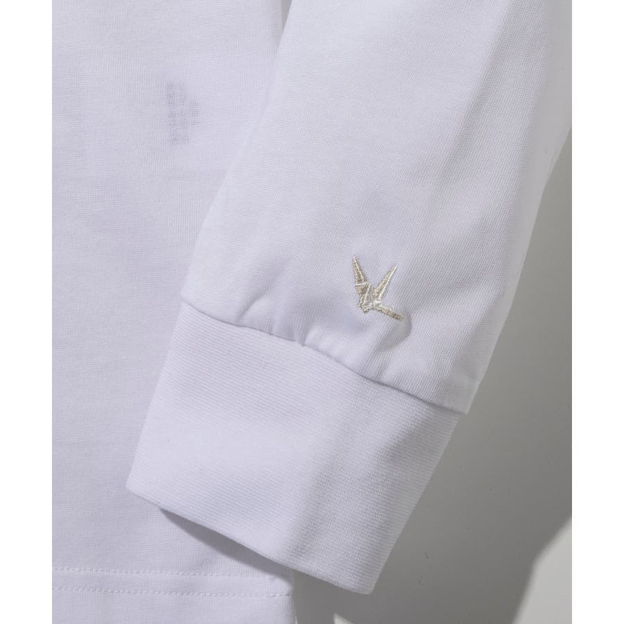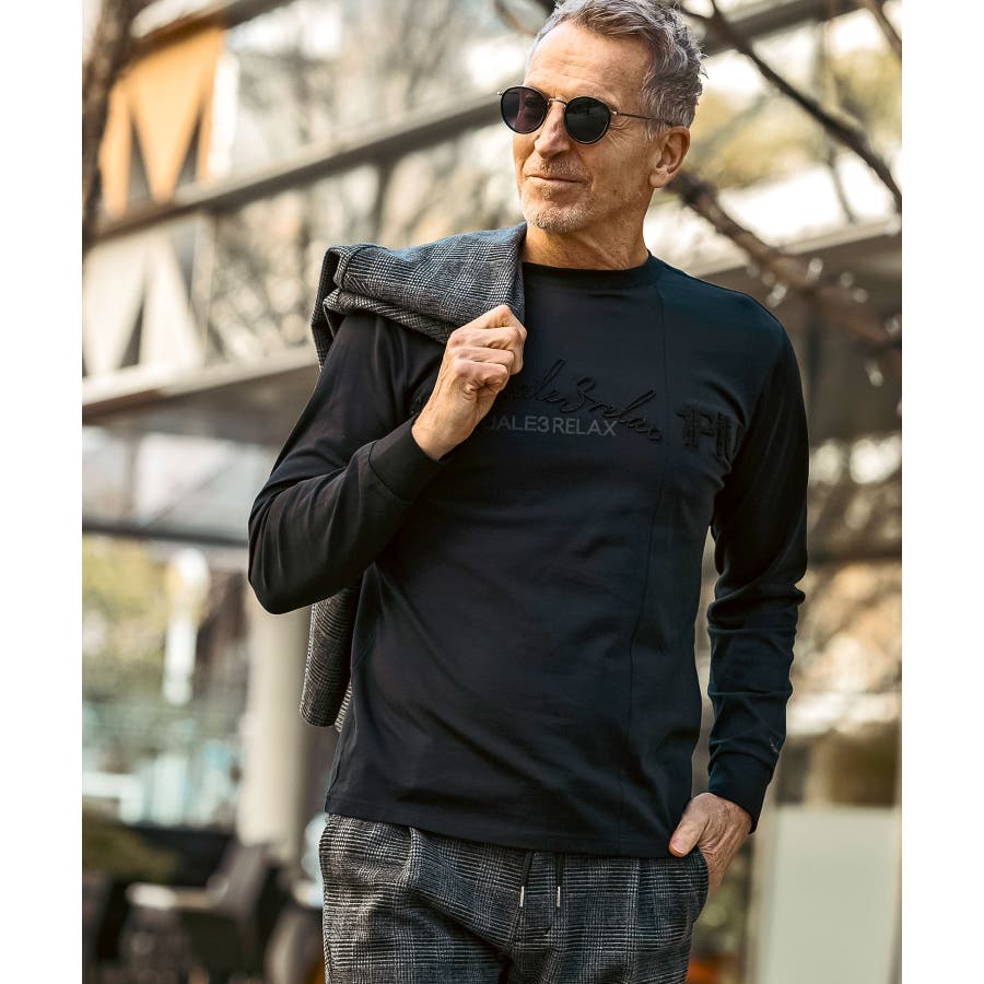 左右で異なる加工のロゴを配置したスウィッチングデザインの長袖カットソー。