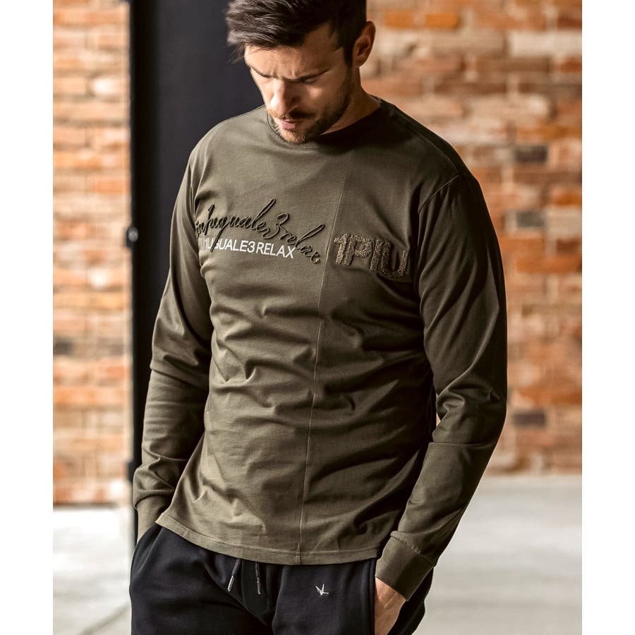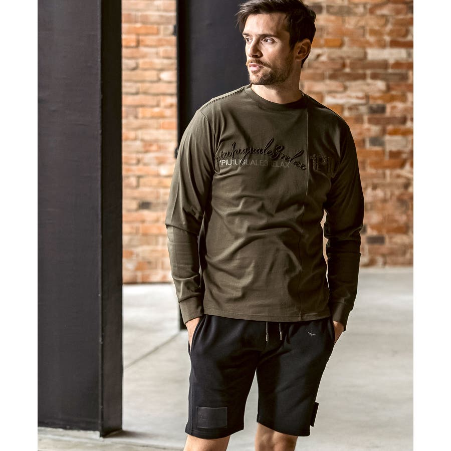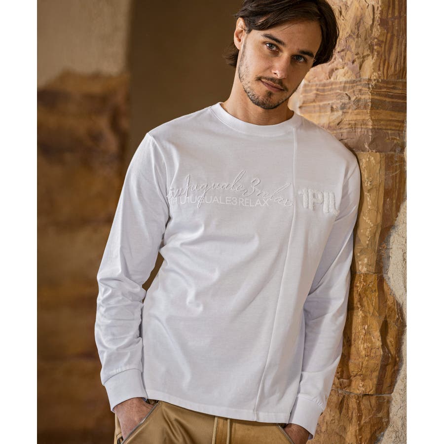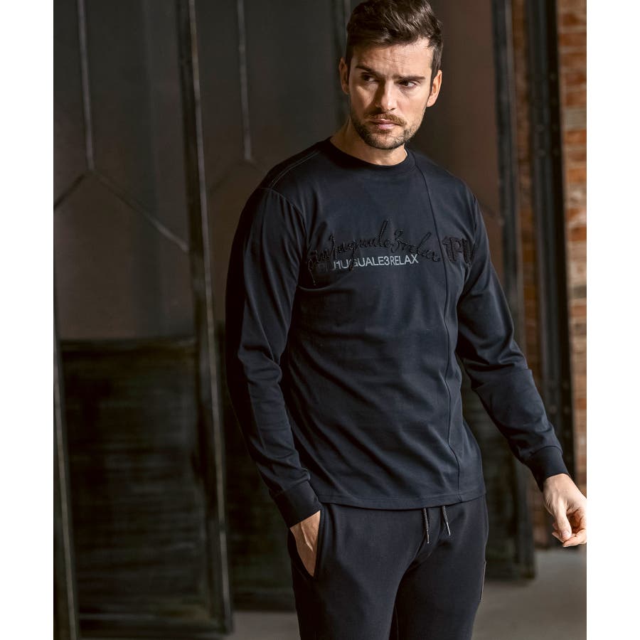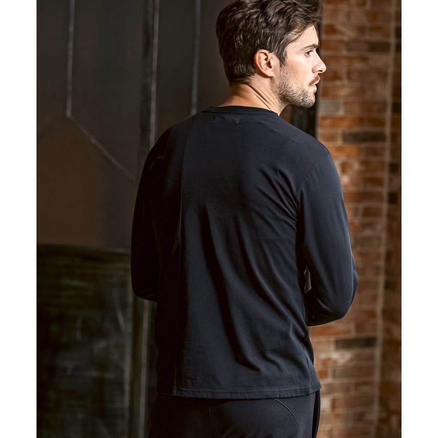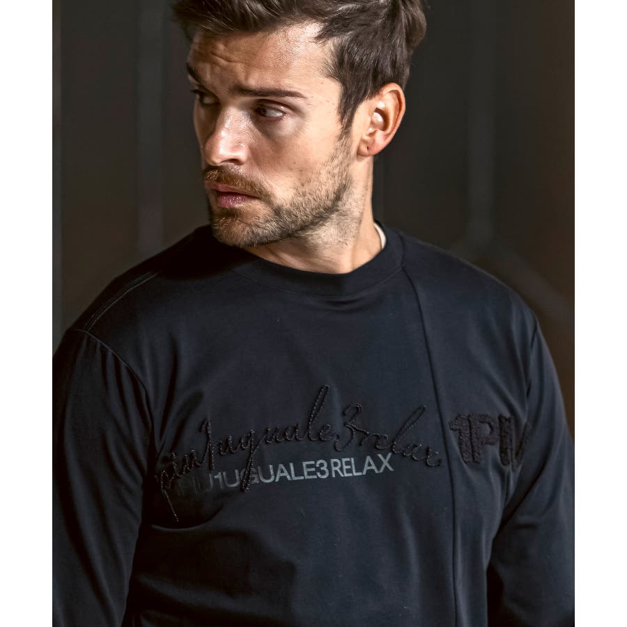 左右で異なる加工のロゴを配置したスウィッチングデザインの長袖カットソー。