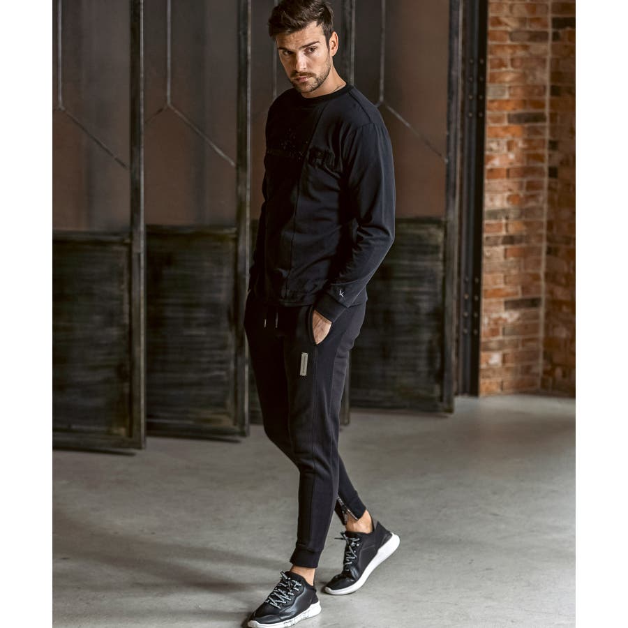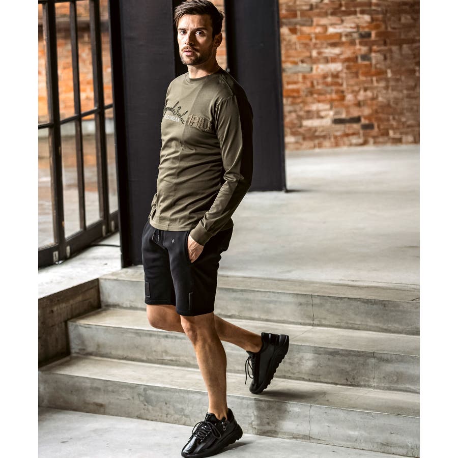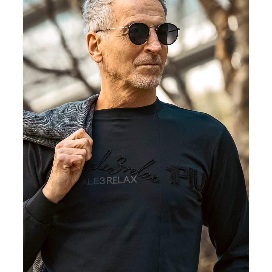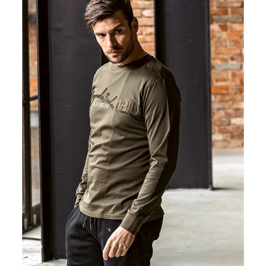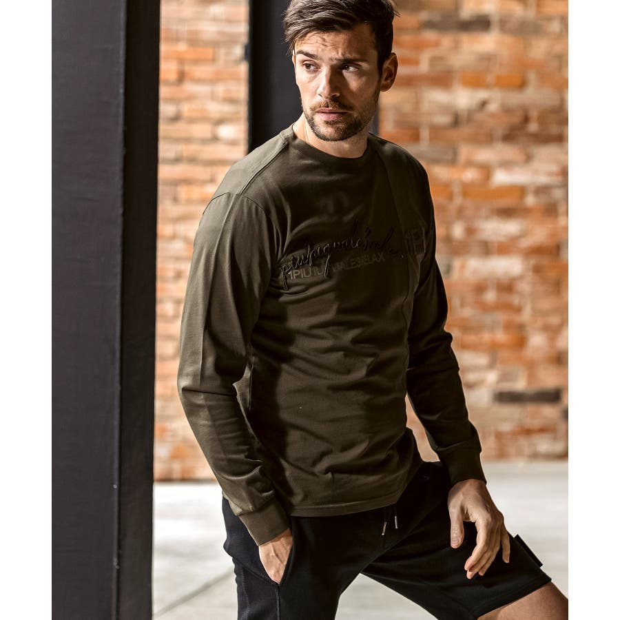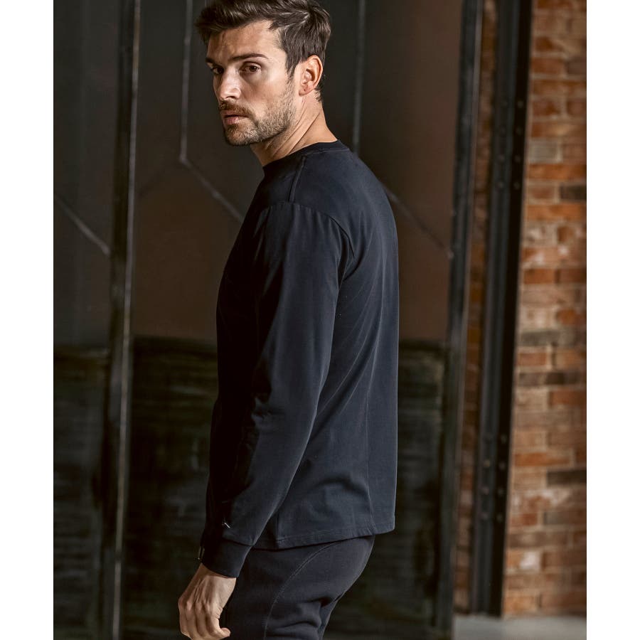 左右で異なる加工のロゴを配置したスウィッチングデザインの長袖カットソー。