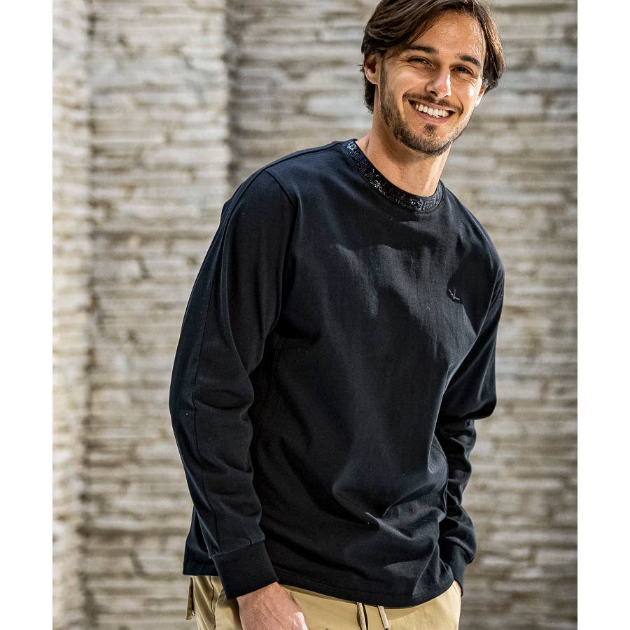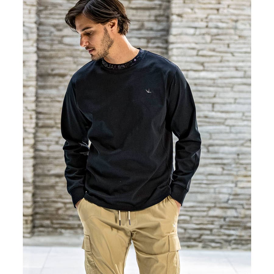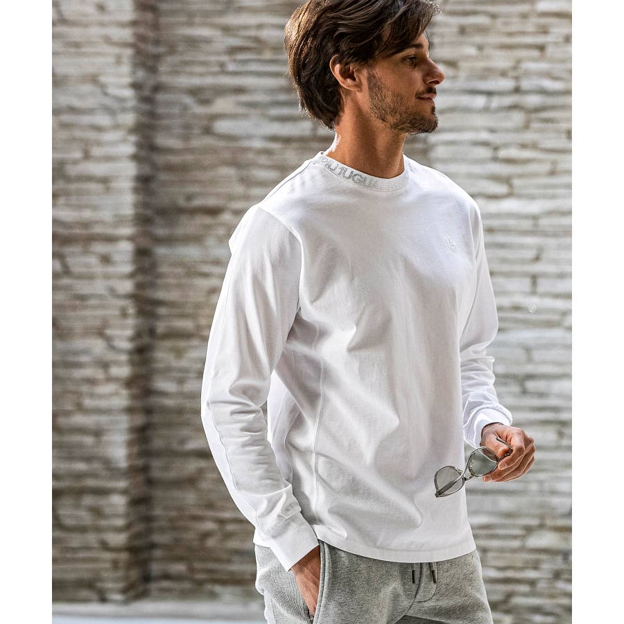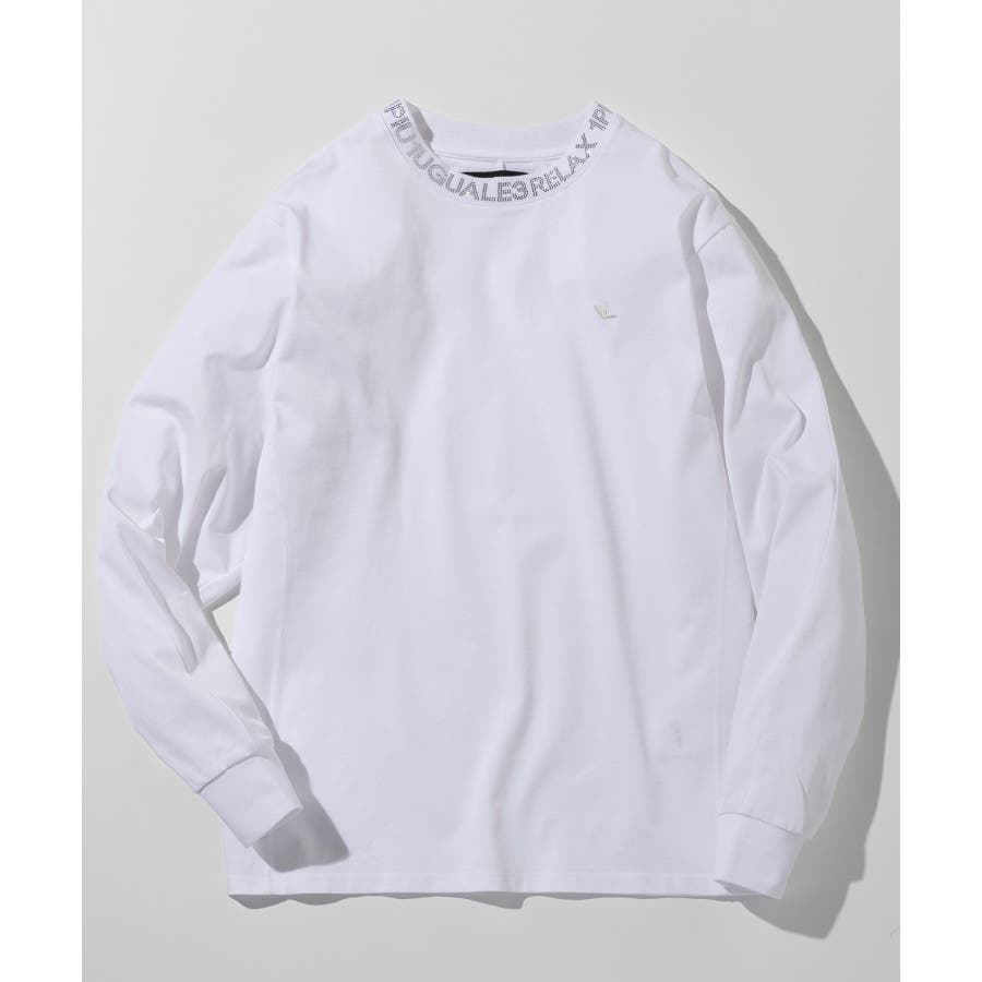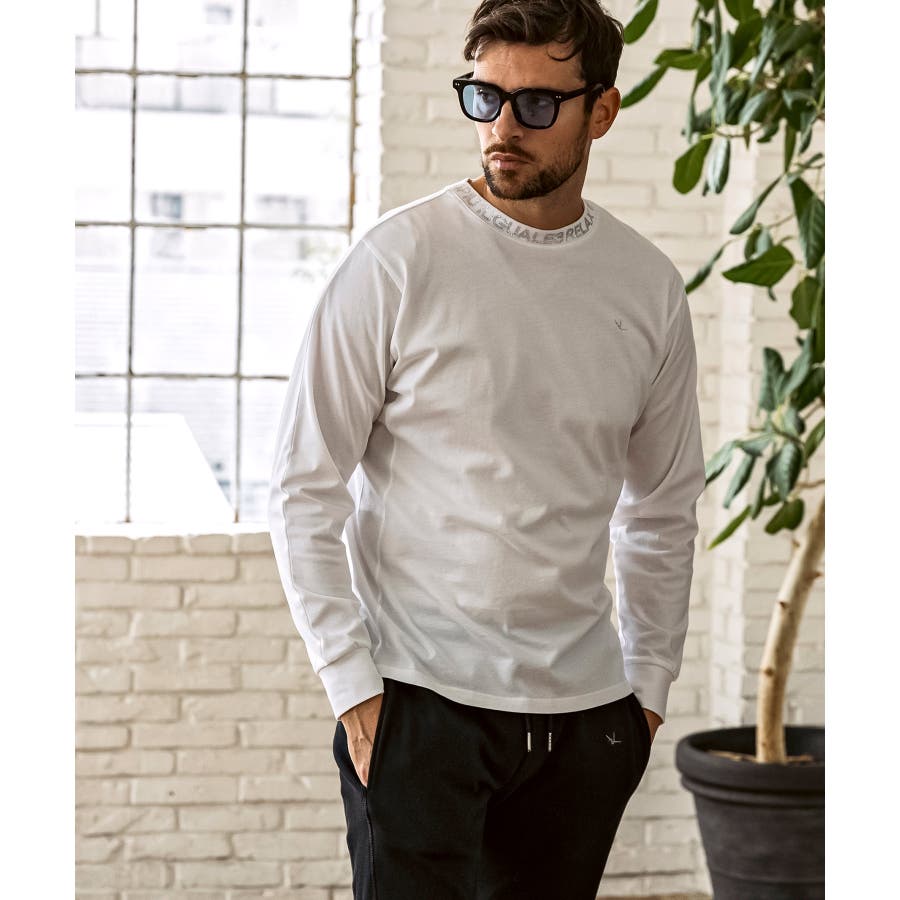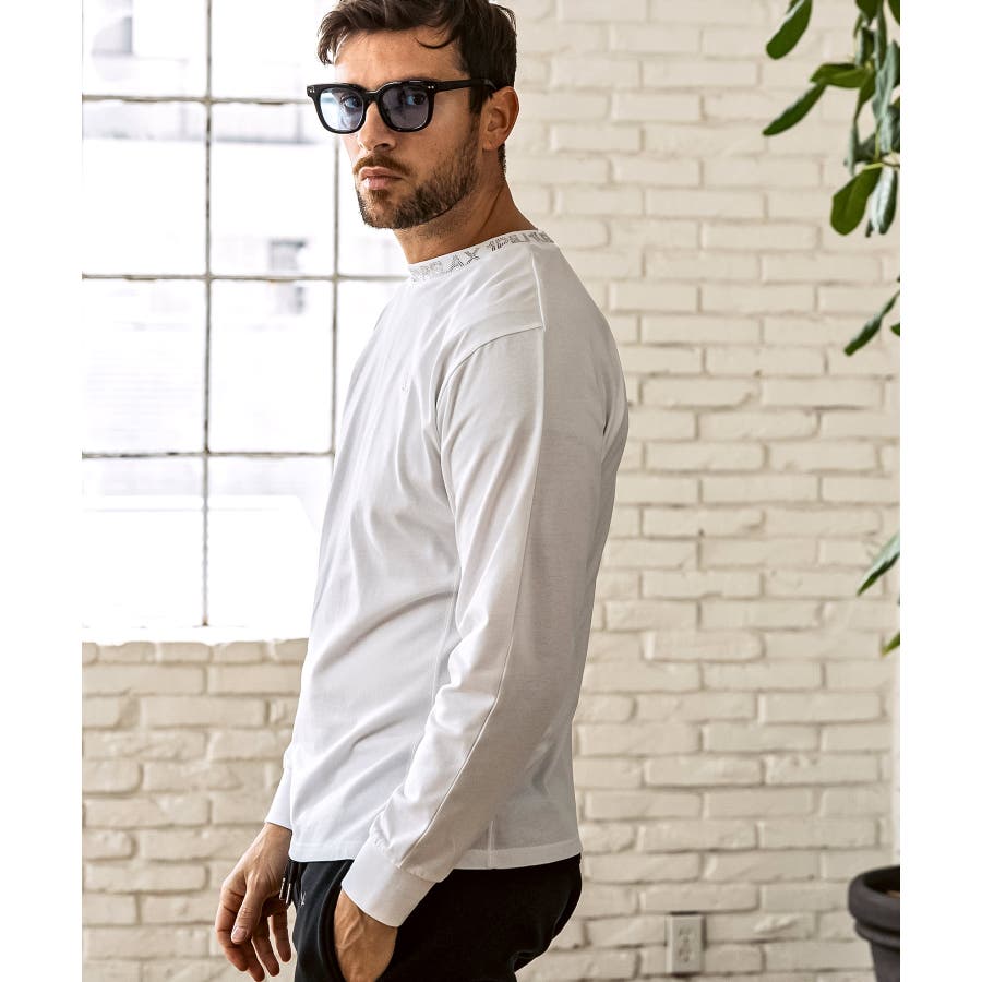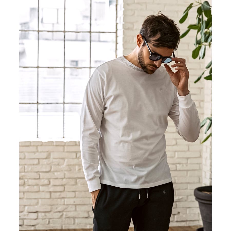首元にブランドロゴをライン状に配置した長袖カットソー。