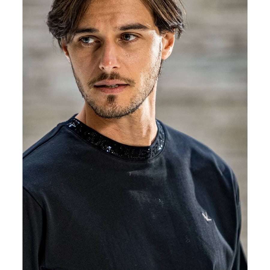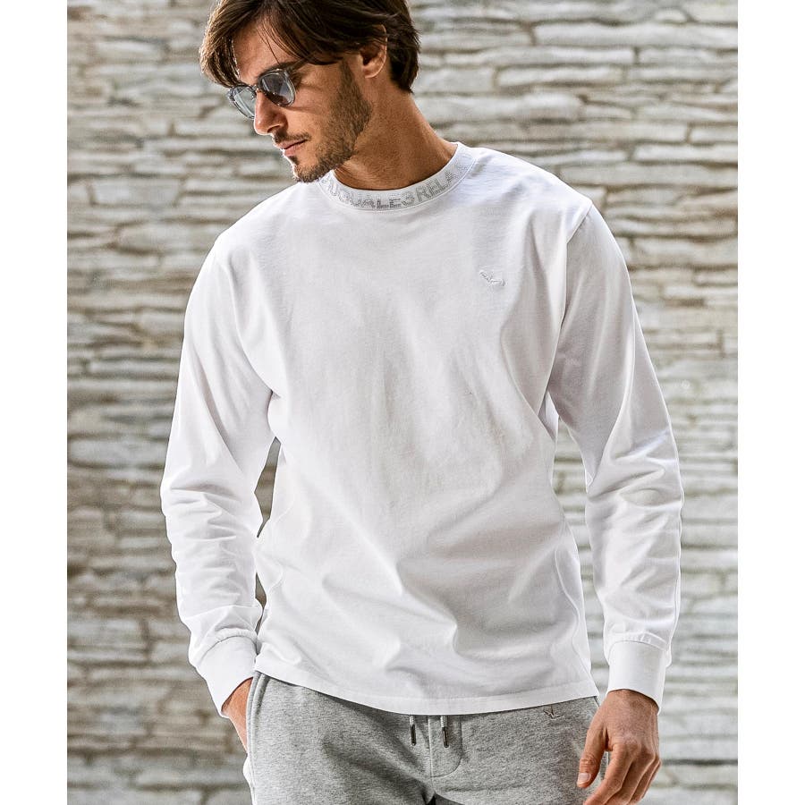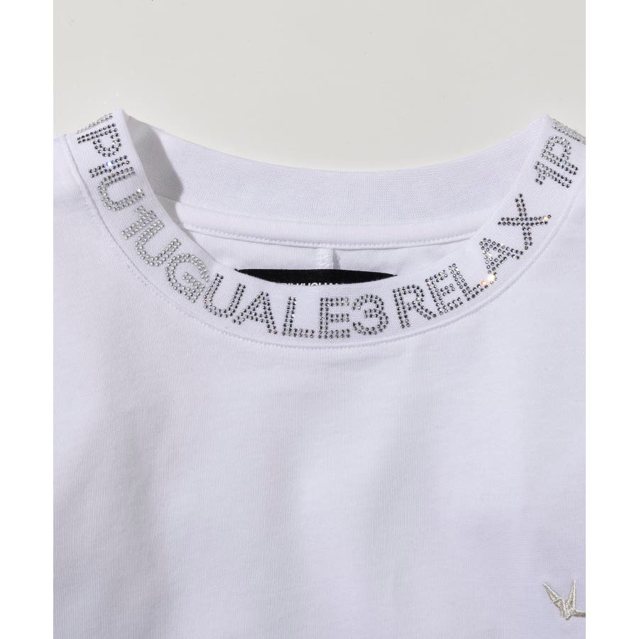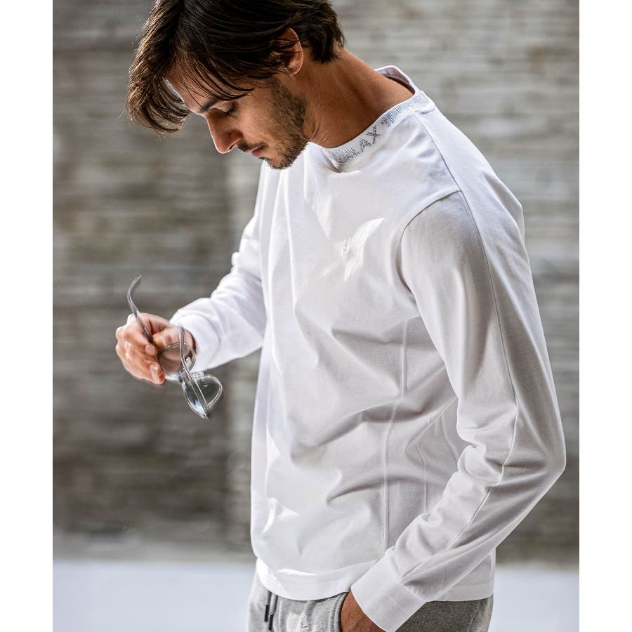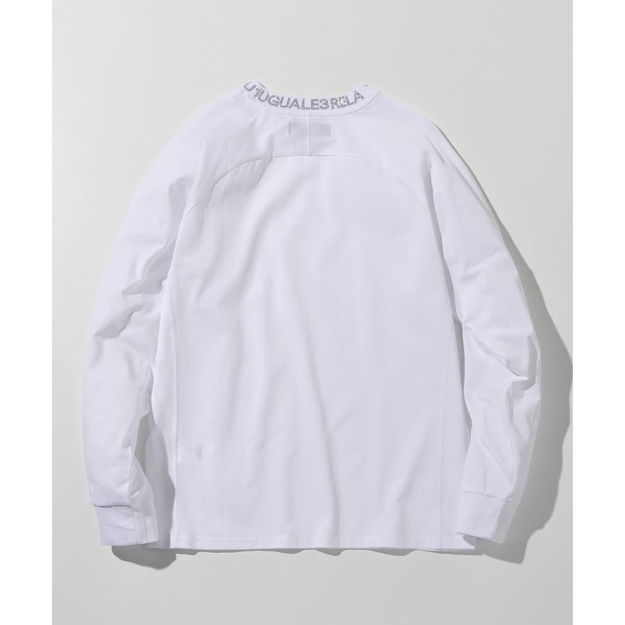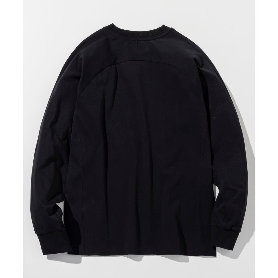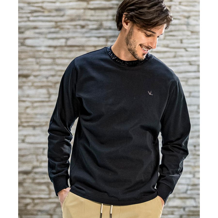首元にブランドロゴをライン状に配置した長袖カットソー。