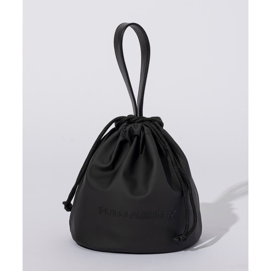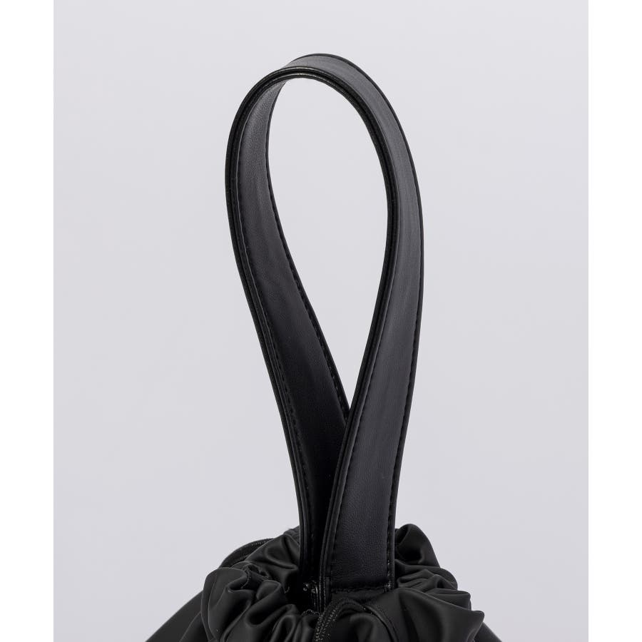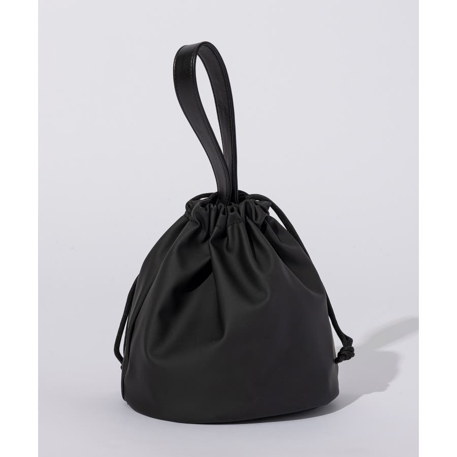 滑らかな艶感が上品なフェイクレザーを採用した巾着型のミニバッグ。
