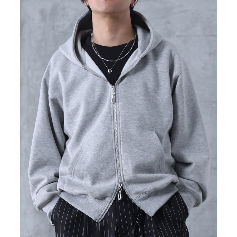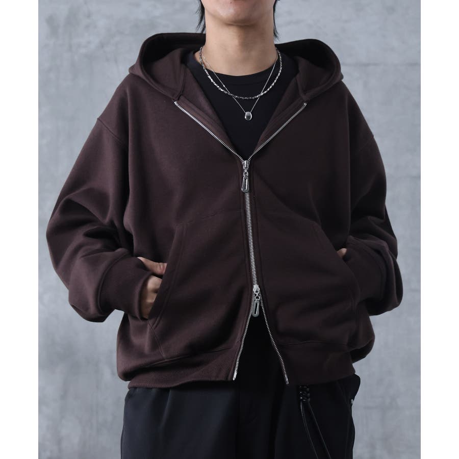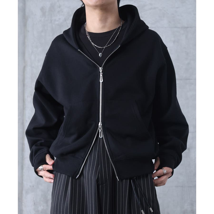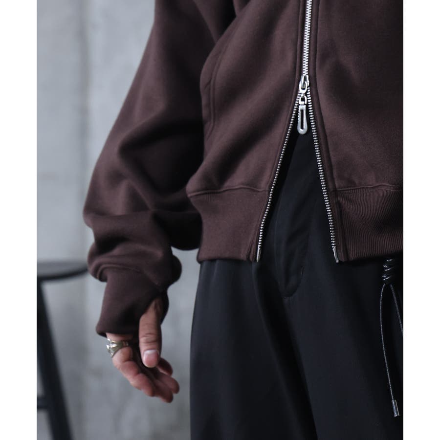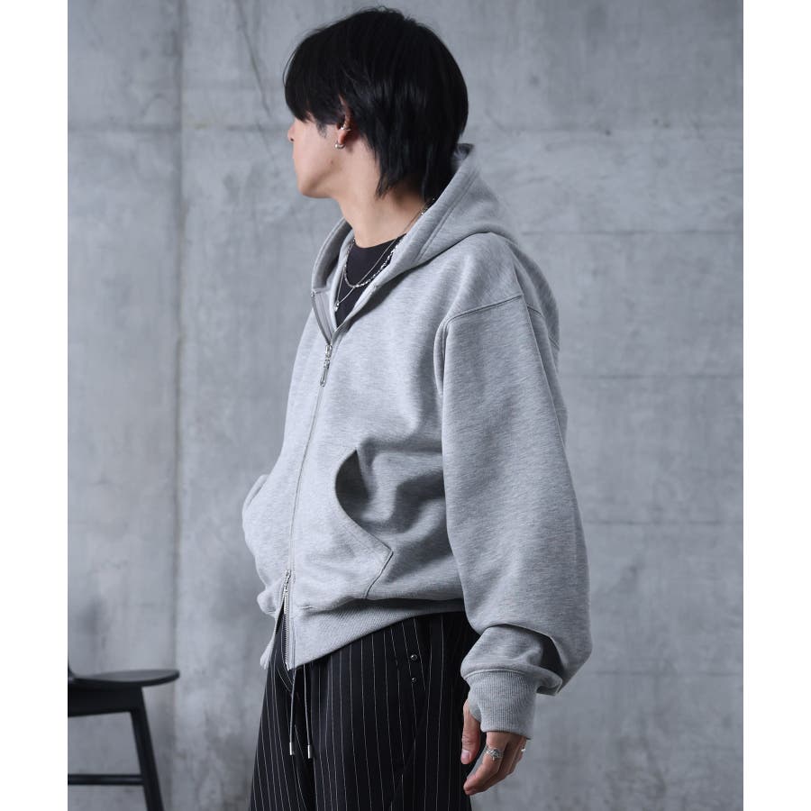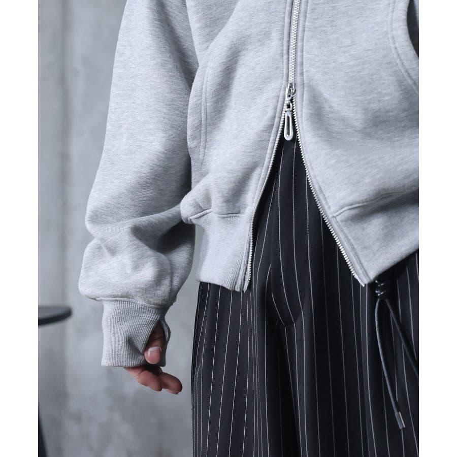 ルーズなシルエットをサムホールで引き締め、スタイルアップも着こなしも自由自在。モードストリートな万能ダブルジップパーカー。