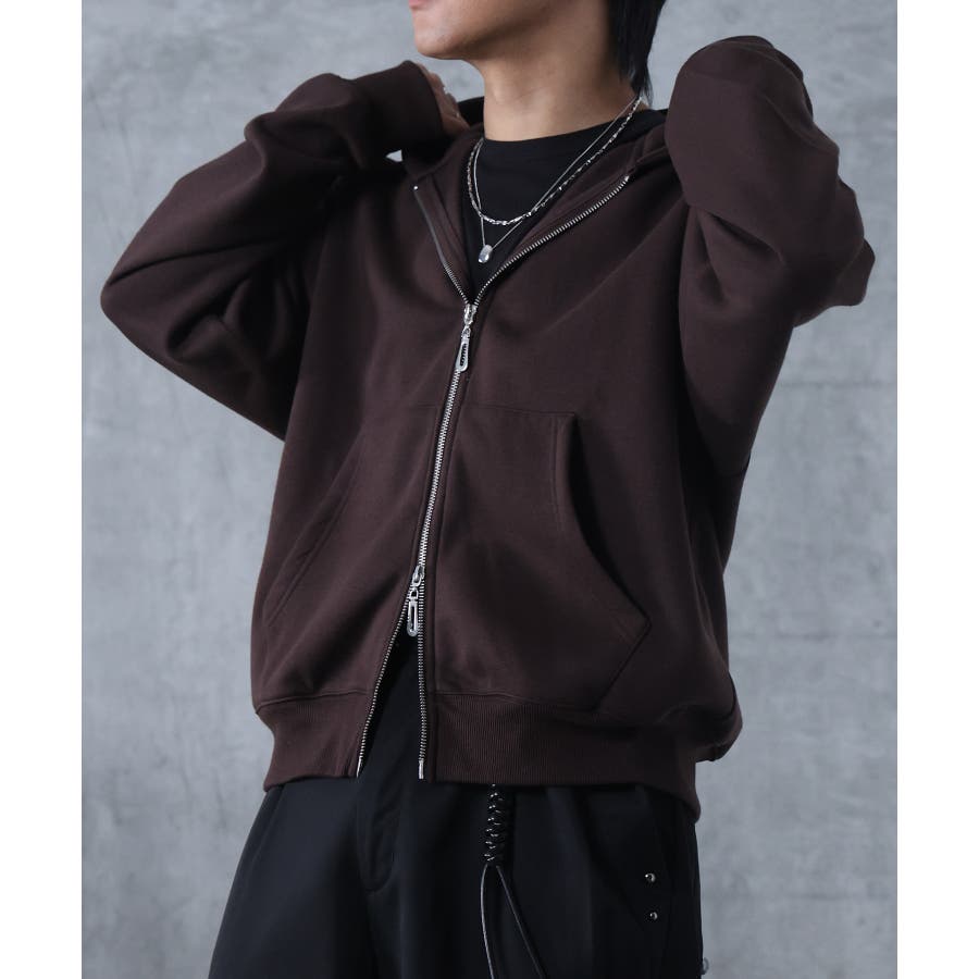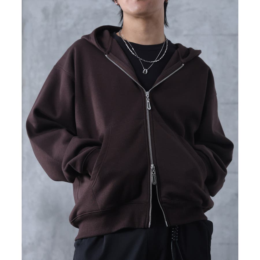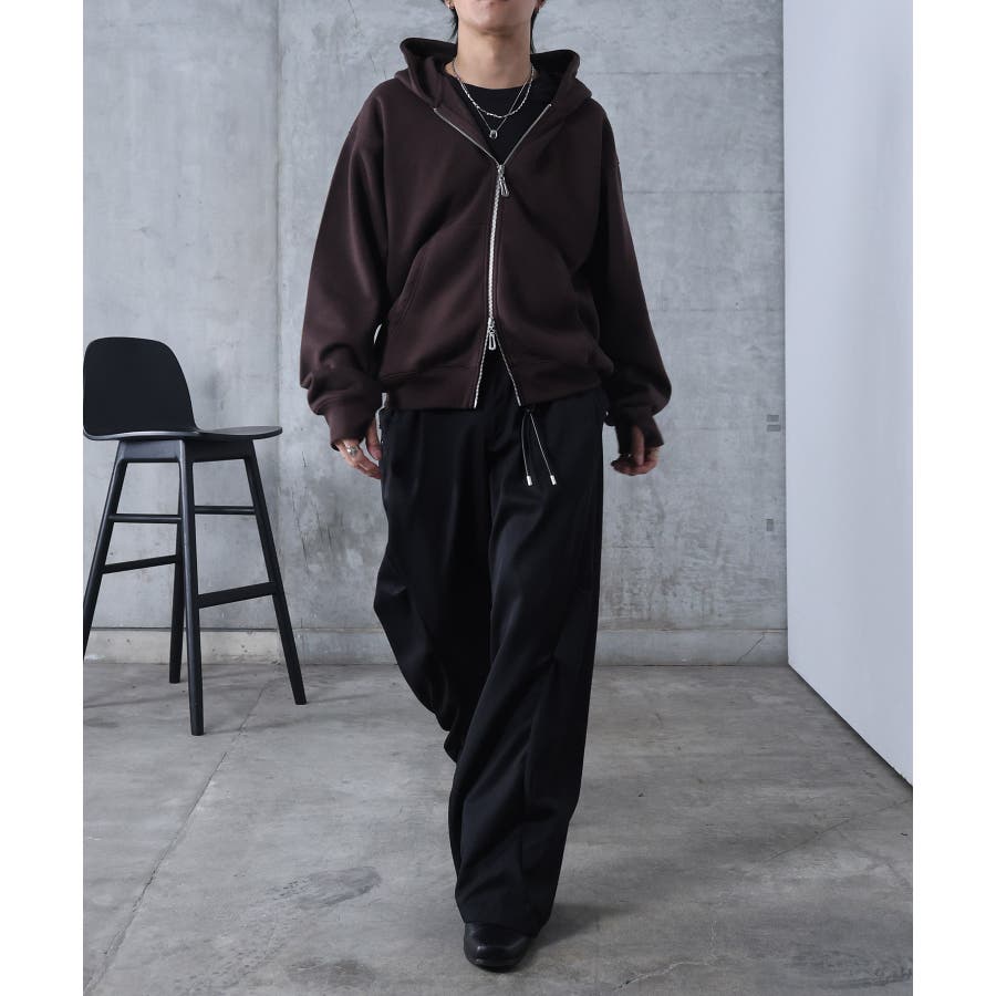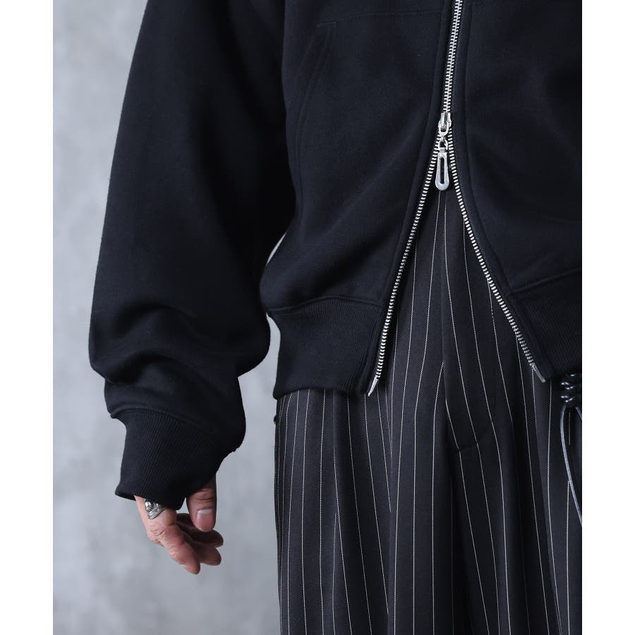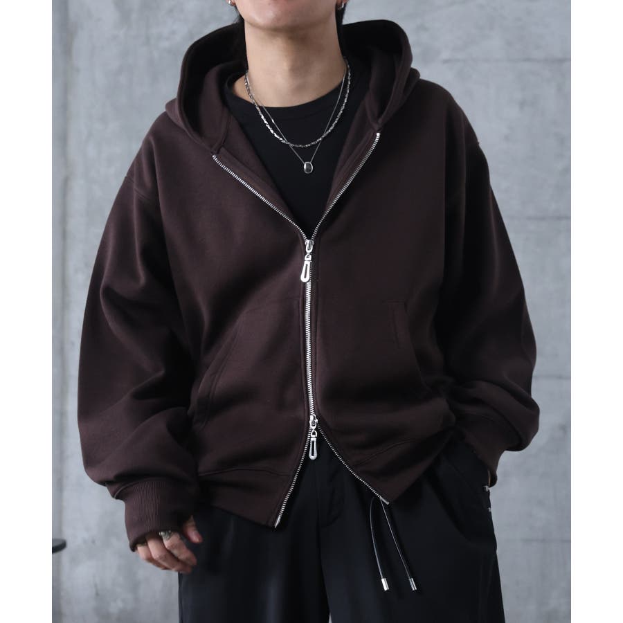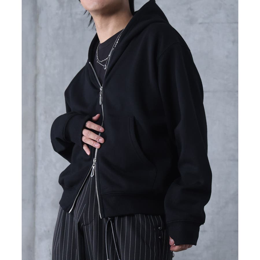 ルーズなシルエットをサムホールで引き締め、スタイルアップも着こなしも自由自在。モードストリートな万能ダブルジップパーカー。