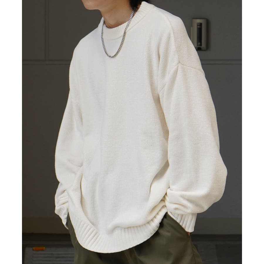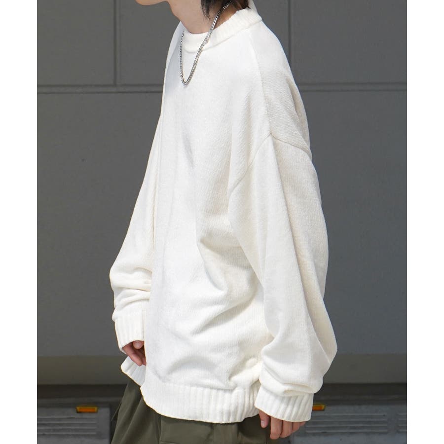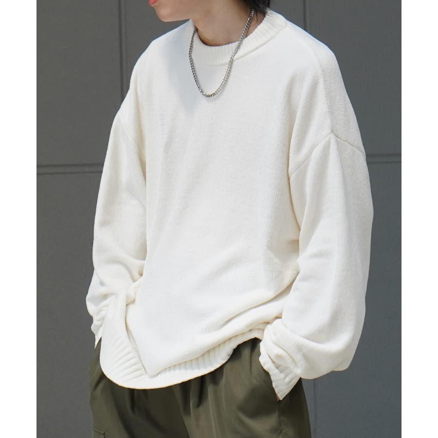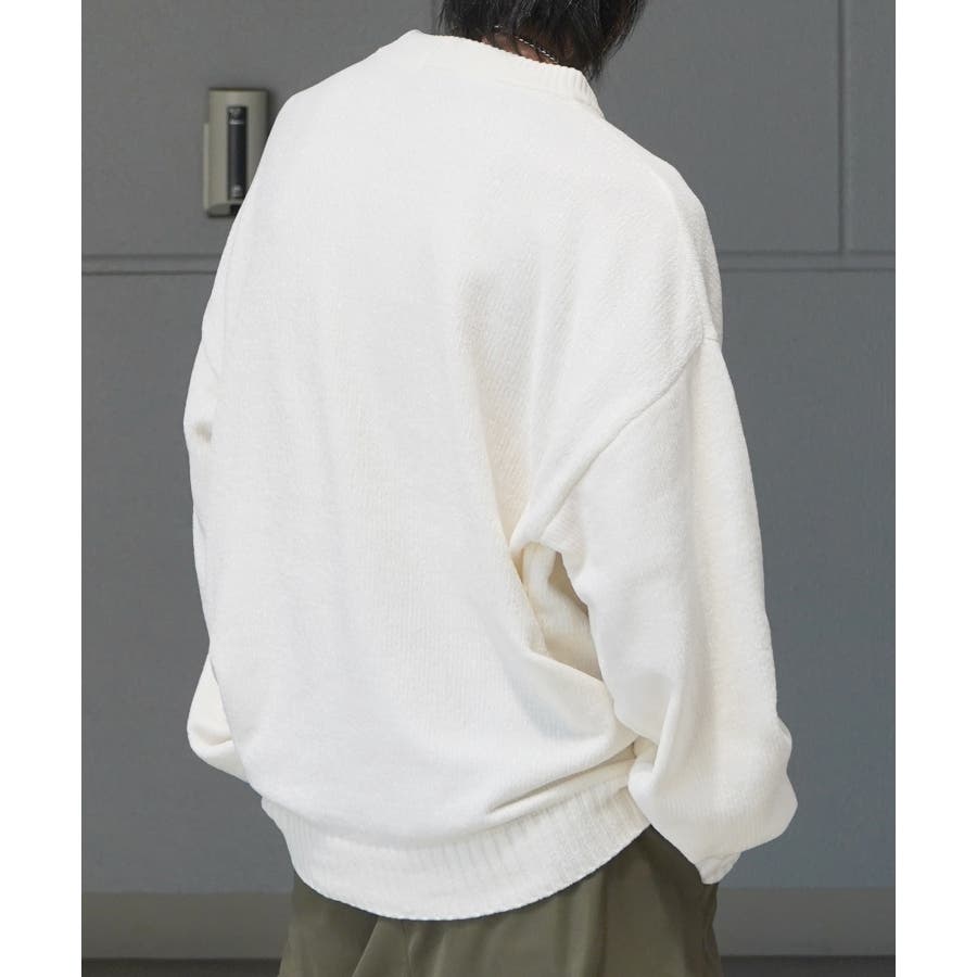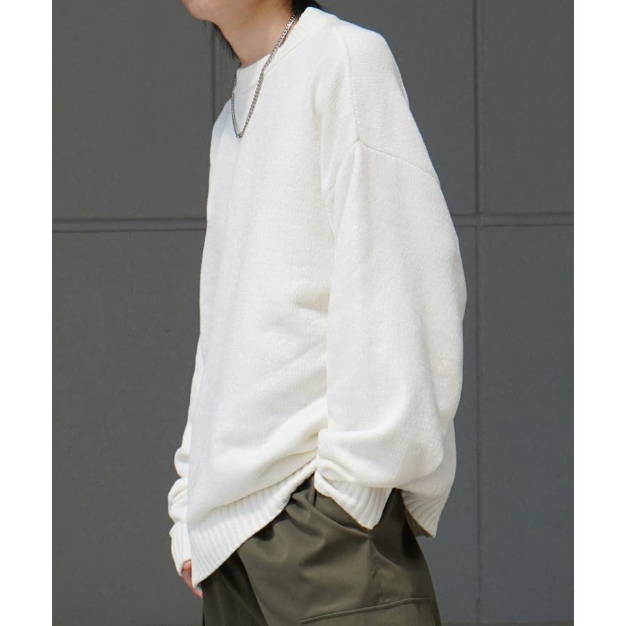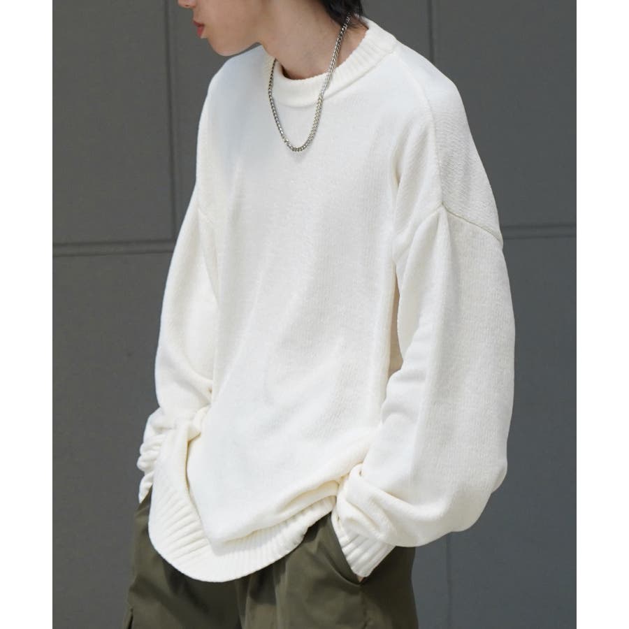 腕部分のデザインが「Loose Hi-neck KNIT」と異なり袖幅から袖リブ幅にかけて幅を狭め、ビッグシルエットが表現できるようなハリ感も残したため、手首付近に生地が溜まり程よいボリューム感を演出するデザインに。