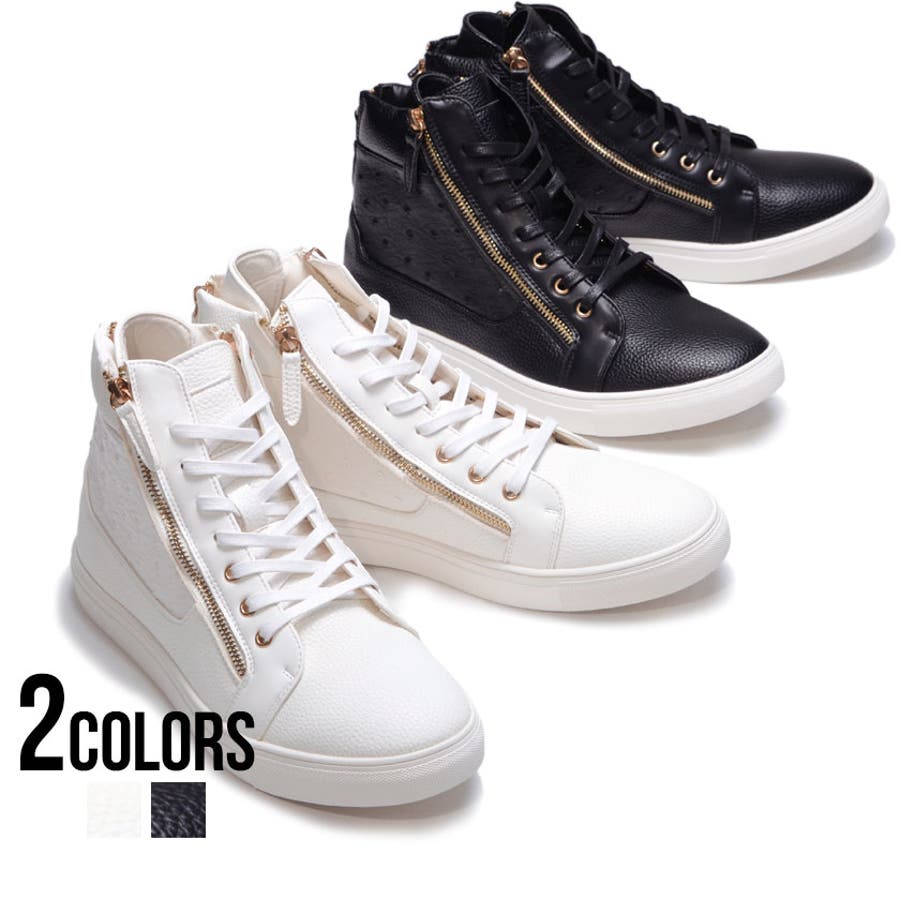 上品なPUレザーの光沢感と、ゴールドのジップがアクセントのハイカットスニーカー。