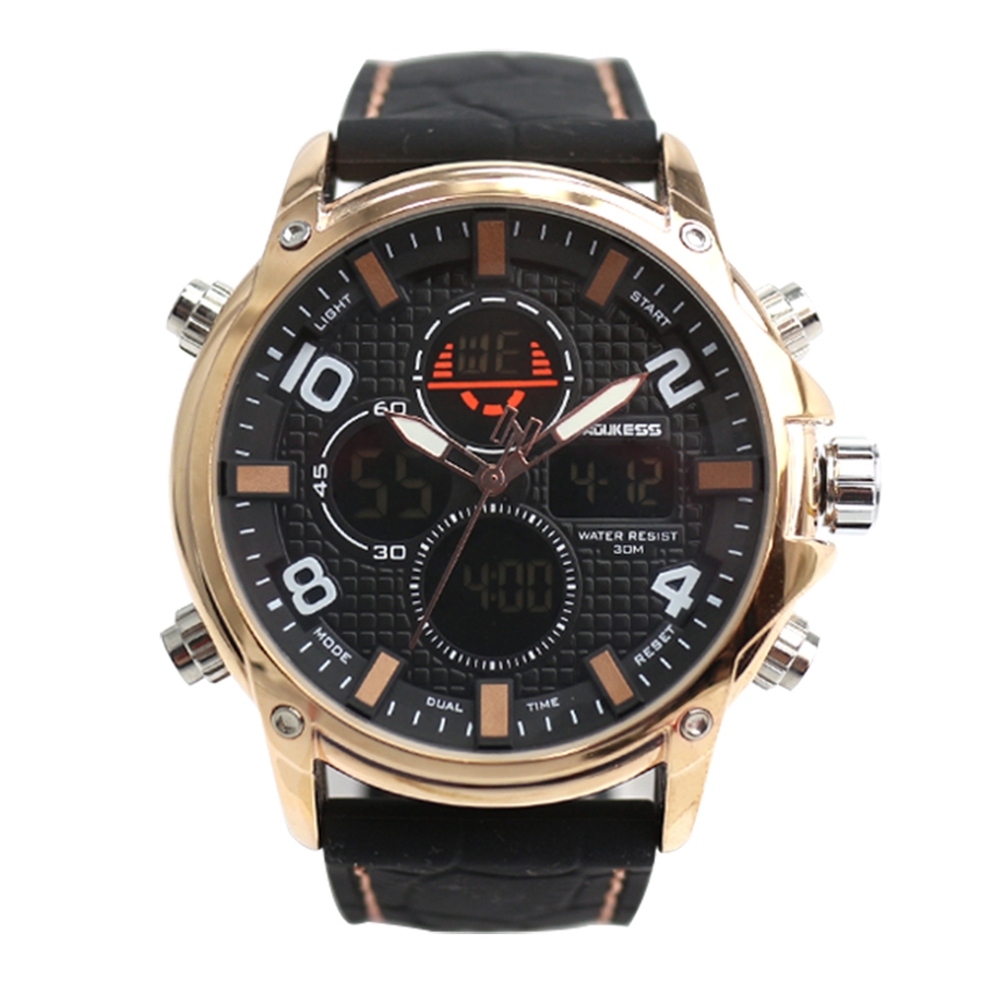 日付はもちろん、月、曜日も表示し、アラームと時報、さらにストップウォッチ機能までもが搭載されたマルチファンクションモデル(多機能モデル)で、アナログ表示とデジタル表示で違う時間を表示できるので、デュアルタイム表示も可能です。