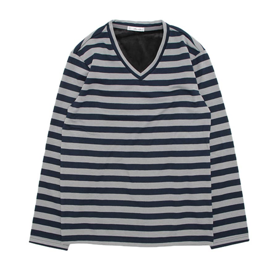 裏ベロアが魅力のボーダー柄Vネックトレーナー。