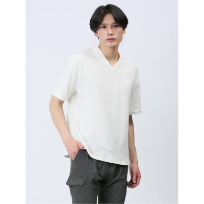 シンプル過ぎない存在感のあるVネックの半袖Tシャツです。斜めに畝が入ったカルゼ柄でスタイリッシュな雰囲気に仕上げています。一枚で着るのはもちろん、ジャケットやシャツ、ベストのインナーとしても便利なアイテムです。