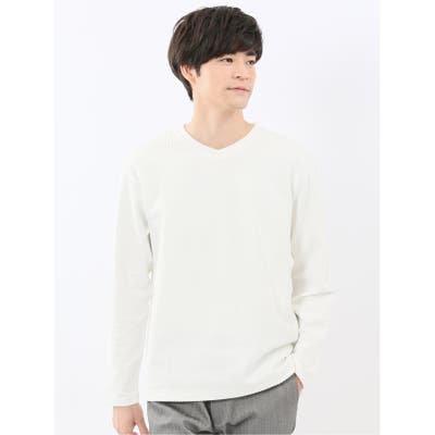シンプル過ぎない存在感のあるVネックの長袖Tシャツです。表面感のあるジャガード柄で着映えするルックスに仕上げています。一枚で着るのはもちろん、ジャケットやシャツ、ジレベストのインナーとしても便利なアイテムです。