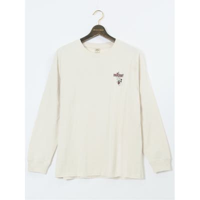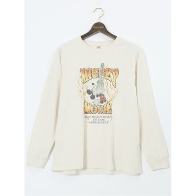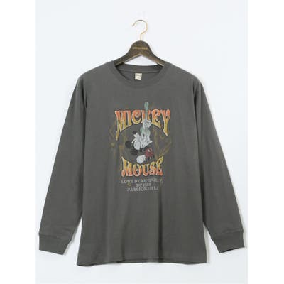 ディズニーの象徴的なキャラクター、ミッキーマウスを大胆にプリントしたクルーネックの長袖Tシャツです。かすれたようなプリントでビンテージ風に仕上げており、古着のような色褪せ感がポイント。衿ぐりと袖口はリブパーツで切り替えています。
