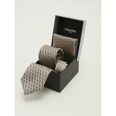 ギフトケースに入ったナロータイ&ポケットチーフセットです。大剣は細かいジオメトリック柄、小剣はレノマロゴで切り替えたデザイン。さりげないラインストーンがお洒落なアクセントになっています。モードな雰囲気が漂うナロータイが、センスの光る衿元を演出してくれます。パッケージケースにもこだわったデザインなので、大切な方の誕生日や記念日のプレゼントとしてもおすすめです。