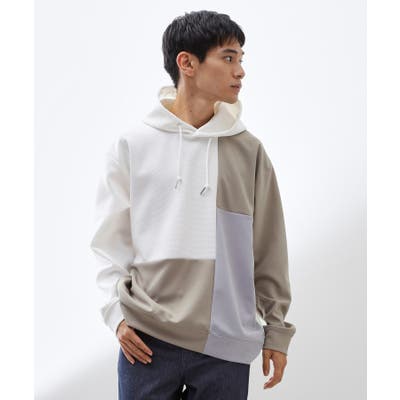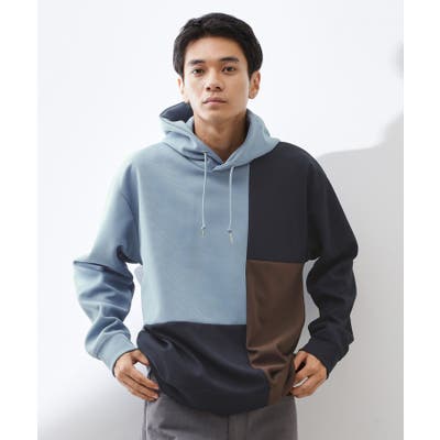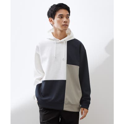 異なるカラーや素材を組み合わせたブロッキングデザインが特徴のパーカ。