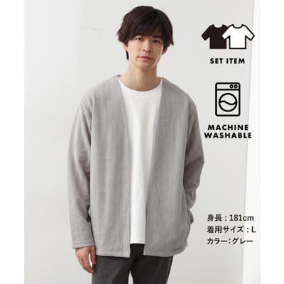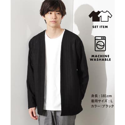 ジャカード素材を使用し立体的な表面感とふっくらとした肌触りが特徴のカーディガンと吸水速乾機能が付いた半袖Tシャツのセットアイテム。