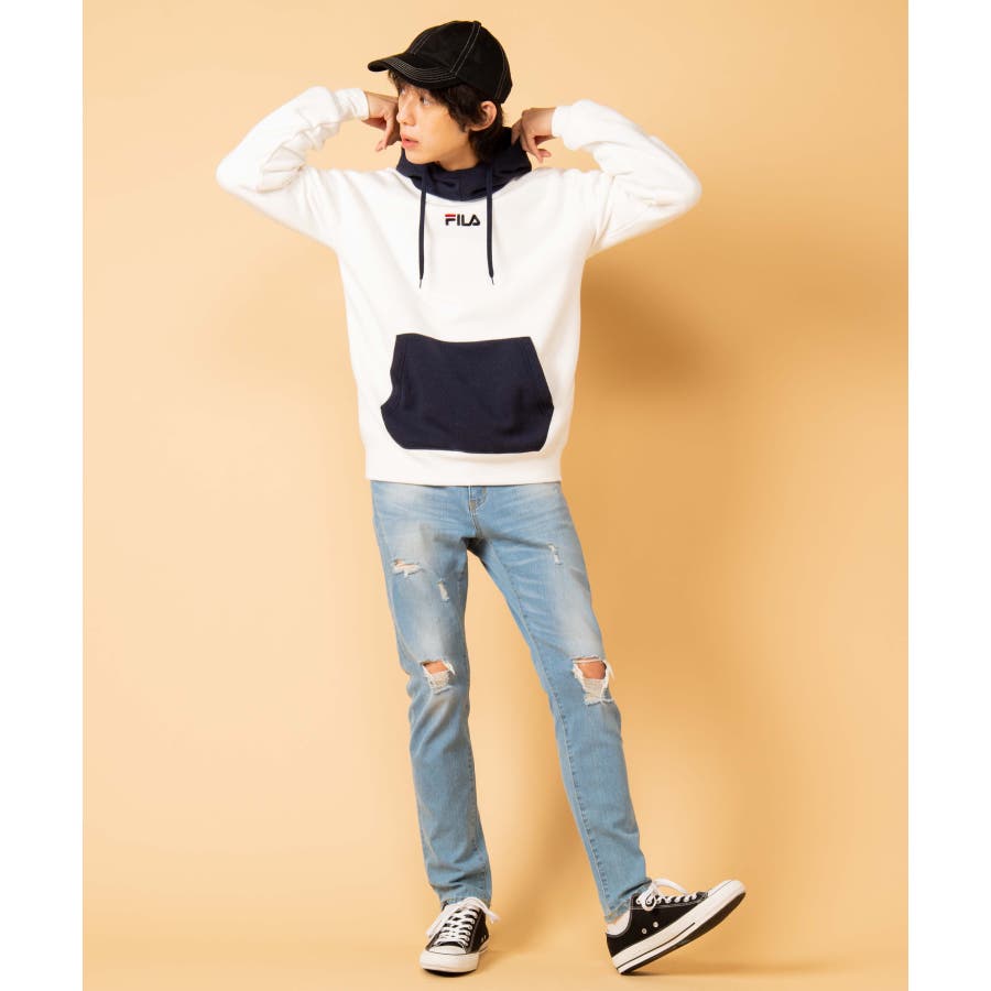 100年以上続く老舗スポーツウェアブランド"FILA"より、こだわりを詰め込んだWEGO別注限定スウェットパーカーフード、カンガルーポケットの配色切り替えとフロントのブランドロゴ刺繍が目を惹く、着るだけでコーディネートの主役になる1着。