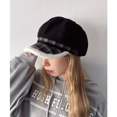 ツバの部分はチェック柄&フェイクファーデザインでこなれ感◎