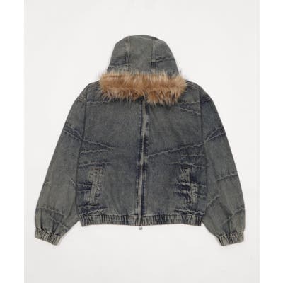 【ストリートムード漂う存在感抜群のファーフードスラッシュデニムブルゾン】