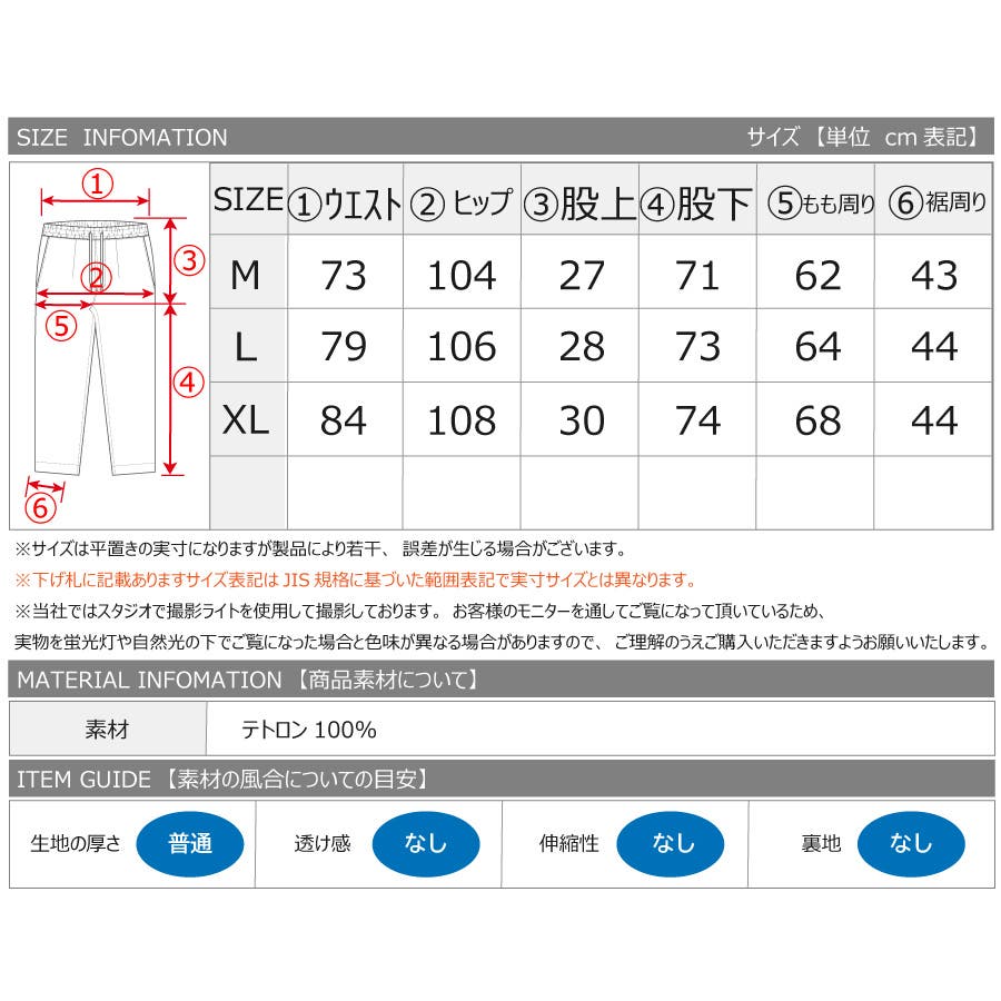 | 【Mサイズ】 ・ウエスト73cm/・ヒップ104cm/・股上27cm ・股下71cm /・もも周り62cm /・すそ周り43cm 【Lサイズ】 ・ウエスト79cm/・ヒップ106cm/・股上28cm ・股下73cm /・もも周り64cm /・すそ周り44cm 【XLサイズ】 ・ウエスト84cm/・ヒップ108cm/・股上30cm ・股下74cm /・もも周り68cm /・すそ周り44cm | ||